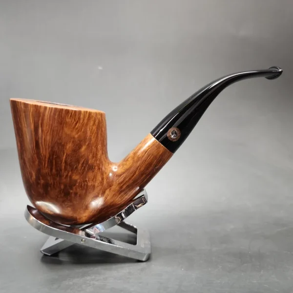 While Mark Tinsky’s contemporary output tends toward set, reproducible shapes and even a standardized catalog, the pipes he (and Curt Rollar) made in earlier decades were more freeform in design. Tinsky was after all, part of the great American freehand movement of the later 20th century, which was significantly inspired by the post-war Danish artisan scene. This particular Tinsky, made a few years after Rollar departed from their American make, is a very nice, large, freehand Dublin. It’s clearly been carved to maximize the flame grain and bird’s-eye patterns in the briar, though it doesn’t abandon conventional shapes wholesale. Curiously, this Tinsky-made American has a reverse threaded tenon that is original to the design.