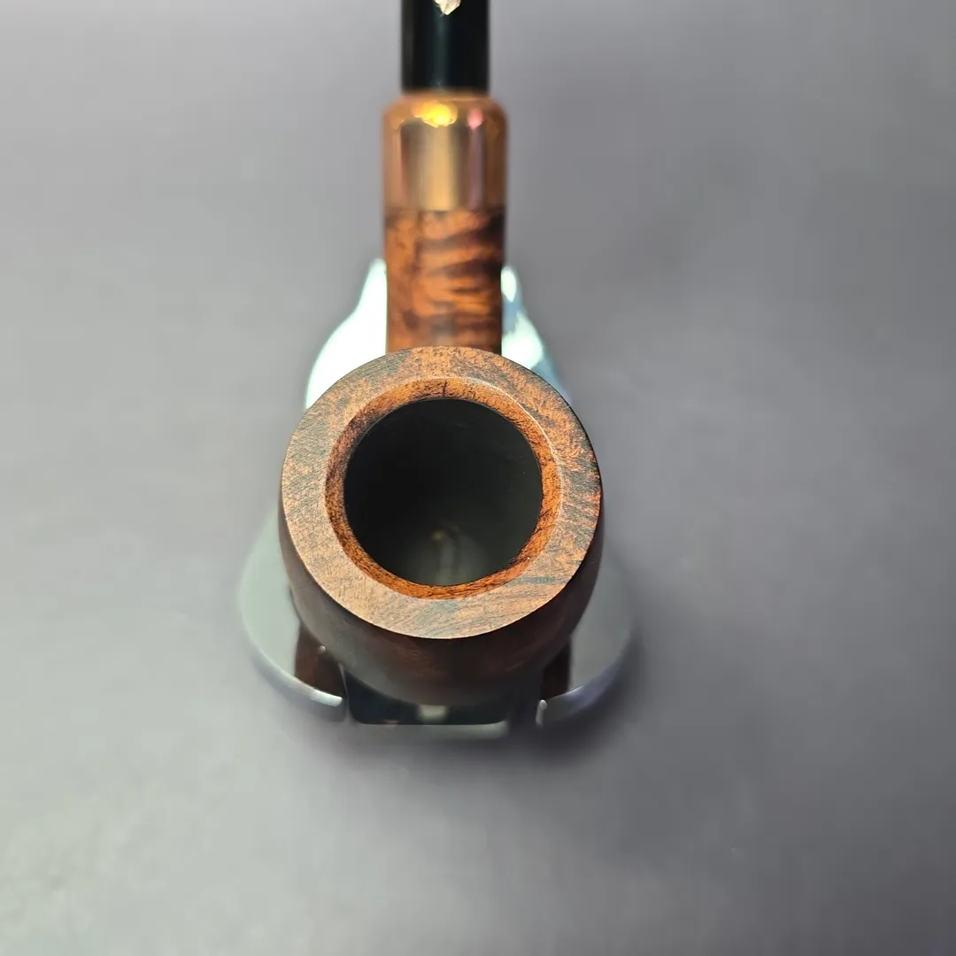 Taking its name from the Danish word for “classic,” the Klassisk line marks a slight departure from the norm when it comes to Stokkebye pipes. Instead of the more modernist designs associated with Stokkebye lines, the Klassisk looks toward the pipes that inspired post-war Danish pipe making in the first place, those being the traditional staples of England and France. This one is a reserved, and indeed classic, bent billiard, dressed in a rich contrast stain and accented with a sleek copper army mount.