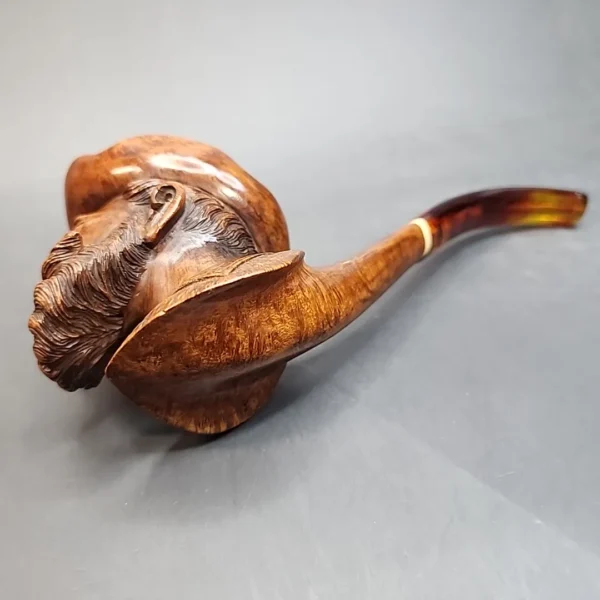 This beautifully carved briar is fairly large at over 7″ in length. The detail is stunning. We’ve seen a lot of briar, and this is the most detailed figural briar pipe we’ve seen.