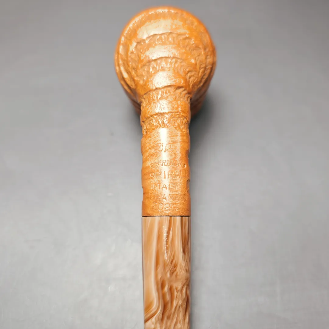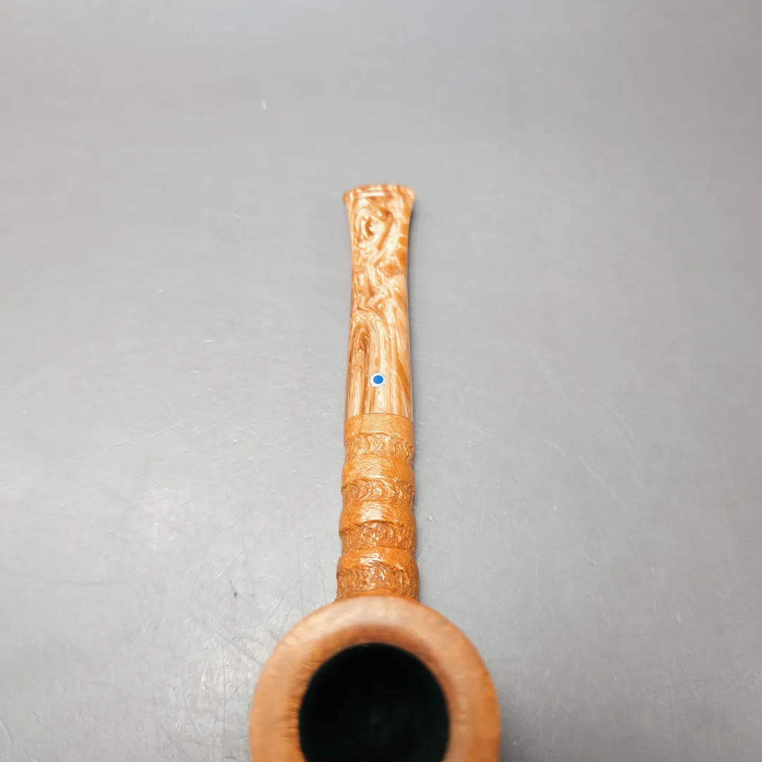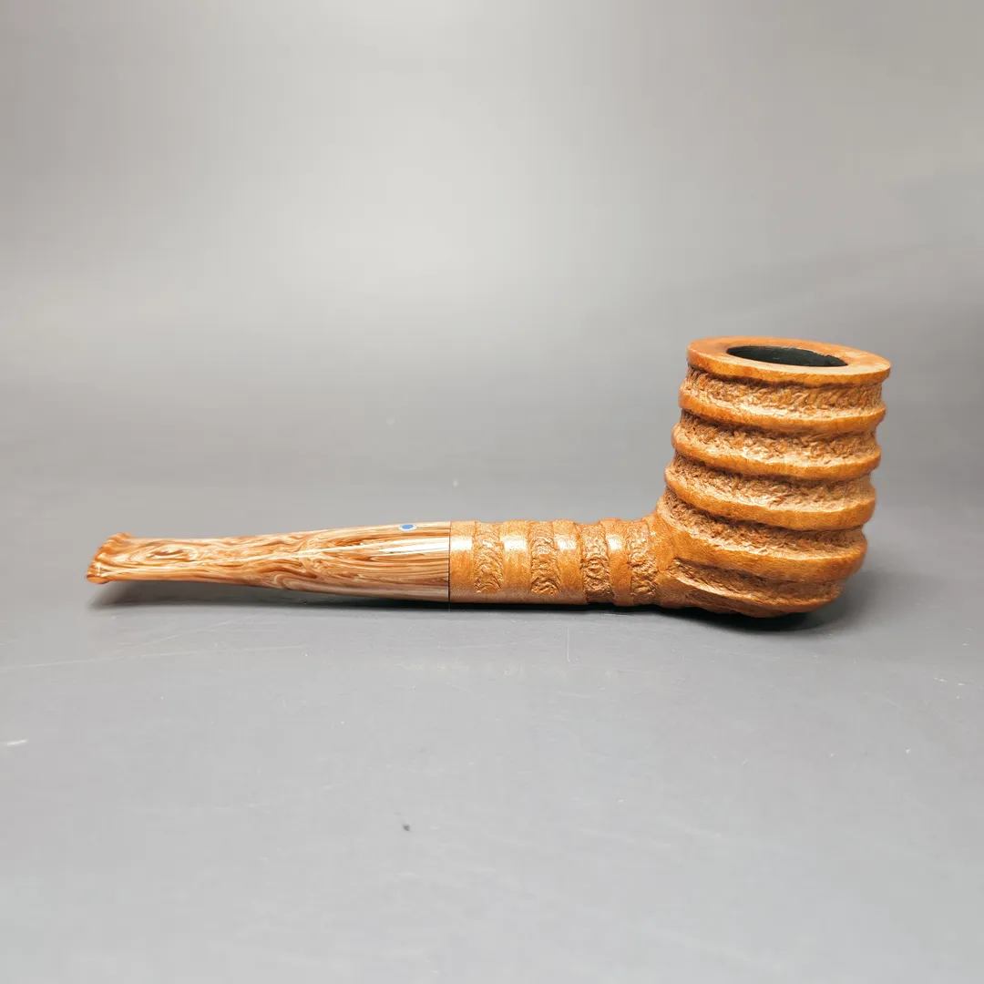 Unlike the majority of Ardor’s pipe series, which have astronomical namesakes, the Spirale is characterized by its deep, spiraling grooves, hewn by hand in the Roveras’ workshop. It is by no means a common series in the Ardor portfolio but, when it does appear, it is certainly welcome. In this instance, the design is modest and light, with the Spirale rustication applied to a simple, sturdy billiard and draped in a minimalistic, tan finish. This pairs well with the pipe’s mouthpiece, cut from Lucite which matches the bowl both in its hues and swirl.