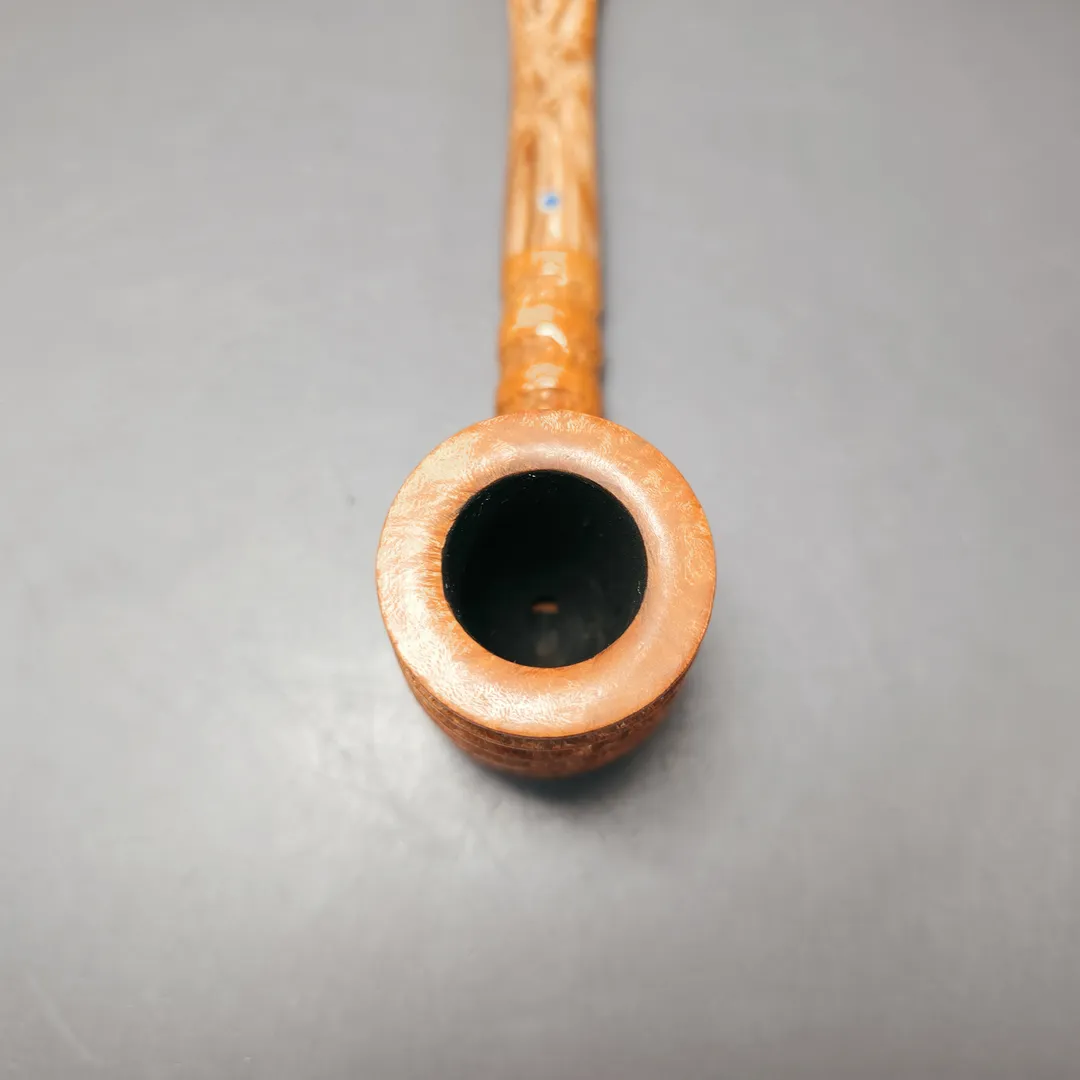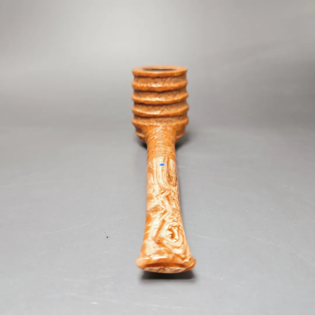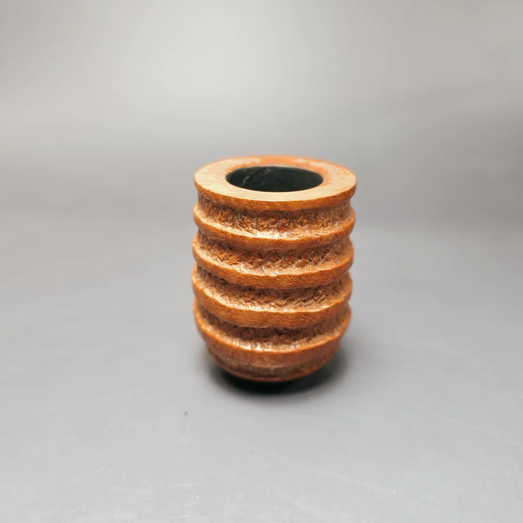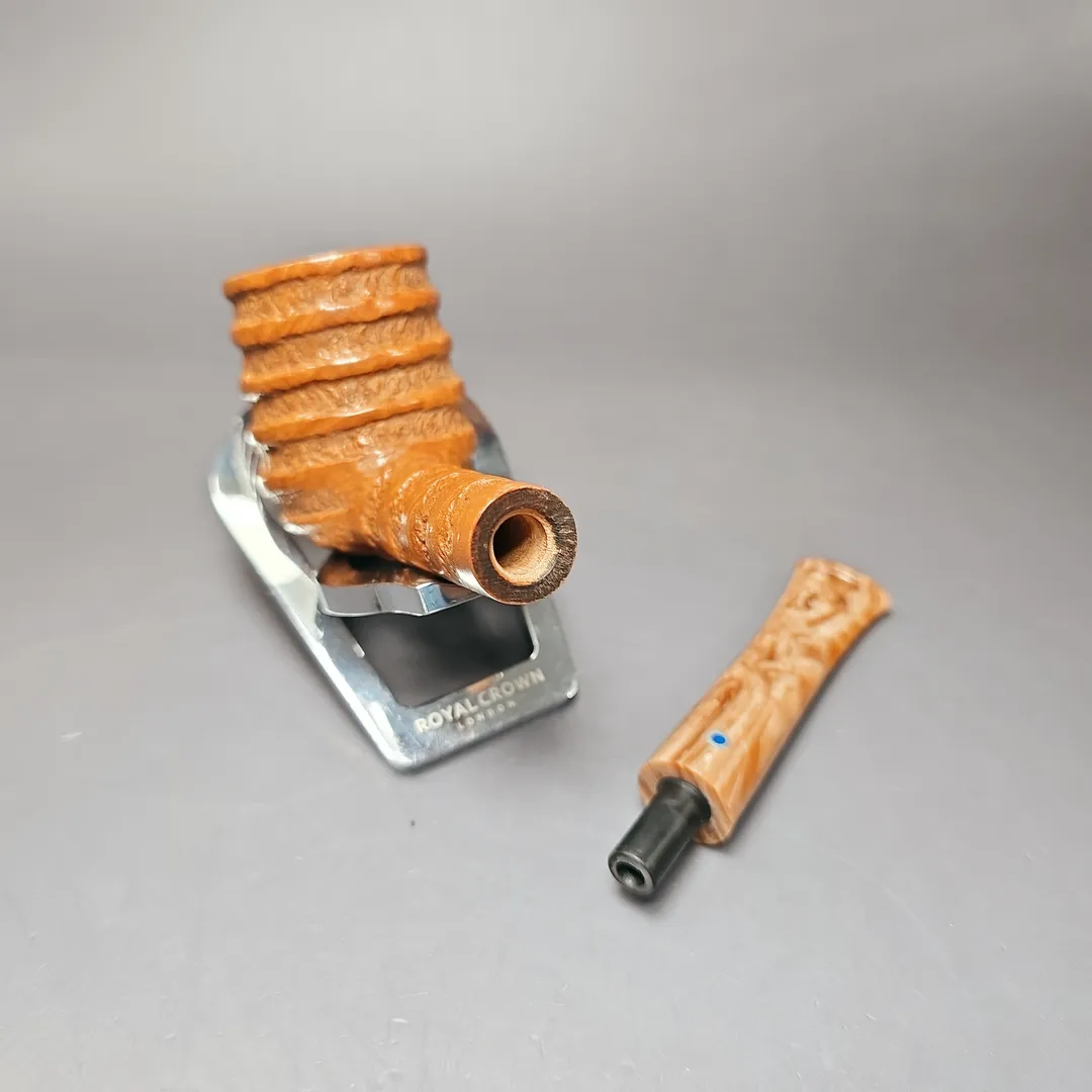 Unlike the majority of Ardor’s pipe series, which have astronomical namesakes, the Spirale is characterized by its deep, spiraling grooves, hewn by hand in the Roveras’ workshop. It is by no means a common series in the Ardor portfolio but, when it does appear, it is certainly welcome. In this instance, the design is modest and light, with the Spirale rustication applied to a simple, sturdy billiard and draped in a minimalistic, tan finish. This pairs well with the pipe’s mouthpiece, cut from Lucite which matches the bowl both in its hues and swirl.