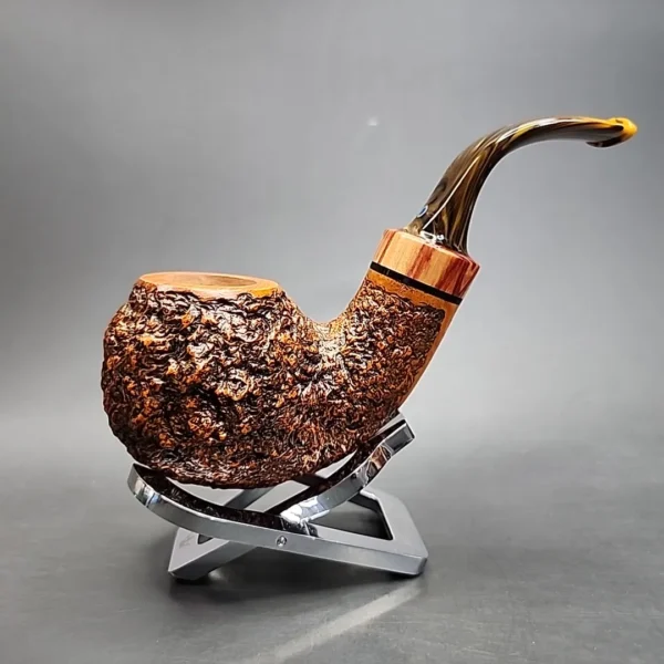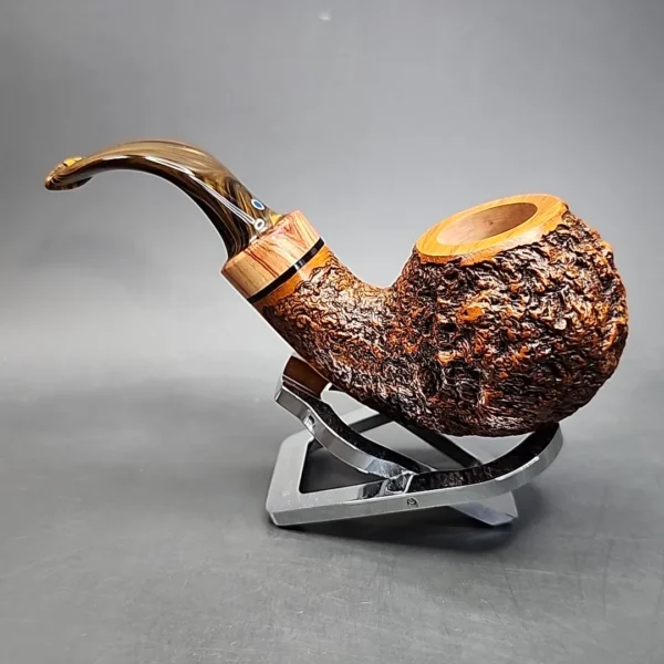 Like many Italian makes, Ardor has a variety of stony, rusticated finishes. Unlike most Italian makes, however, Ardor pipes are more colorful in their choice of stains and the color compositions that these stains feature in. This Urano, for example, combines an ocher-stained pebble-dash rustication with an exotic wood accent (olivewood, I think), as well as a swirling black and amber lucite stem. It’s certainly more bold than many other Italian workshop makes, but it is nonetheless tasteful. The shape is a classic ardor one: the compact, bent cannonball.