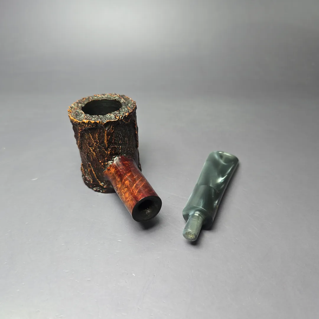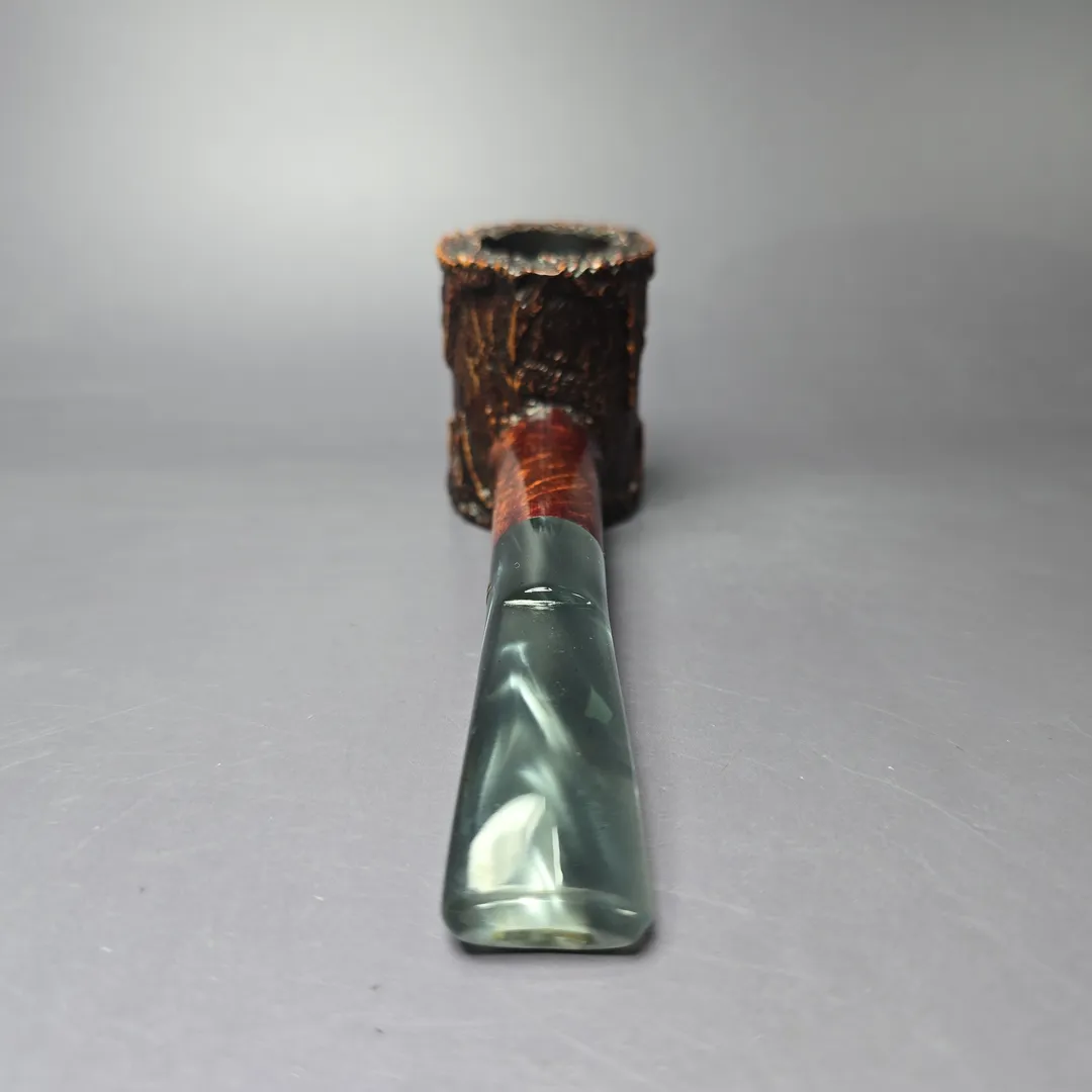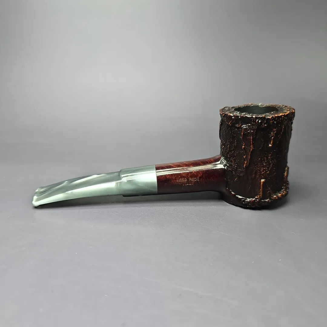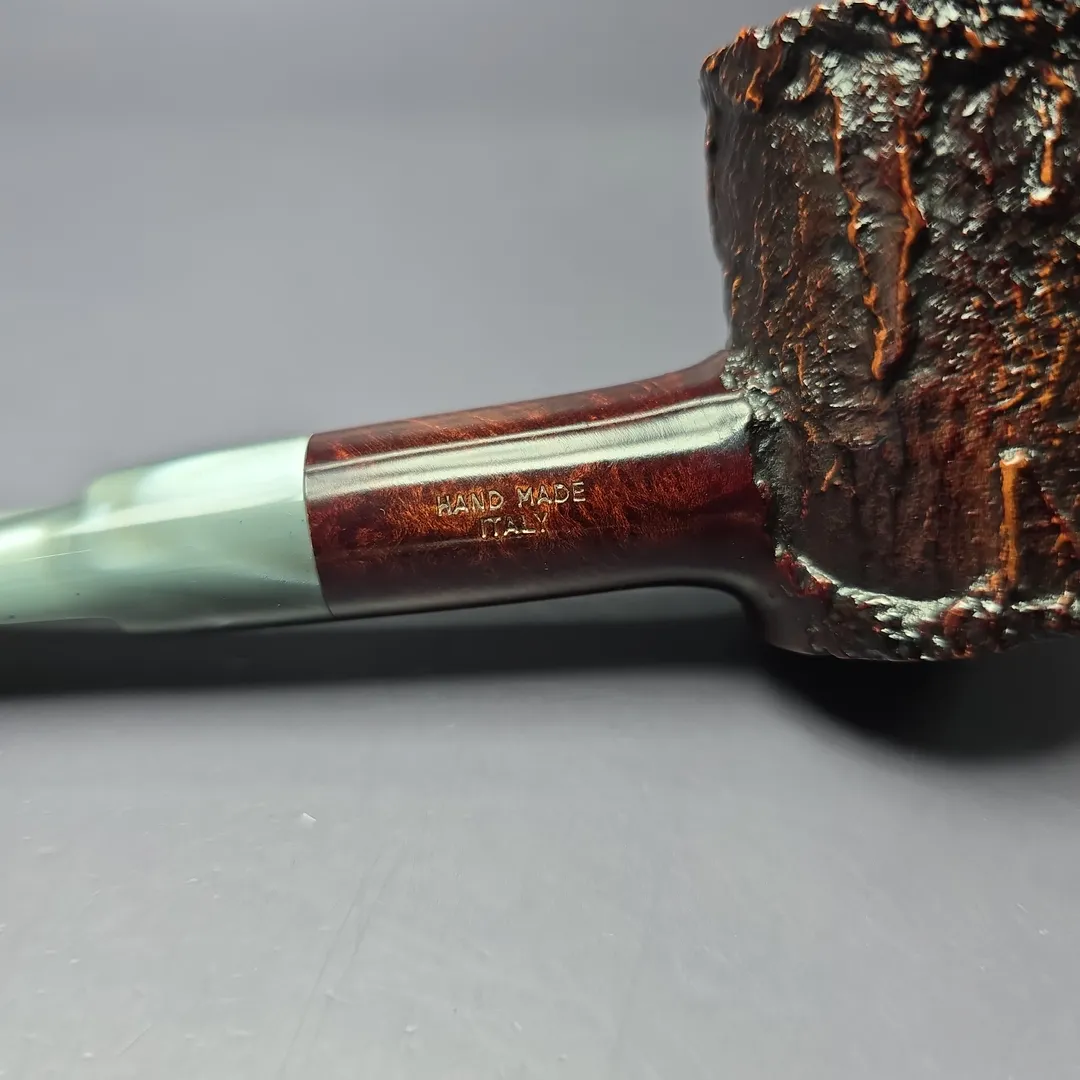 Though figural motifs have been used in pipe carving for centuries, in the context of Italian workshop pipes, so-called “wax drip” finishes can be traced back to Castello and the “Epoca,” an early line that was removed from regular production in the 1960s. The Epoca was reborn, one might say, at Caminetto, under the direction of two former Castello craftsmen, Guiseppe Ascorti and Luigi Radice, whose own rendition was named the “New Dear.” After Caminetto disbanded in the 1970s (and prior to being restarted in the 1980s), Luigi Radice and Guiseppe Ascorti started their own workshops once again, this time separately. Each took the wax-drip motif and renewed it once more: Radice with his “Underwood”; and Ascorti with his own “New Dear.” The latter was not just more faithful in name to the old Caminetto version, but was arguably closest to it, adhering to the same rustic and naturalistic design approach for the new New Dear. This particular pipe is one such example and, as Ascorti pipes tended to be in the workshop’s first decades, it also follows other design conventions first established at Caminetto, including its muscular aesthetic and signature asymmetric saddle stem, cut from a slightly colorful Lucite. While the Ascortis (now a family-run workshop) still craft New Dear pipes, to my knowledge it has been many years since they did so in the old Caminetto style, like this one, making it a nice little rarity to come across.