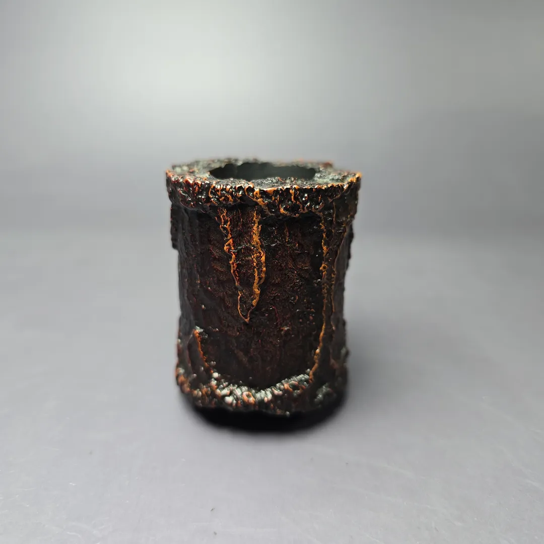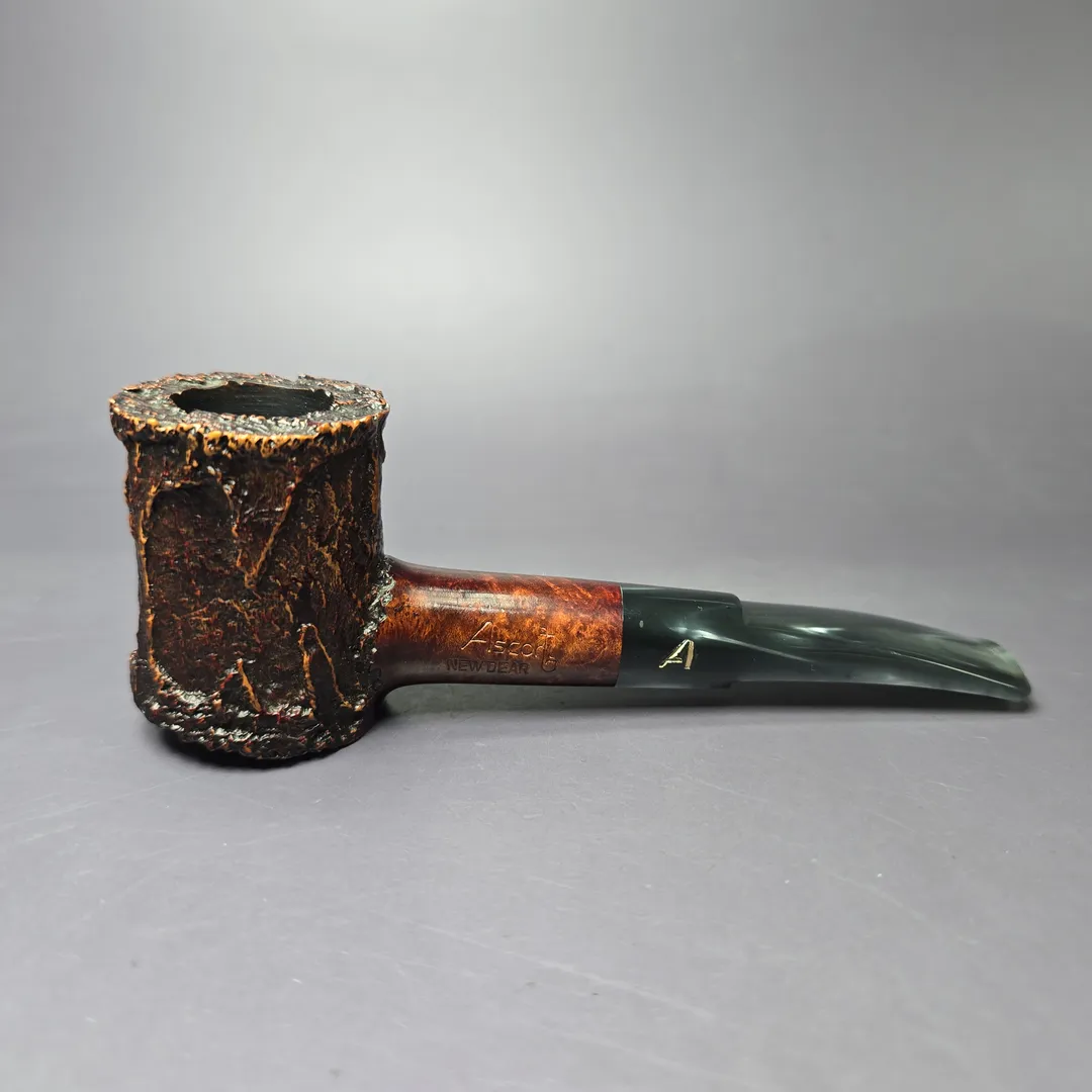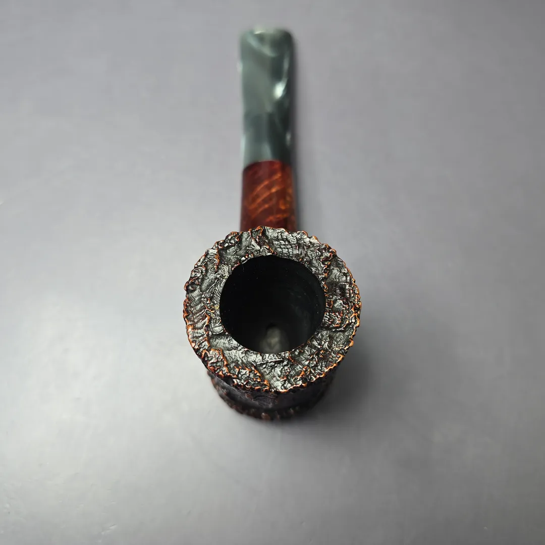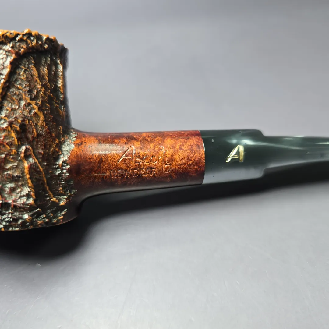 Though figural motifs have been used in pipe carving for centuries, in the context of Italian workshop pipes, so-called “wax drip” finishes can be traced back to Castello and the “Epoca,” an early line that was removed from regular production in the 1960s. The Epoca was reborn, one might say, at Caminetto, under the direction of two former Castello craftsmen, Guiseppe Ascorti and Luigi Radice, whose own rendition was named the “New Dear.” After Caminetto disbanded in the 1970s (and prior to being restarted in the 1980s), Luigi Radice and Guiseppe Ascorti started their own workshops once again, this time separately. Each took the wax-drip motif and renewed it once more: Radice with his “Underwood”; and Ascorti with his own “New Dear.” The latter was not just more faithful in name to the old Caminetto version, but was arguably closest to it, adhering to the same rustic and naturalistic design approach for the new New Dear. This particular pipe is one such example and, as Ascorti pipes tended to be in the workshop’s first decades, it also follows other design conventions first established at Caminetto, including its muscular aesthetic and signature asymmetric saddle stem, cut from a slightly colorful Lucite. While the Ascortis (now a family-run workshop) still craft New Dear pipes, to my knowledge it has been many years since they did so in the old Caminetto style, like this one, making it a nice little rarity to come across.