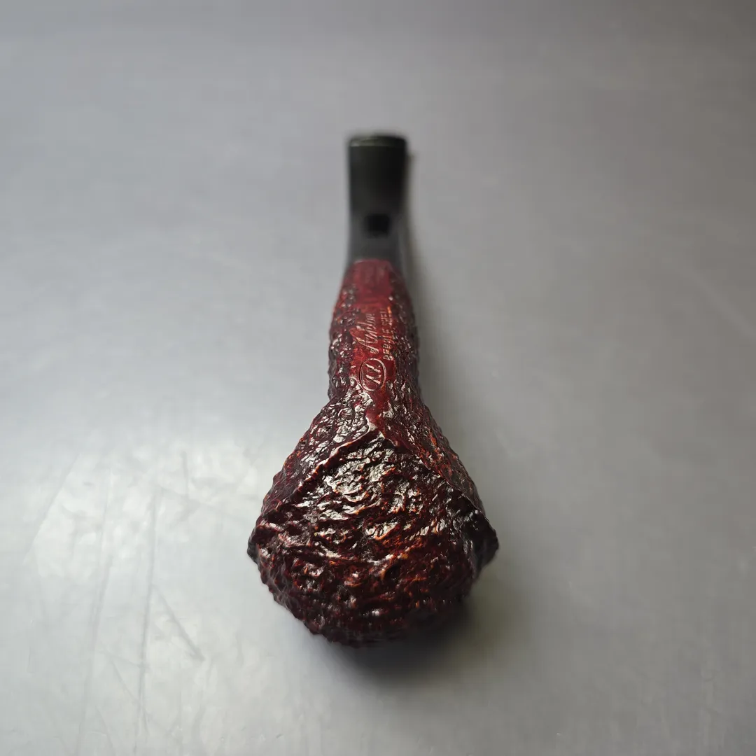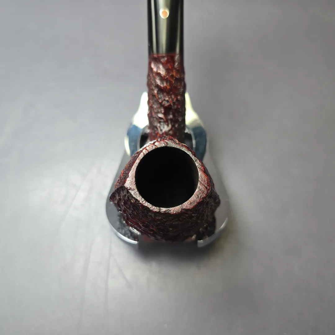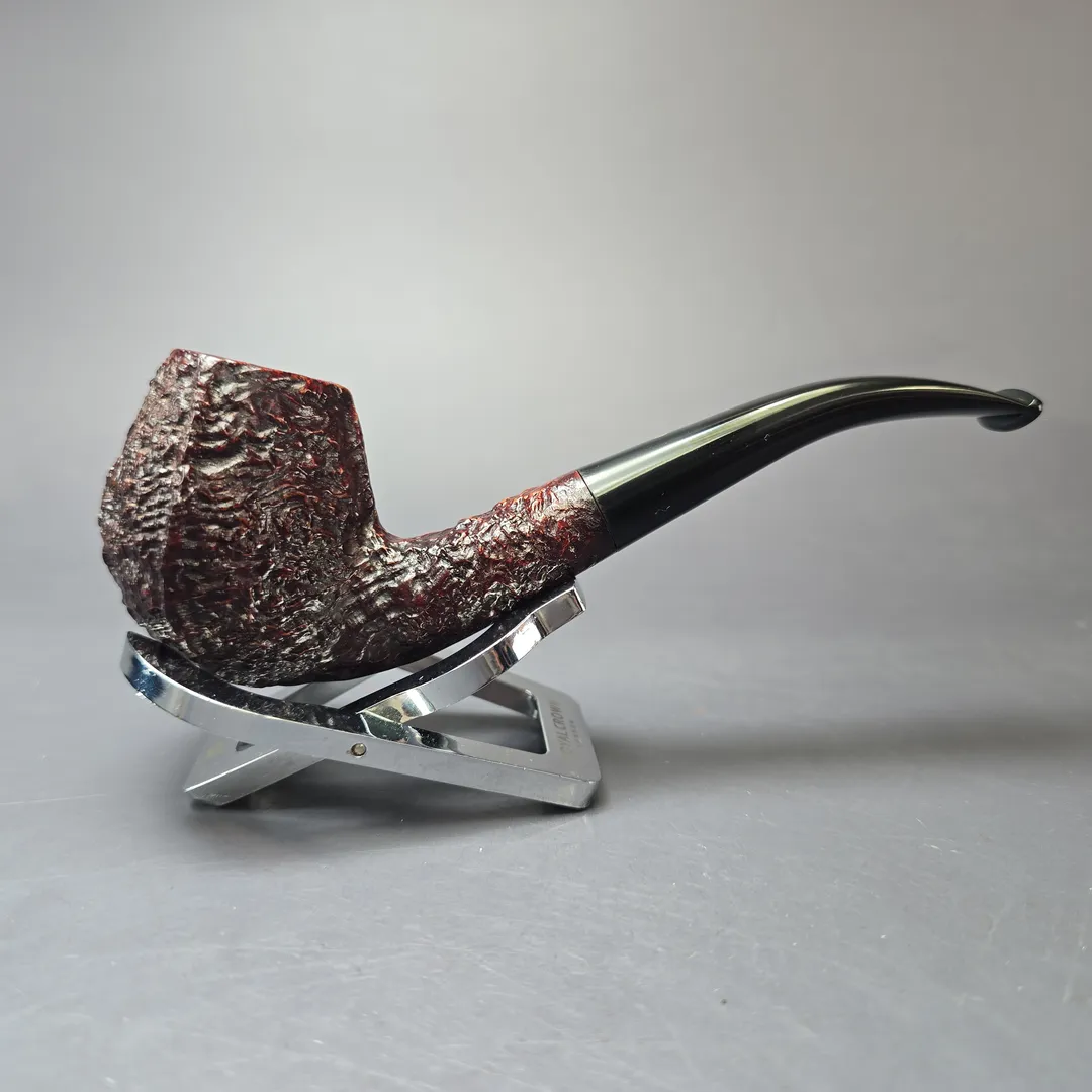Ashton’s Pebble Shell is unique among the workshop’s finishes during the Bill Taylor years, though one that was entirely consonant with Taylor’s approach to pipe making. He was, after all, was a steadfast innovator, creating a number of patented materials (such as Ashtonite for stems) and techniques (such as his oil curing and sandblasting process) that he employed in the production of Ashton pipes. What made the Pebble Shell different was that, unlike any other finish offered by Ashton at the time, it involved what could reasonably be called “rustication.” But it wasn’t quite a rusticated finish per se. Using a process of steaming turned stummels, picking away parts of their now-softened briar, and then sandblasting what was left of the exterior, Taylor produced a pipe that was even more tactile and craggy than Ashton’s standard sandblasts—which he, of course, patented. The Pebble Shell was, therefore, something of a rusticated and sandblasted hybrid finish, a rarity inside and outside of the Ashton workshop. Some Pebble Shells were given a very light finish, just as the Old Church series was, whereas others—like this one—wore the burgundy top-coat otherwise found on the Pebble Grain. This one is especially interesting, having been turned in a ridged, soft-paneled form that I would assume was modeled on old Barling and Dunhill Quaint shapes, though which also bears a striking similarity to Danish cobra and sphinx shapes. While Taylor’s Ashton (this pipe being from the first decade of his tenure at the helm) did occasionally experiment with Danish-style “freehand” shapes, as well as “quaint” shapes closer to the English tradition, designs such as this one were certainly not commonplace.