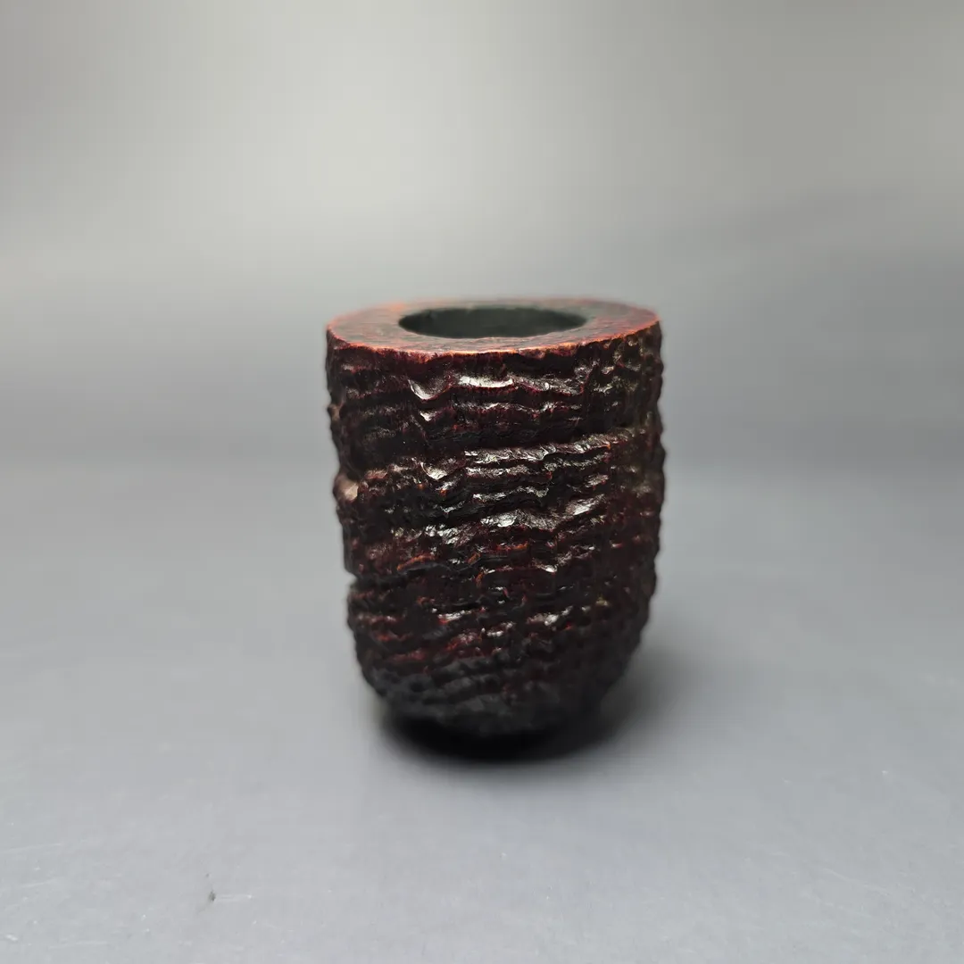 The “Pebble Grain” was Bill Taylor’s answer to Dunhill’s Shell Briar. This would already be easily deduced from its craggy, dark burgundy sandblast, but there’s another connection that brought the two finishes together. Like the early Dunhill Shell Briar, Ashton pipes were, before being finished, oil cured using a patented method of Taylor’s own invention. This was crucial for achieving the kinds of craggy sandblasts that early Dunhill pipes were known for, and which Ashton pipes revived. This one, from the first decade of Ashton pipes and, as such, the make’s ascent under Bill Taylor, is one of the closest I’ve yet seen to the “Platonic form” of an early patent Dunhill. The sandblasting is so thorough and rich in texture that I’m left to wonder precisely how many times its stummel went through the blasting cabinet. In addition to this deep relief, the patterns it implicates are arranged in good, consistent layers of ring grain—which Taylor, as is well known, was a master at drawing out of the briar.