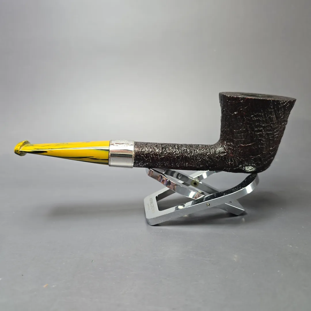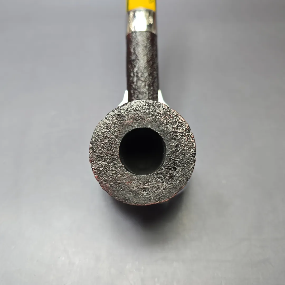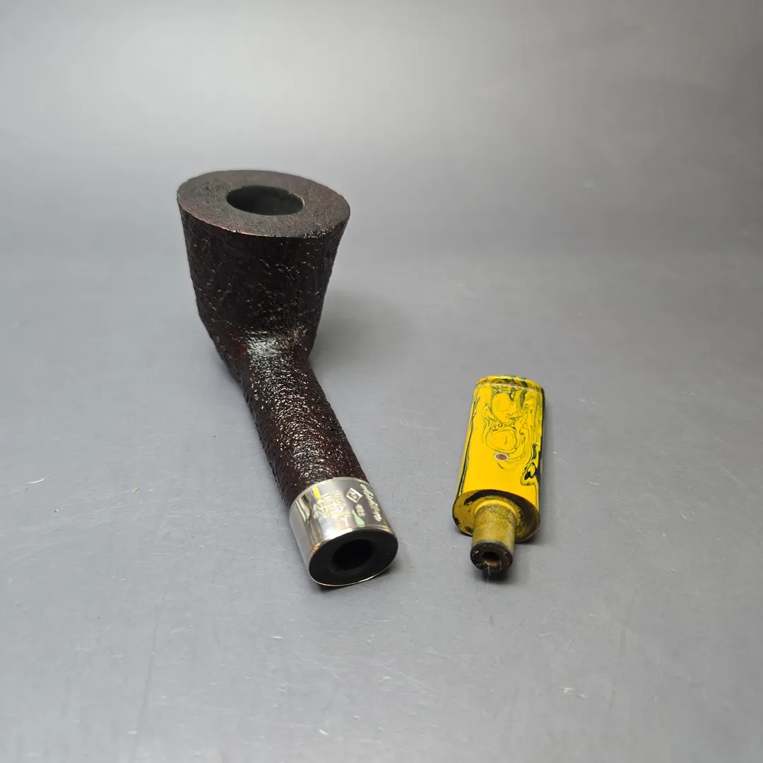 Ashton’s Brindle series tends to follow a similar design philosophy to the workshop’s Pebble Grain, with a key difference being the style of the mouthpiece. Like the Pebble Grain (itself a challenger to the old Dunhill Shell Briar), the Brindle features a craggy, burgundy sandblast finish, with just a tad more color than the former by way of a secret contrast finishing method. The most striking difference, however, is typically found in the Brindle’s namesake, that being the material used for its mouthpieces. “Brindle” is often used interchangeably with “Cumberland,” as both are multi-colored—brindled—materials formed through the layering of different resins during casting. This Brindle Dublin from 2021, for example, combines the stout and sturdy shaping and crisp, ring grain sandblast finish that have been hallmarks of Ashton pipes since their inception, with the one of the near-psychedelic, brindled mouthpieces associated with Jimmy Craig’s tenure at the helm. The pipe also features one of Craig’s own, engraved sterling silver collars. On a side note: Jimmy Craig left Dunhill around the same time as Les Wood, of Ferndown, and the two originally planned to create an independent silversmithing partnership under the name “Leslie & James Silverware,” with the maker’s mark “L&JS.” Of course, the two ultimately went their separate ways, though it’s an interesting aspect to Ashton history and an indication as to the caliber of Craig’s work.