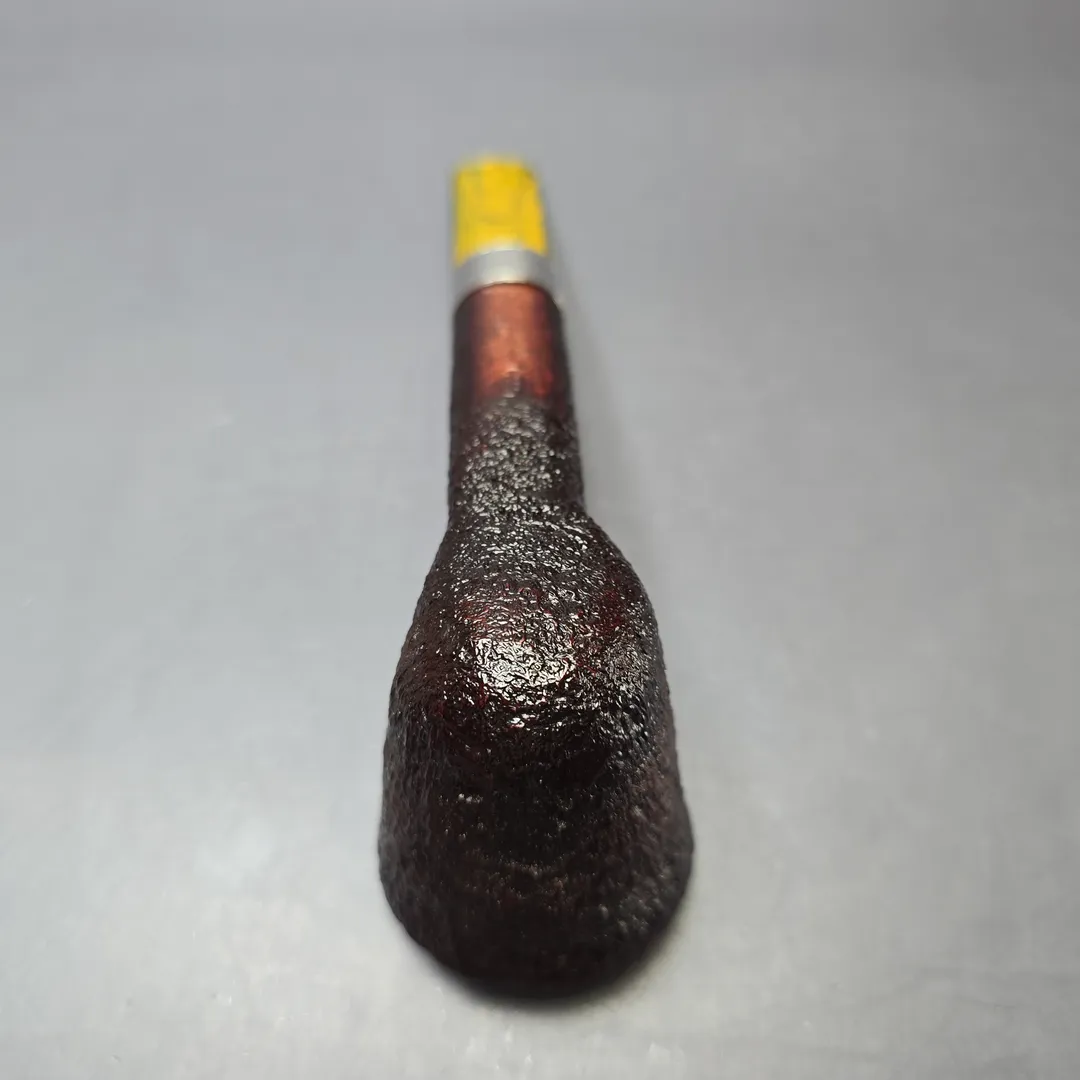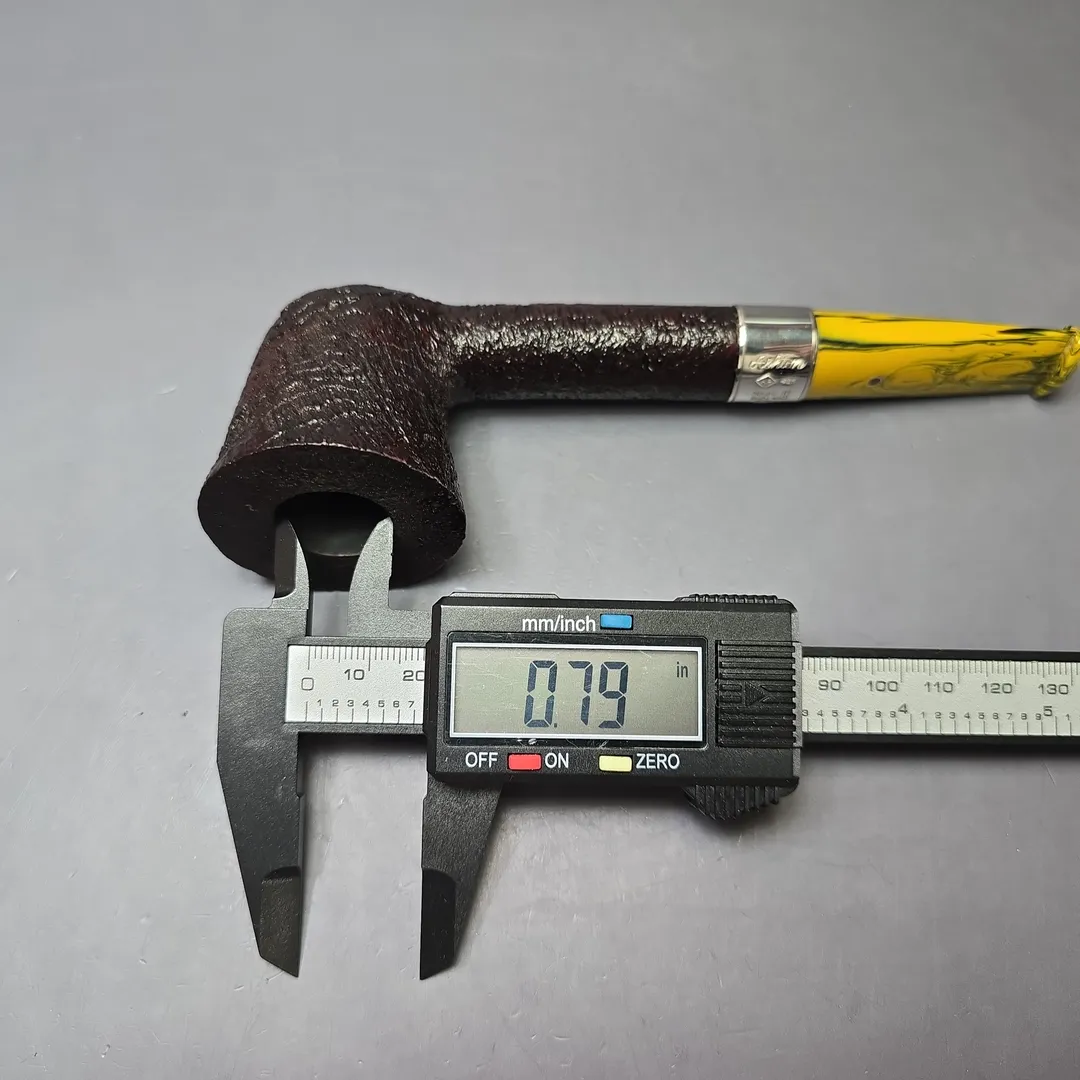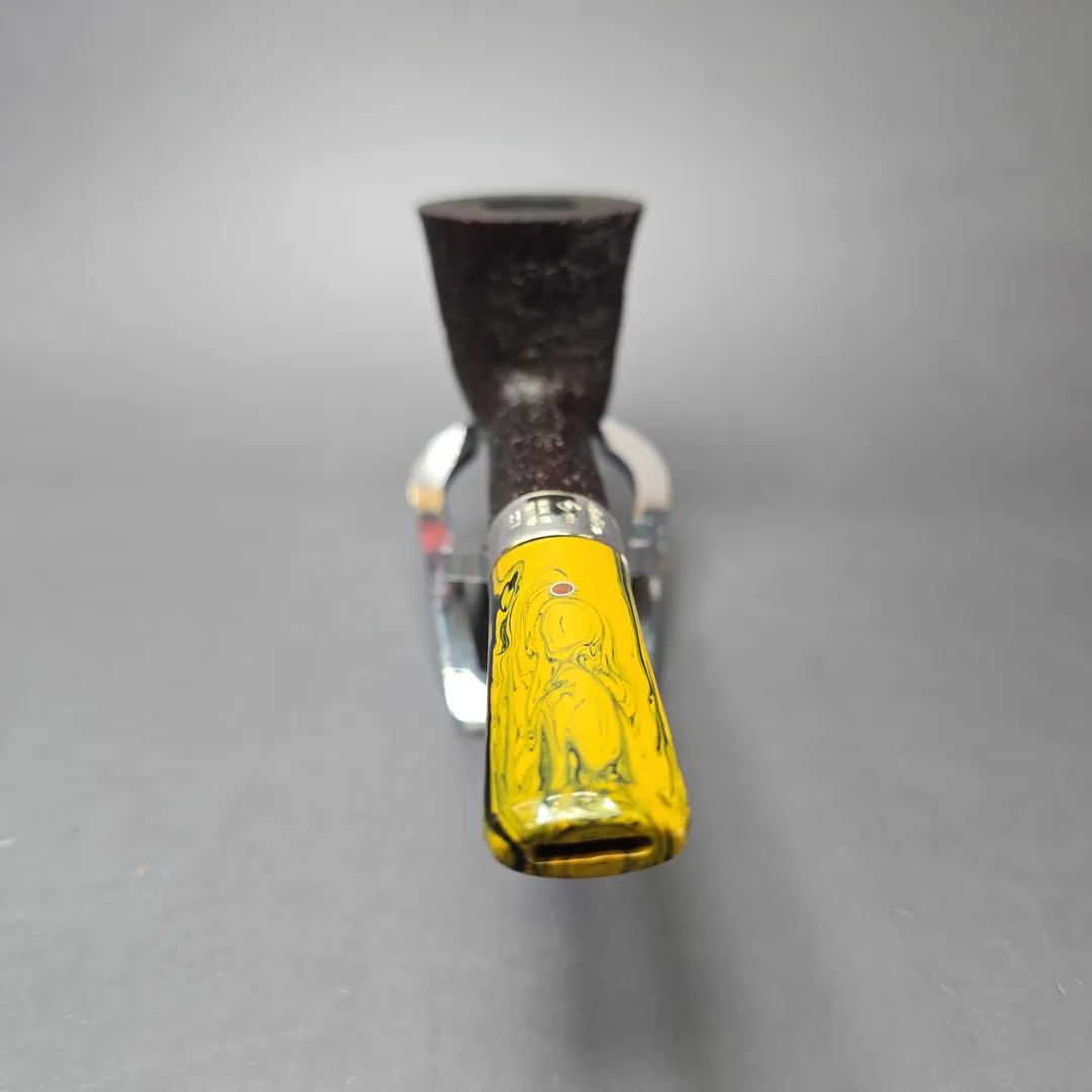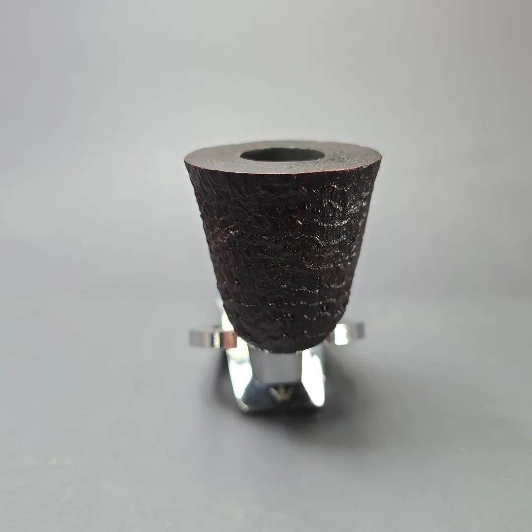 Ashton’s Brindle series tends to follow a similar design philosophy to the workshop’s Pebble Grain, with a key difference being the style of the mouthpiece. Like the Pebble Grain (itself a challenger to the old Dunhill Shell Briar), the Brindle features a craggy, burgundy sandblast finish, with just a tad more color than the former by way of a secret contrast finishing method. The most striking difference, however, is typically found in the Brindle’s namesake, that being the material used for its mouthpieces. “Brindle” is often used interchangeably with “Cumberland,” as both are multi-colored—brindled—materials formed through the layering of different resins during casting. This Brindle Dublin from 2021, for example, combines the stout and sturdy shaping and crisp, ring grain sandblast finish that have been hallmarks of Ashton pipes since their inception, with the one of the near-psychedelic, brindled mouthpieces associated with Jimmy Craig’s tenure at the helm. The pipe also features one of Craig’s own, engraved sterling silver collars. On a side note: Jimmy Craig left Dunhill around the same time as Les Wood, of Ferndown, and the two originally planned to create an independent silversmithing partnership under the name “Leslie & James Silverware,” with the maker’s mark “L&JS.” Of course, the two ultimately went their separate ways, though it’s an interesting aspect to Ashton history and an indication as to the caliber of Craig’s work.