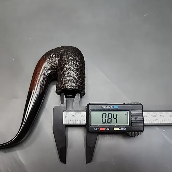 The Oom Paul might just be the ultimate ‘sittin’ and sippin’ pipe. This one is no exception; the bowl is tall and deep, promising long, relaxing smokes, and the shape is easy handle, whether hanging from the one’s jaw, or tucked away between one’s fingers. As this is a rusticated pipe, with a finish not unlike Ferndown’s ‘Bark,’ or the similar one used by Barry and Ken at James Upshall, I would have to think that it is hand-made by one of the two makes.