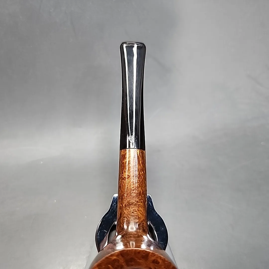 This is an impressive pipe, even for an Astleys. While the shape is an eminently traditional straight pot, the carving and finishing of the pipe as displayed here is nothing less than masterful. First, the grain is spectacular, showing off a consistent, tight straight grain around the bowl and shimmering bird’s-eye patterns on the rim. Second, the brown sugar stain, reminiscent of the famed golden contrast, emphasizes the grain patterns underneath perfectly. Finally, the pipe is nicely light, at 40 grams, making it a reasonable clencher for veteran smokers. So, who made it? It’s similar to Dunhill’s ’06’ straight pot, but I’ve a feeling that Dunhill would have kept a pipe like this for themselves and sold it as a Dead Root (and for hundreds of dollars). It’s more likely to be an Upshall or a Ferndown product, then. Definitely hand-made.