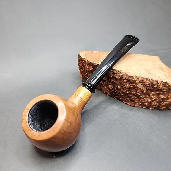 This particular Atin pipe, a prince, shows some subtle Danish influence while also maintaining much of the shape’s traditional form. It is a classic design, light in weight and perfectly suited for clenching, but it also has a few extra elements that set it apart from others: the shank is capped with a ring of wood from the Alborz mountain range, just south of the Caspian sea, and the vulcanite stem is flared at its base. These extra bells and whistles are subtle and elegant, and work well with the pipe’s light, natural blonde finish.