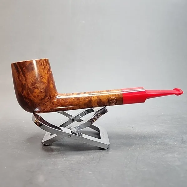 This is a very traditional pipe from Atin, though with a little something that makes it quite special. It is a classic lovat, with a striking mix of natural bird’s-eye and cross grain around the bowl. The stem is what makes this pipe truly unique, however. While it may look like the standard acrylic used on many pipes, it is actually vintage Galalith, otherwise known as Erinoid. Galalith was a synthetic material produced at the turn of the 20th century, somewhat like Bakelite. The appeal of Galalith, however, in addition to its heat resistant properties, was that, when polished, it took on a sheen comparable to gemstones or ivory. As can be seen, this particular vintage Galalith has a beryl red hue, which offers a striking complement to the stummel’s fiery brown stain.