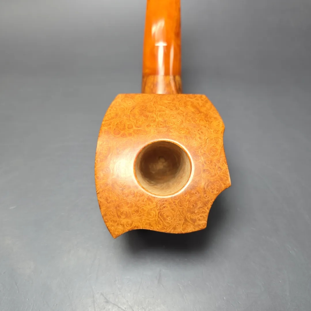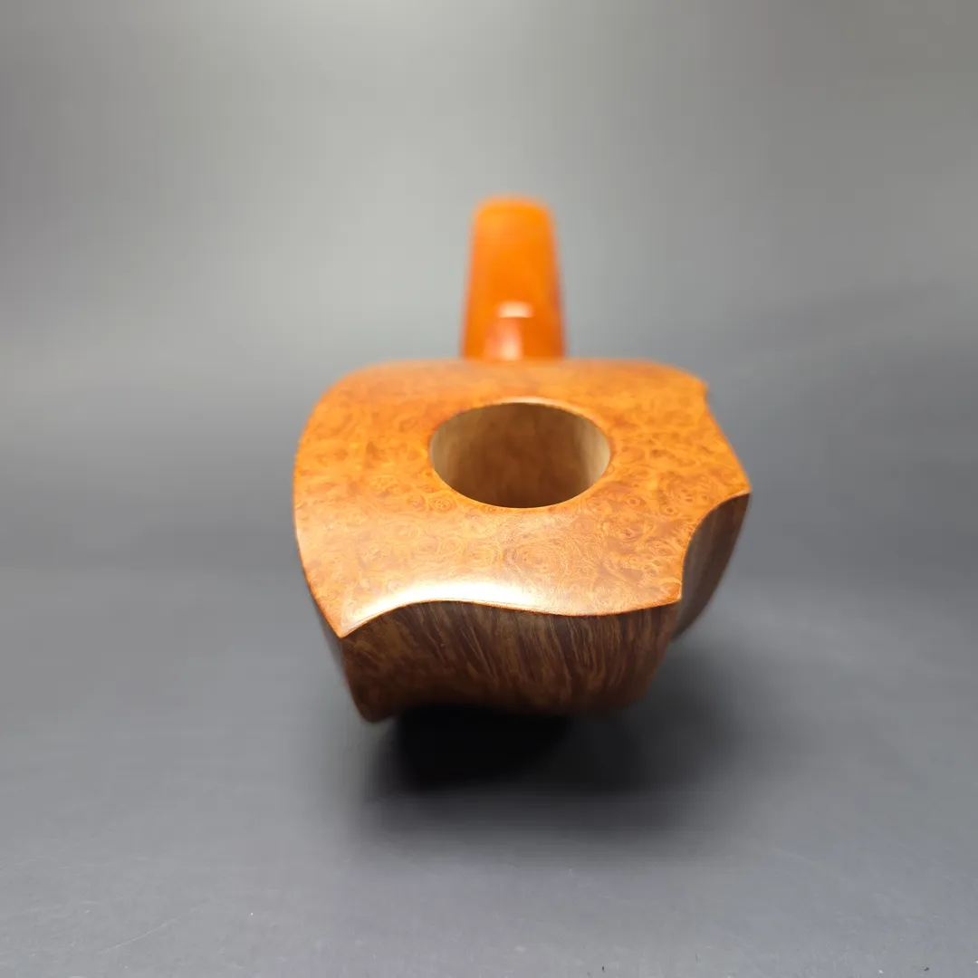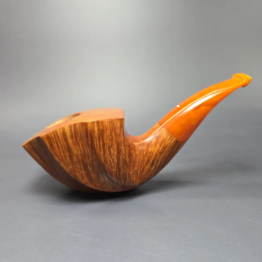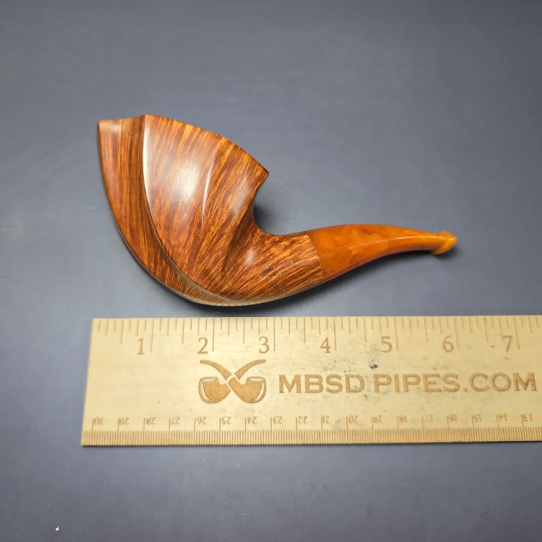 Baldo Baldi was not only skilled with briar and Lucite. For a select few of his works, he also applied himself to the careful carving of cultivated amber. One might say that he stood astride the centuries, having strong affinities with both the pioneering briar and meerschaum artisans of the 1800s as well as those in the post-war era. This pipe combines the flowing, rippling forms of Danish and Italian freehand scene, for example, with a bowl that moves wherever the briar takes it, with a mouthpiece cut from the aforementioned amber, evoking the upmarket 19th century pipes of CPF or WDC.