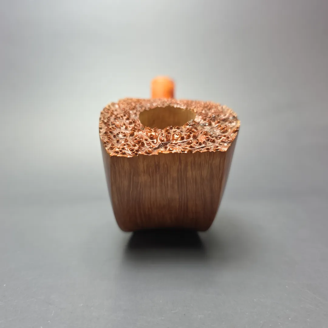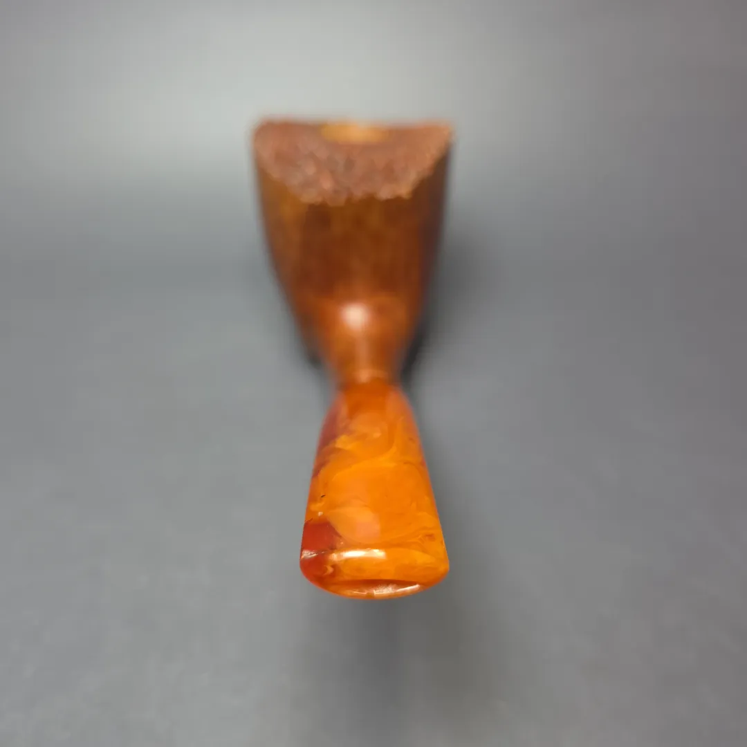 Baldo Baldi was not only skilled with briar and Lucite. For a select few of his works, he also applied himself to the careful carving of cultivated amber. One might say that he stood astride the centuries, having strong affinities with both the pioneering briar and meerschaum artisans of the 1800s as well as those in the post-war era. In the case of this one, even among Baldi’s work, it’s difficult to think of a pipe more deserving of such a luxurious supplement. Taking the form of a exceedingly large, yet surprisingly supple paneled Dublin, the bowl is absolutely covered in minute, “angel hair” striations of straight grain, with its prickly crown of live plateaux edge testifying to just how tightly organized that grain is. As something of a “cherry on top,” the pipe is a sturdy sitter, making for a mighty fine, eye-catching addition to one’s desk or mantlepiece when not in use.