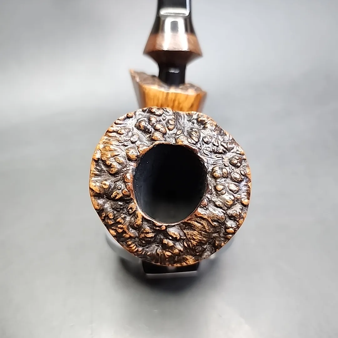 Speaking of Åge Bogelund, this Bari looks to be one of his. The split stem design seen here, with a chunk of briar wedged between the ebonite, was something of a signature of his, and can be seen frequently in his solo output. It’s certainly a high-grade freehand, making excellent use of straight grain briar patterns and plateau in addition to the stem’s distinct addition to the design.