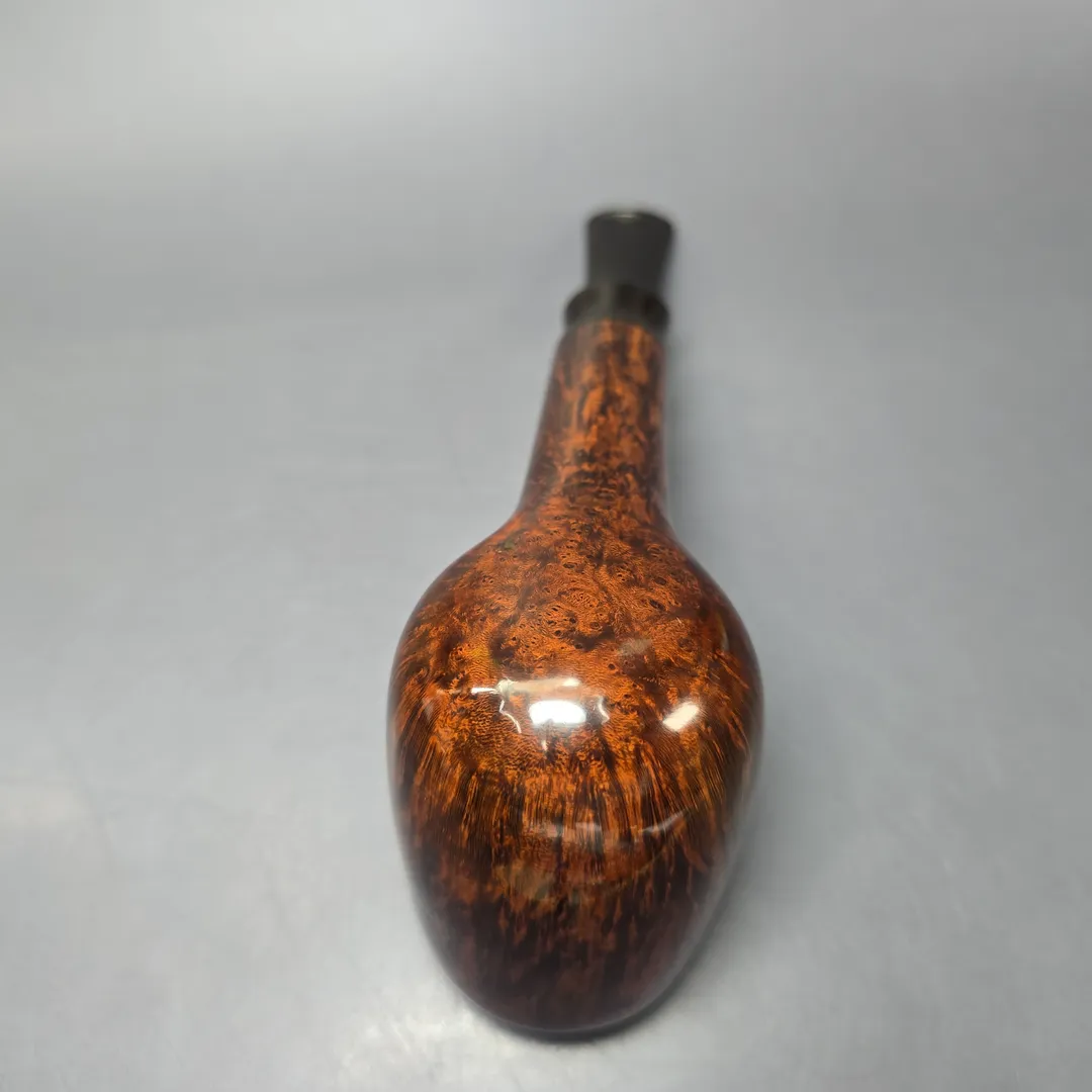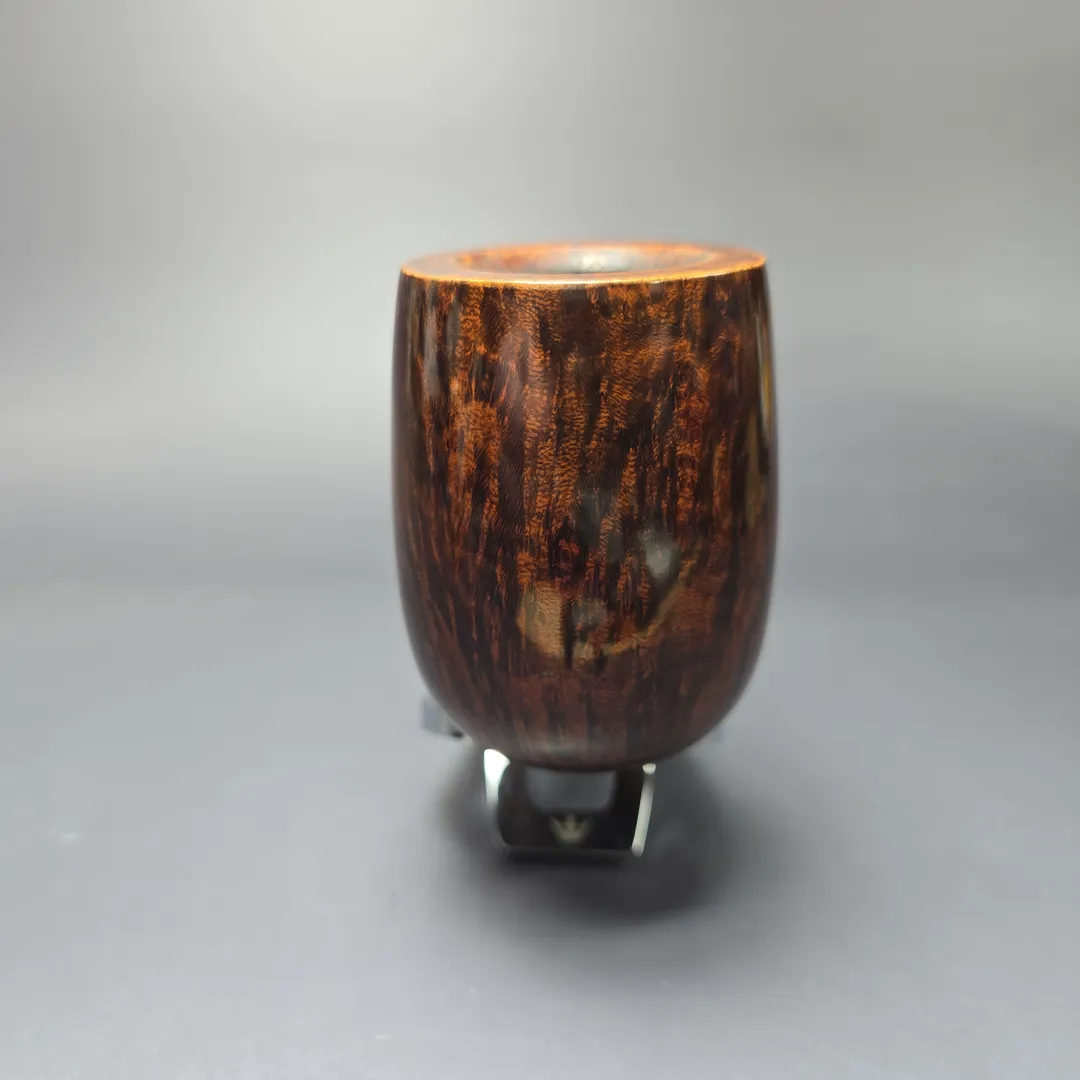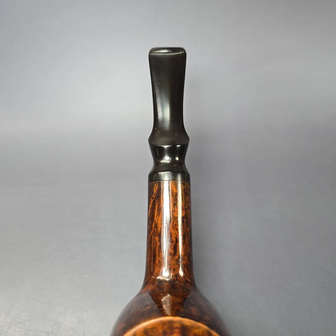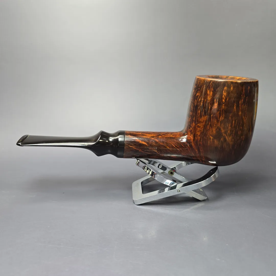 In its infancy, the so-called “Danish style” of pipe making owed its greatest debt to England. Everyone wanted “English” pipes, so much so that Poul Nielsen took on the name Stanwell because it sounded more English than his own, very Danish, surname. Times change, of course, and soon a genuinely “Danish” style emerged that would rival even the most celebrated Anglo-French makes in sheer demand. But not all of the ensuing pipes from the great Danish makes eschewed the Anglo-French tradition—at least, not wholeheartedly. In the case of this Bari, there’s certainly a Danish aspect to it, especially when it comes to the pipe’s distinctive saddle mouthpiece, but it also strikes as essentially being in the vein of the Anglo-French “house pipe.” In other words, it is a billiard whose proportions have been vastly increased so as to remain at one’s side, without need for refill, for an entire afternoon, and perhaps even the evening that follows if smoked at a relaxed pace. Even among the Danish artisans of the 1970s and onward, such as Former, one does find a notable fondness for such designs. Based on the shaping and finishing of this one, I’m wondering if it might be one of Age Bogelund’s creations.