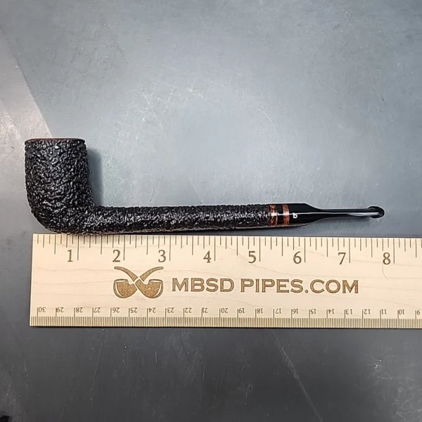 This pipe from the late Paolo Becker is a good representative of the Becker style – traditional shapes with a distinct Italian flair, added here by Paolo’s choice of finish. This classical lumberman is dressed in Becker’s signature rustication, the very Italian, black and rocky rustication that is just about as iconic as Castello’s Sea Rock line. This pipe, however, has its rim left smooth and polished, adding a little something extra to this hand made gem. While the pipe is extraordinarily long, it is not at all heavy, which is a sign of the high quality of the briar used. Though there are some light scratches on the lucite mouthpiece, it is otherwise in a fantastic condition, and promises to be a trusty, stylish companion for many decades more.