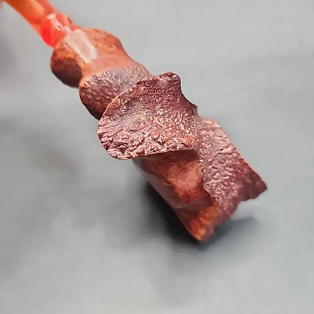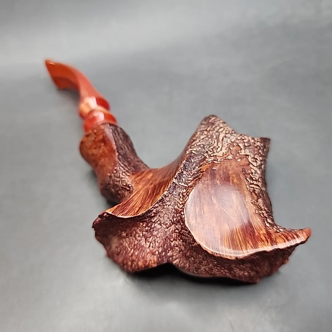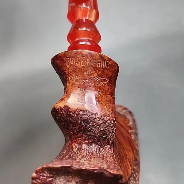 Preben Holm’s many innovations might well have turned pipe-making on its head. In this instance, quite literally; while Sixten Ivarsson is credited with originating the practice of incorporating bare plateau into the rim of a pipe, Holm seems to have been the one to use plateau for a pipe’s base. So, while many freehands have a floral quality, where their shape opens up as it rises to a plateau rim, Holm created dazzling freehand volcanoes like this one i.e., the inverse. This Ben Wade also shows off Holm’s liking for blending finishes, with polished straight grain, sandblasted ring grain, and plateau are joined together in one extravagant composition.