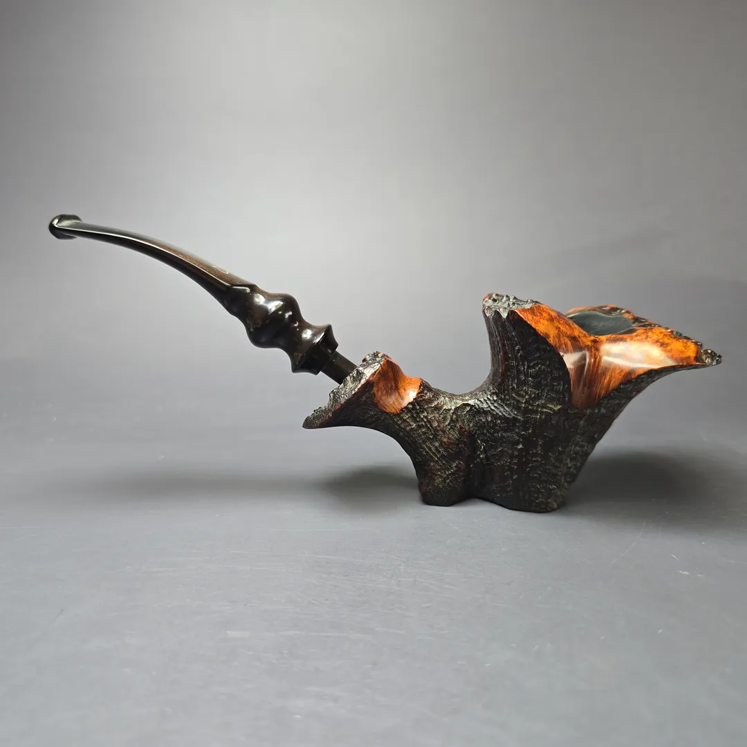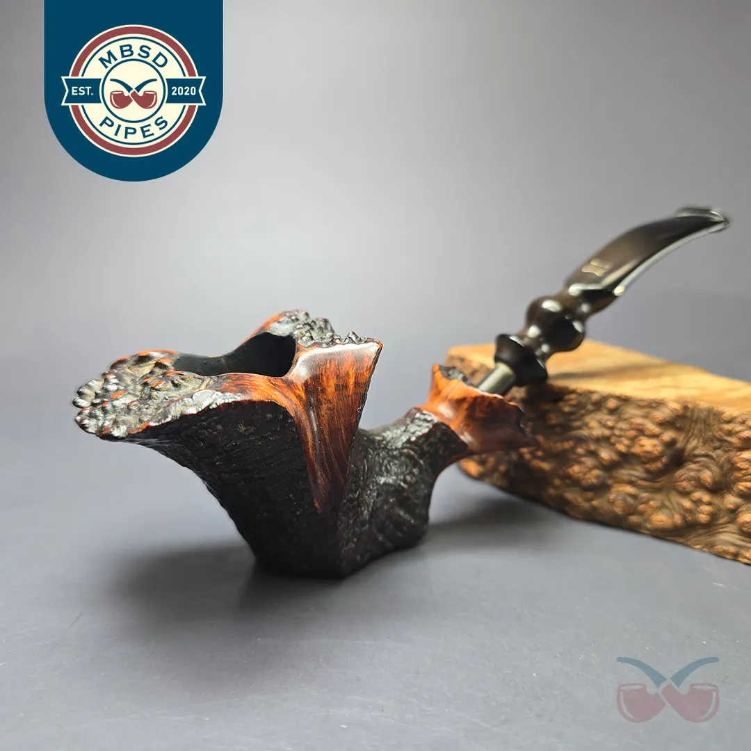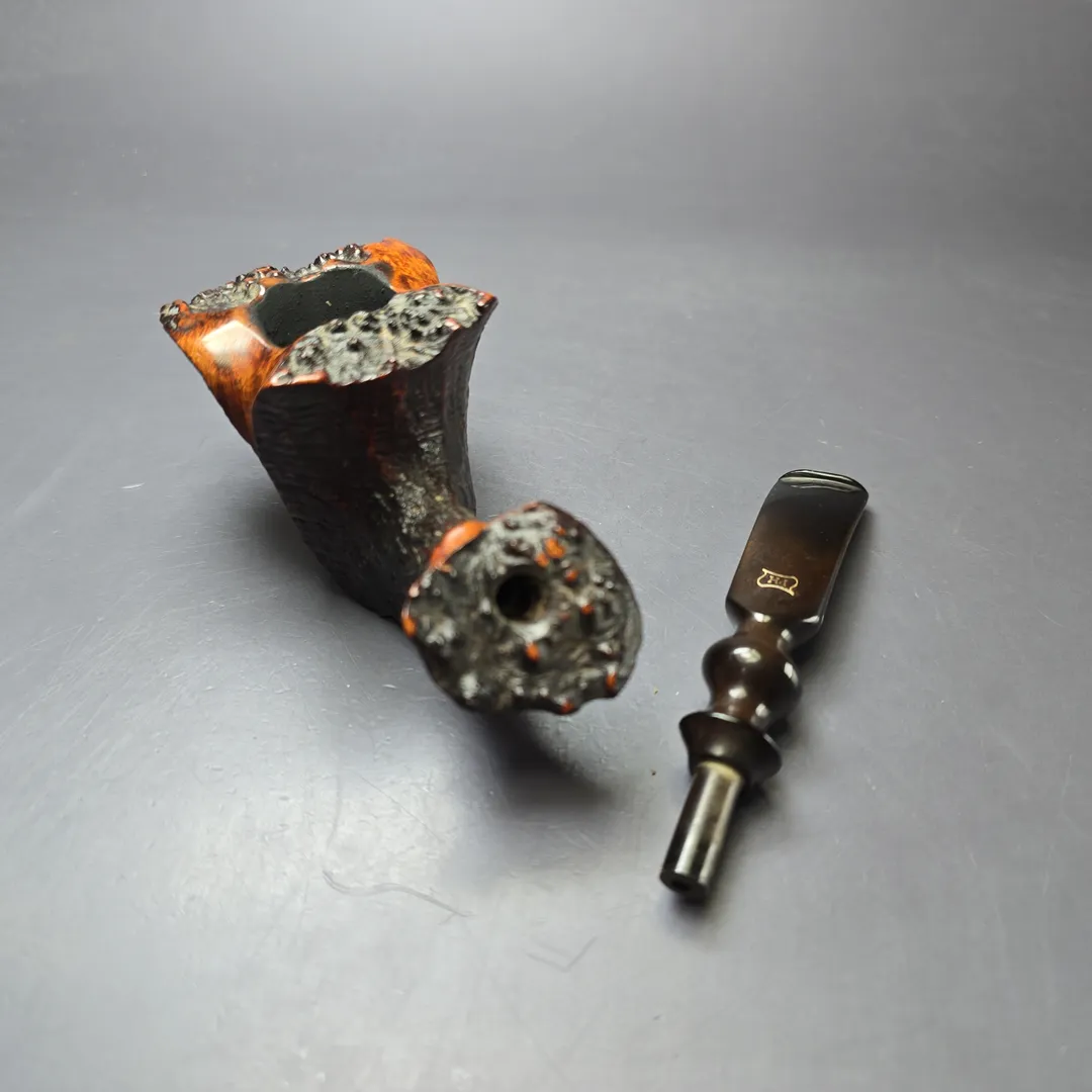 The Fancy was a line that Preben Holm made both for Ben Wade and for pipes sold under his own name. As Ben Wade and Preben Holm were technically different brands, owned by different individuals, this practice was not as common as one might assume, though this exception makes a lot of sense given the background to the word itself. After all, one of the names originally associated with the Scandinavian freehand movement was the “fancy,” or the “Danish fancy.” This term was largely used to denote pipes that we today would simply call “freehands,” not unlike the Nording Freehand lines that dominate the genre today, though not exclusively. Additionally, the word “fancy” did not first arise from the Danish language but was a borrowing from English, particularly as a descriptor of something “modern.” Early catalogs from workshops like WO Larsen, for example, separated their most unconventional shapes from their regular (though still very “Danish”) shapes by referring to the former as “Fancy.” The notion of the Danish Fancy evolved over time, becoming more synonymous with the contemporary “freehand,” likely in part to the sheer force Preben Holm’s name carried in Danish pipe making. This particular Fancy is a rather rare example of an almost entirely sandblasted Holm freehand, with only the rim and shank end left smooth. Holm was no stranger to mixed finishes, though more often this was around 50/50 in terms of distribution. The blast itself is excellent, as is typical of Preben Holm pipes, with dense, rugged ring grain around its unfolding bowl.