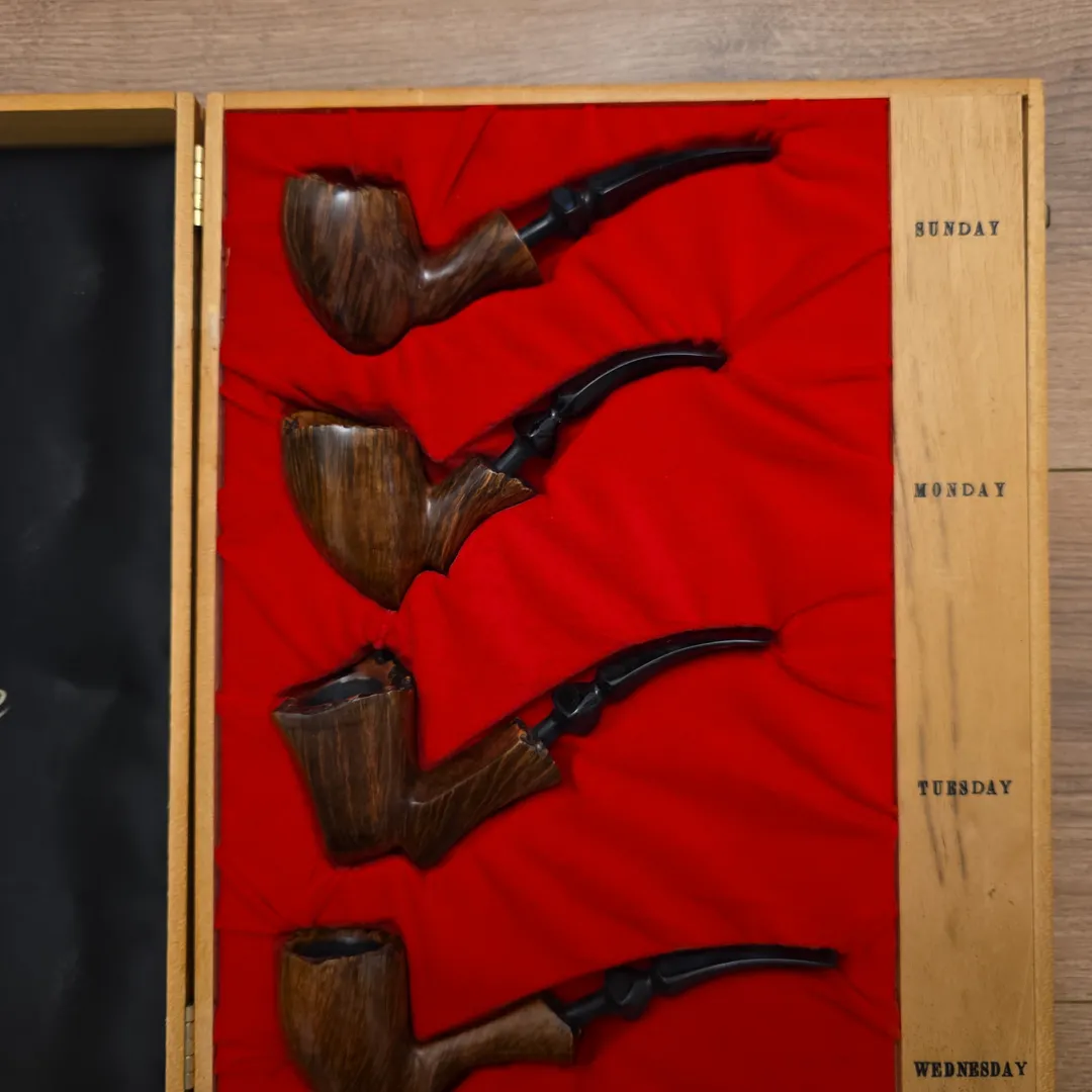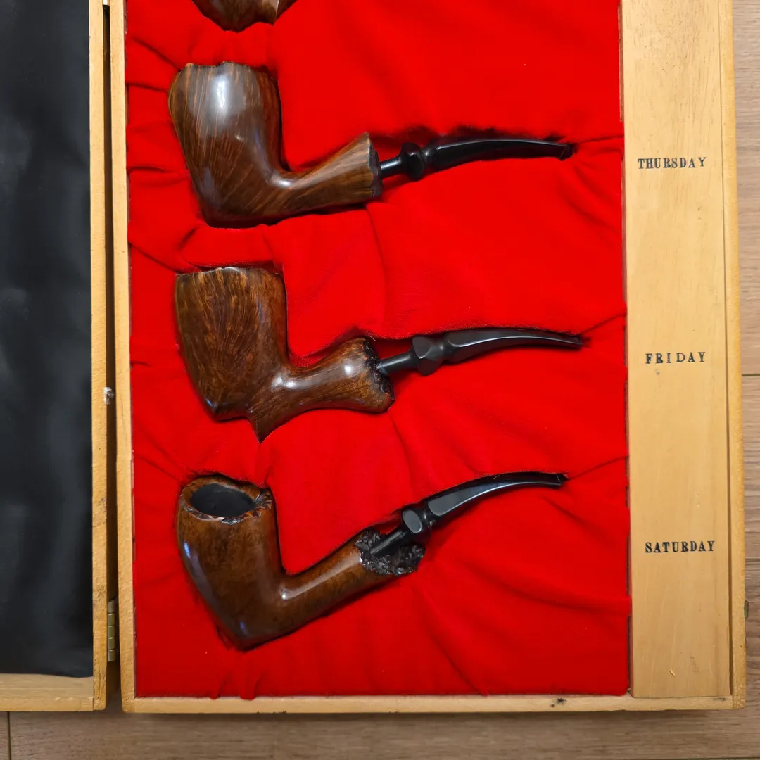 Tree heather root, otherwise simply known as “briar,” possesses almost unrivaled heat-resistant properties, which was to be a key factor in its adoption as the standard material for the construction of smoking pipes. But even briar needs to rest sometimes, hence why smokers are advised to accumulate at least a few pipes, so that when one is being used, the others can be allowed time to regain their composure in preparation for the next time they are called upon. In the 20th century, pipe companies capitalized on this practice of rest and rotation by creating the “7-day Set” to allow smokers to have a pipe for each day of the week from their favored make. These packages were limited in quantity and often marketed as special gifts for oneself or for the pipe-smoking loved one in your life. They were also—at least for the majority of the 20th century—traditional pipes from traditional makes, such as Comoy’s, Dunhill, Kaywoodie, or Sasieni. But, as time went on and as trends in pipe design and construction underwent significant changes in the decades following the Second World War, 7-day sets appeared from decidedly non-traditional pipe companies and artisans, albeit with even less frequency than their traditional counterparts. This collection from Preben Holm is a very rare example of a 7-day set from the legendary Danish artisan. Each is a freehand pipe—i.e., with its bowl having been hand-shaped against a sanding disk, rather than turned on a machine lathe—and each differs in form, with some approaching classical shapes, such as the pickaxe, the Dublin, or the acorn, and others eschewing these staples altogether. Crucially, where they are most alike—and where this set comes closest to many from traditional, factory makes—is that the pipes are of the “matched grain” variety, with each being from the Hand Model line and dressed in a uniform, golden-brown finish.