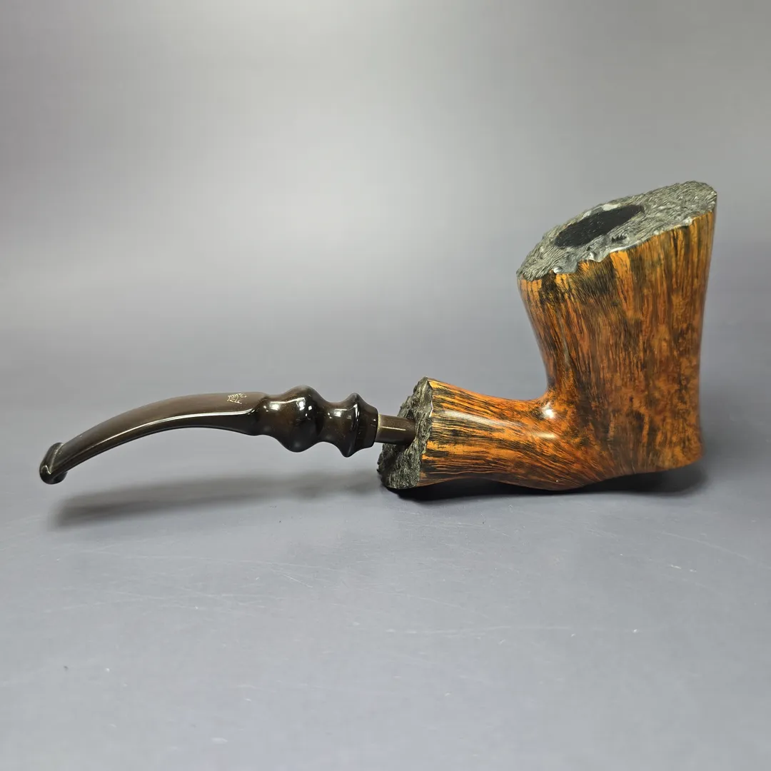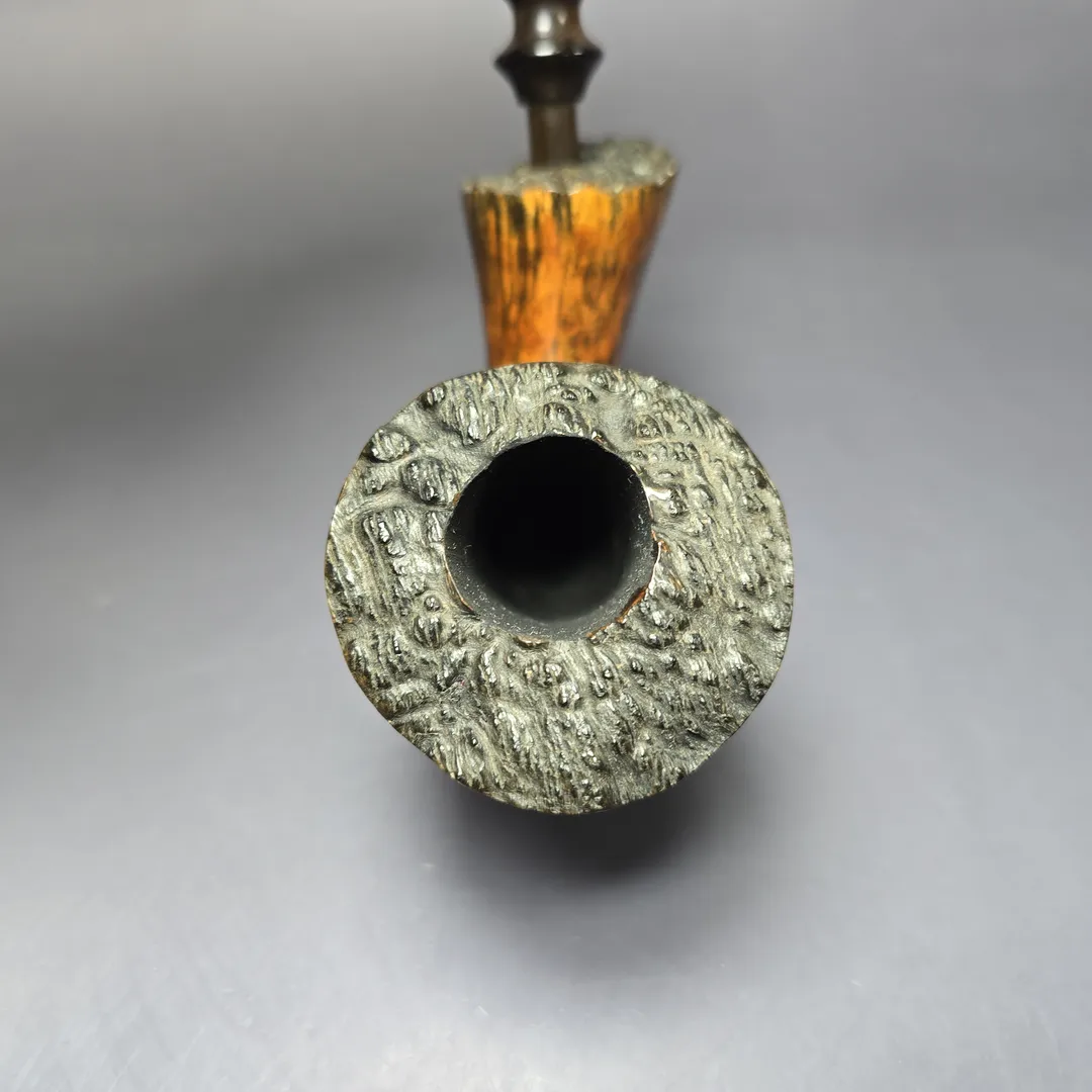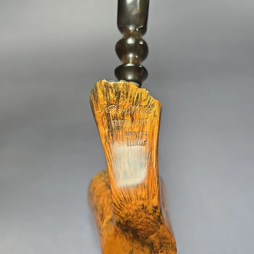 Preben Holm’s Ben Wade freehands came in a variety of styles and finishes, and as such a vast array of separate lines. Some of these lines were subdivided into grades (such as the Nobel Prize) and some into groupings. The Golden Walnut was an example of the latter. Alongside the Golden Tan, Golden Matt, and Golden Grain, the Golden Walnut was a quintessentially Danish freehand, bearing a warm, walnut contrast stain, as opposed to a matt contrast stain. This one is another example of a good large, instance of the Golden Walnut from Preben Holm’s workshop, juxtaposing a rugged, naturalistic bowl with one of Holm’s signature, ornate ebonite stems.