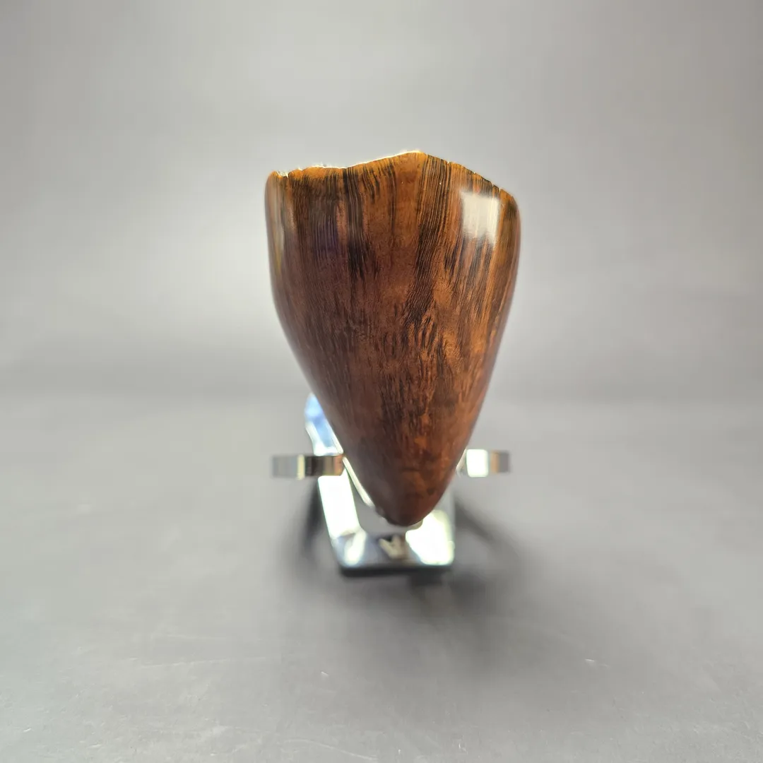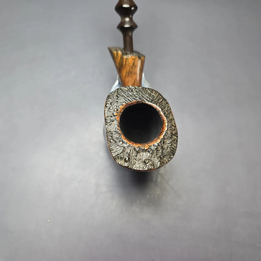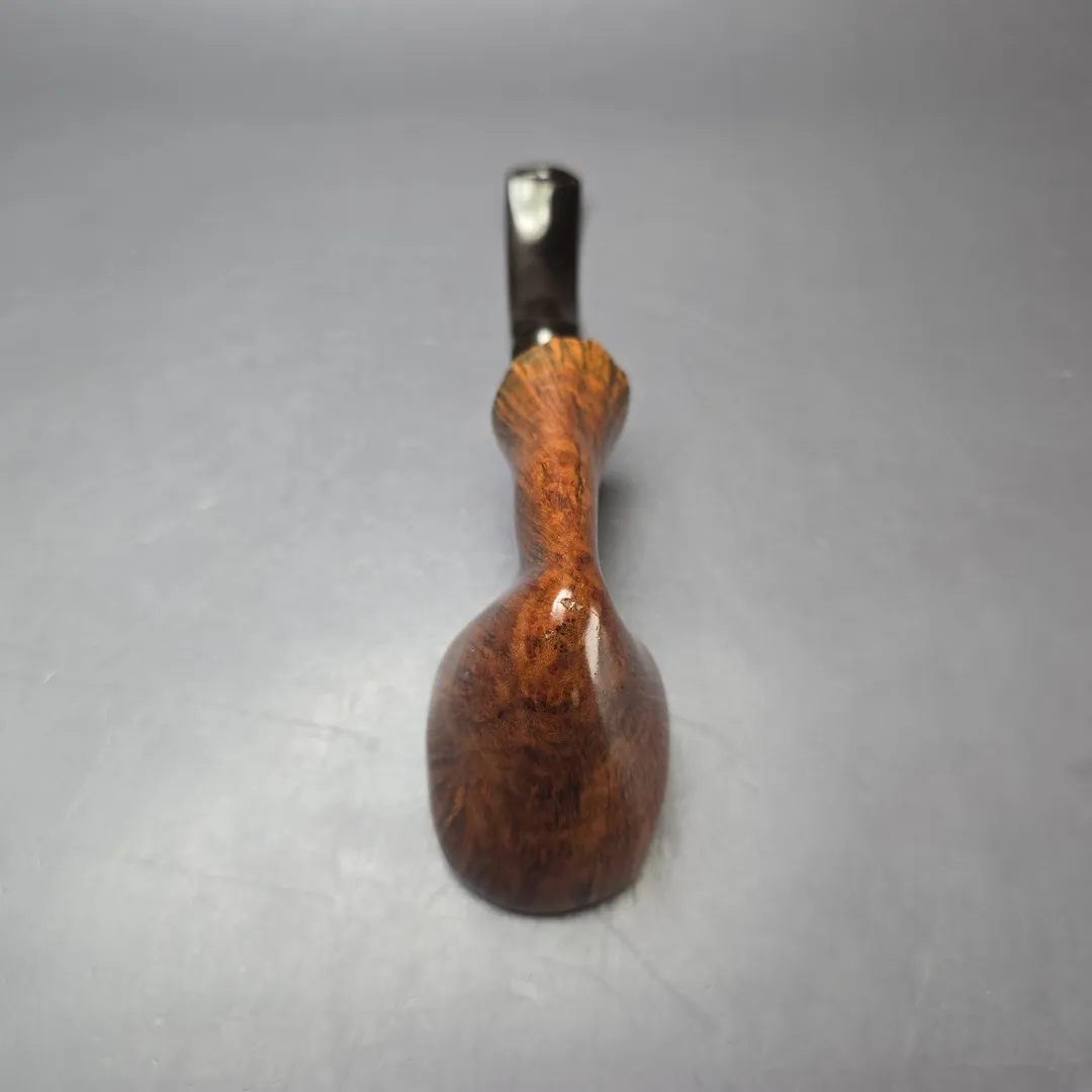 Preben Holm’s Ben Wade freehands came in a variety of styles and finishes, and as such a vast array of separate lines. Some of these lines were subdivided into grades (such as the Nobel Prize) and some into groupings. The Golden Walnut was an example of the latter. Alongside the Golden Tan, Golden Matt, and Golden Grain, the Golden Walnut was a quintessentially Danish freehand, bearing a warm, walnut contrast stain, as opposed, for example, to the matte contrast stain of the Golden Matte, or the sandblast finish of the Golden Tan. As was the case for the “Golden” line more generally, this one is an impressively large specimen, bearing all the hallmarks of the Dancy Fancy, including superb straight grain, live plateaux edges, and an ornate, double-beaded ebonite stem.