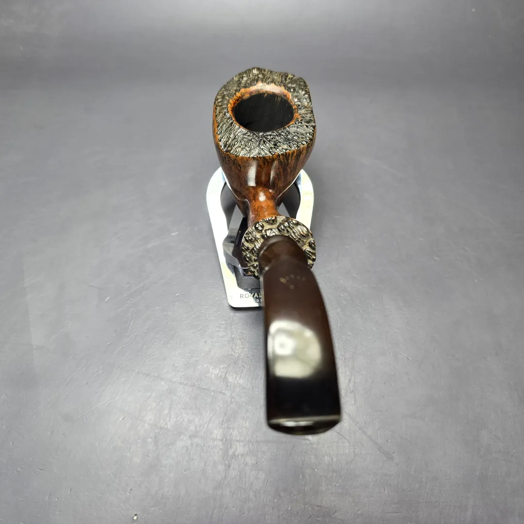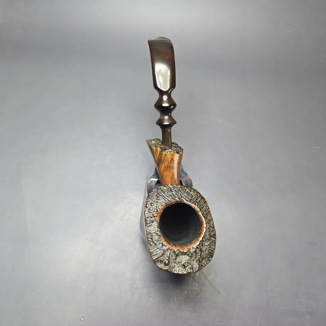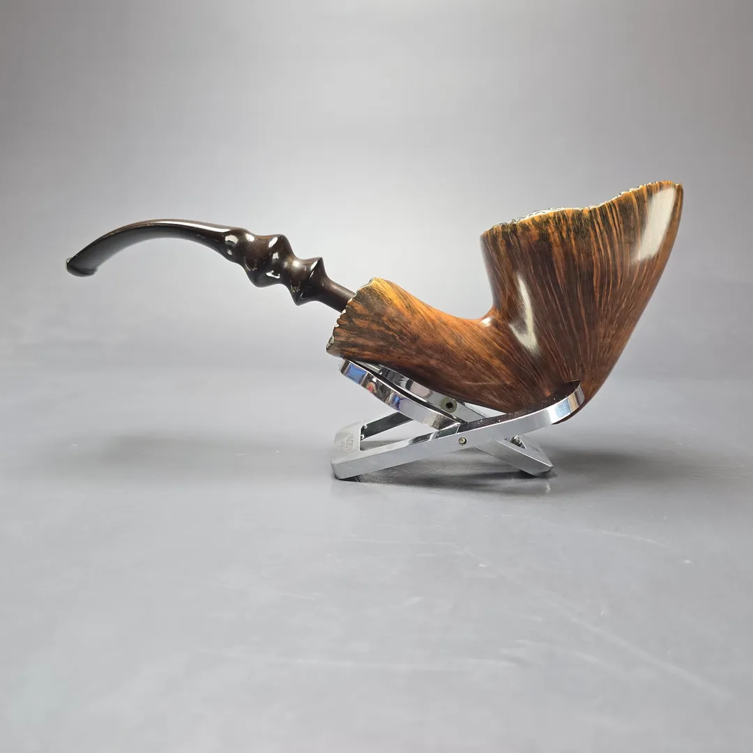 Preben Holm’s Ben Wade freehands came in a variety of styles and finishes, and as such a vast array of separate lines. Some of these lines were subdivided into grades (such as the Nobel Prize) and some into groupings. The Golden Walnut was an example of the latter. Alongside the Golden Tan, Golden Matt, and Golden Grain, the Golden Walnut was a quintessentially Danish freehand, bearing a warm, walnut contrast stain, as opposed, for example, to the matte contrast stain of the Golden Matte, or the sandblast finish of the Golden Tan. As was the case for the “Golden” line more generally, this one is an impressively large specimen, bearing all the hallmarks of the Dancy Fancy, including superb straight grain, live plateaux edges, and an ornate, double-beaded ebonite stem.