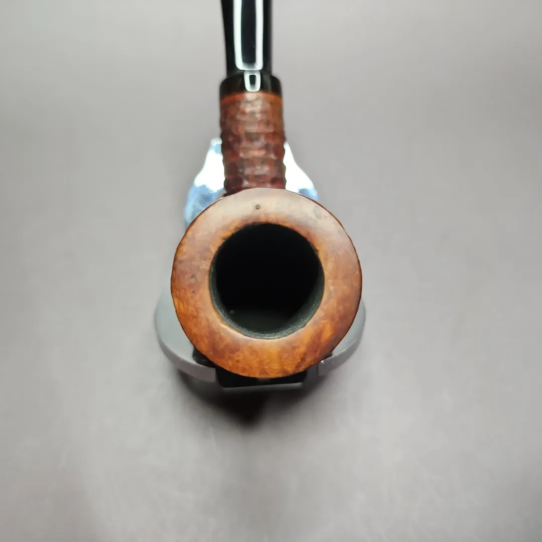 When Bennie Joe told me he was going to be making some more “traditional” pipes, I was a little disappointed at first. He’s put out some really creative freehand work over the years, so I wasn’t sure what I would make of his more classically-inclined output. When the pipes arrived, I saw that I’d had no reason to be worried. This one is a fantastically playful nosewarmer stack, with a deep, stony rustication, a contrast stain, and a hand cut ebonite stem. It should be a perfect pocket pipe and even a comfortable clencher, while having a chamber deep enough for longer smokes.