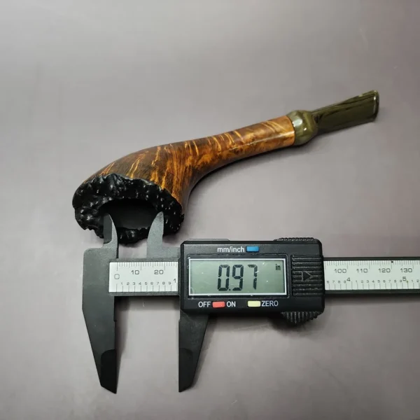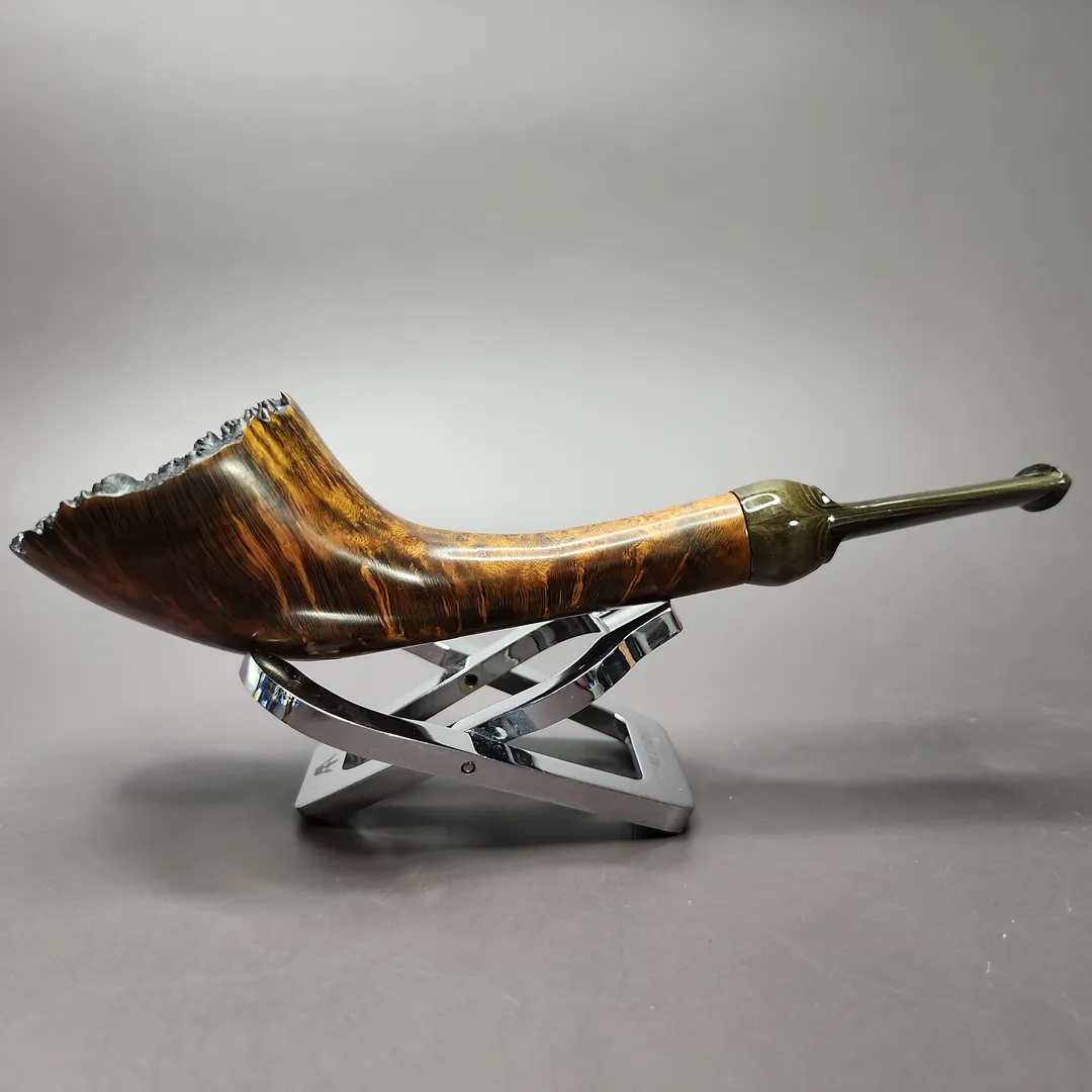 The horn has a long-established role within Danish and Danish-inspired pipe-making, thanks in large part to the pioneering designs of Sixten Ivarsson and Bo Nordh. Here we see Indonesia’s Bennie Joe paying his own tribute to the latter, as so many have done. The result is a long (though relatively lightweight), distinct piece, covered in flame grain that seems almost to explode in the form of a rim of plateaux briar.