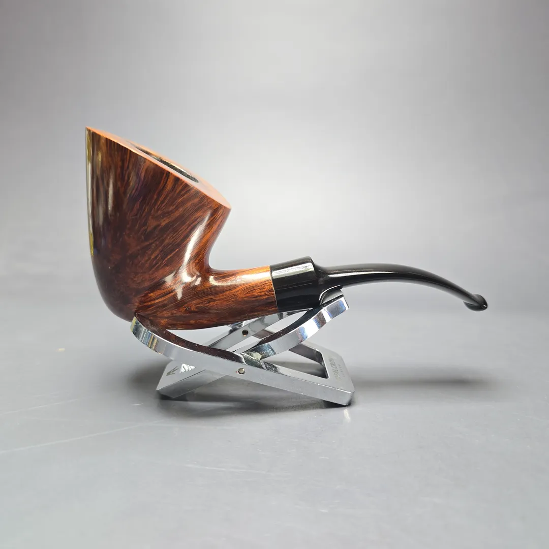 Bjarne Nielsen prided himself on offering pipes that were “exclusive,” with a tagline for Bjarne pipes that read “the exclusive ones.” Part of this was, of course, a gesture to the high quality of Bjarne pipes. But another part regarded the individuality of each pipe Bjarne sold. Bjarne catalogs, for example, claimed that each pipe was “as individual as your finger prints.” Unlike Bjarne’s contemporaries at Georg Jensen, Stanwell, Kriswill, or even, to an extent, W.O. Larsen, Bjarne pipes were not produced according to a shape chart, no matter how loose. This one’s a good example of post-war Danish Dublin, not entirely unlike the ones made at W.O. Larsen (there was some staff cross-over, after all), especially given its nicely fiery graining.