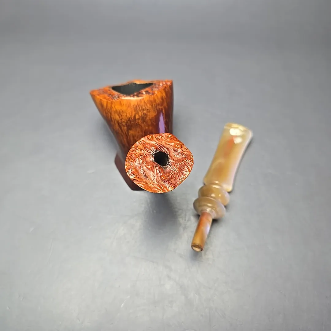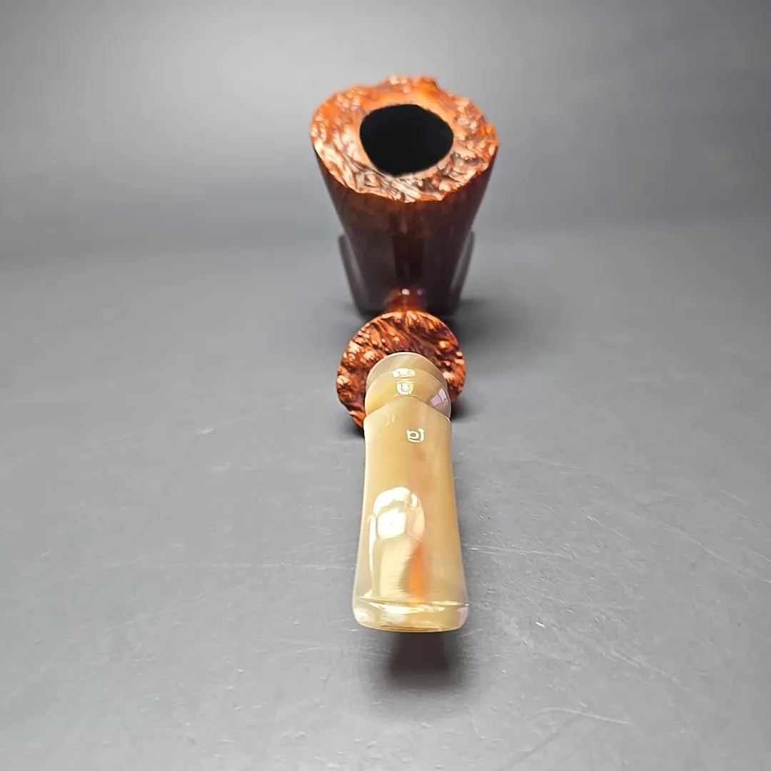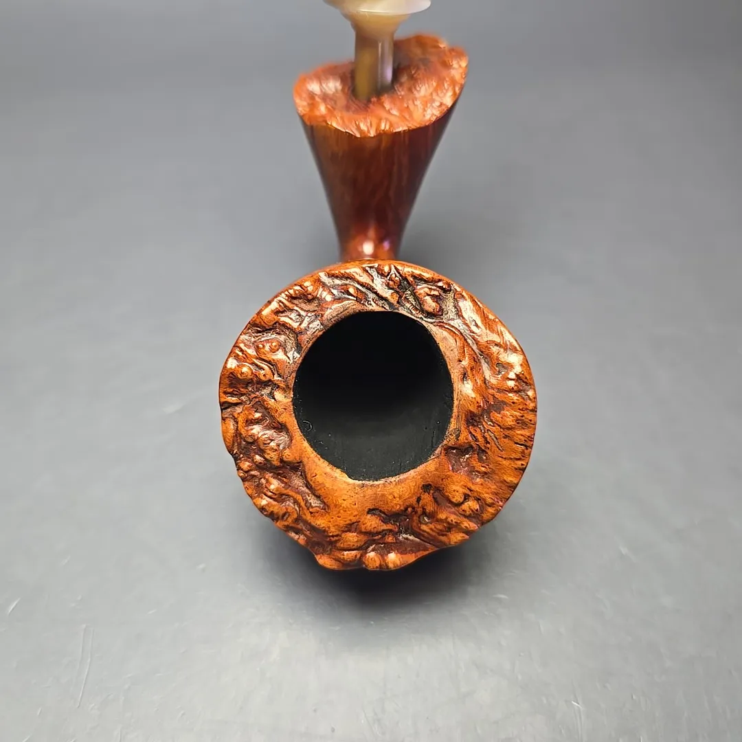 Though all freehand pipes are, by definition, unique, and though Bjarne prided himself in offering pipes that were each “as individual as your finger prints,” there were certain noticeable quirks and proclivities in Bjarne pipes. In the case of the Signature grade, Bjarne Nielsen pipes, these were often quite evident, being hallmarks of the rather idiosyncratic artisans who carved them (such as Ph. Vigen and Tonni Nielsen). In the case of the Bjarne freehands of the “Danish Fancy” variety, however, there were also common themes. One of them, which is on full display with this pipe, was that of a sitter, but with a steeply upright posture that bordered on the balletic. This one could pass for a “freehand cavalier,” for instance, with the only thing more striking than its form being the beautiful straight grain that form was rendered to fully accommodate.