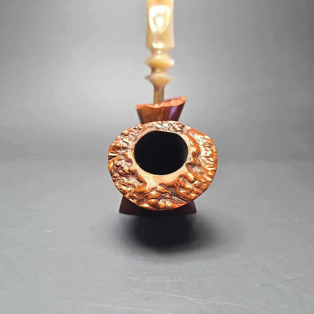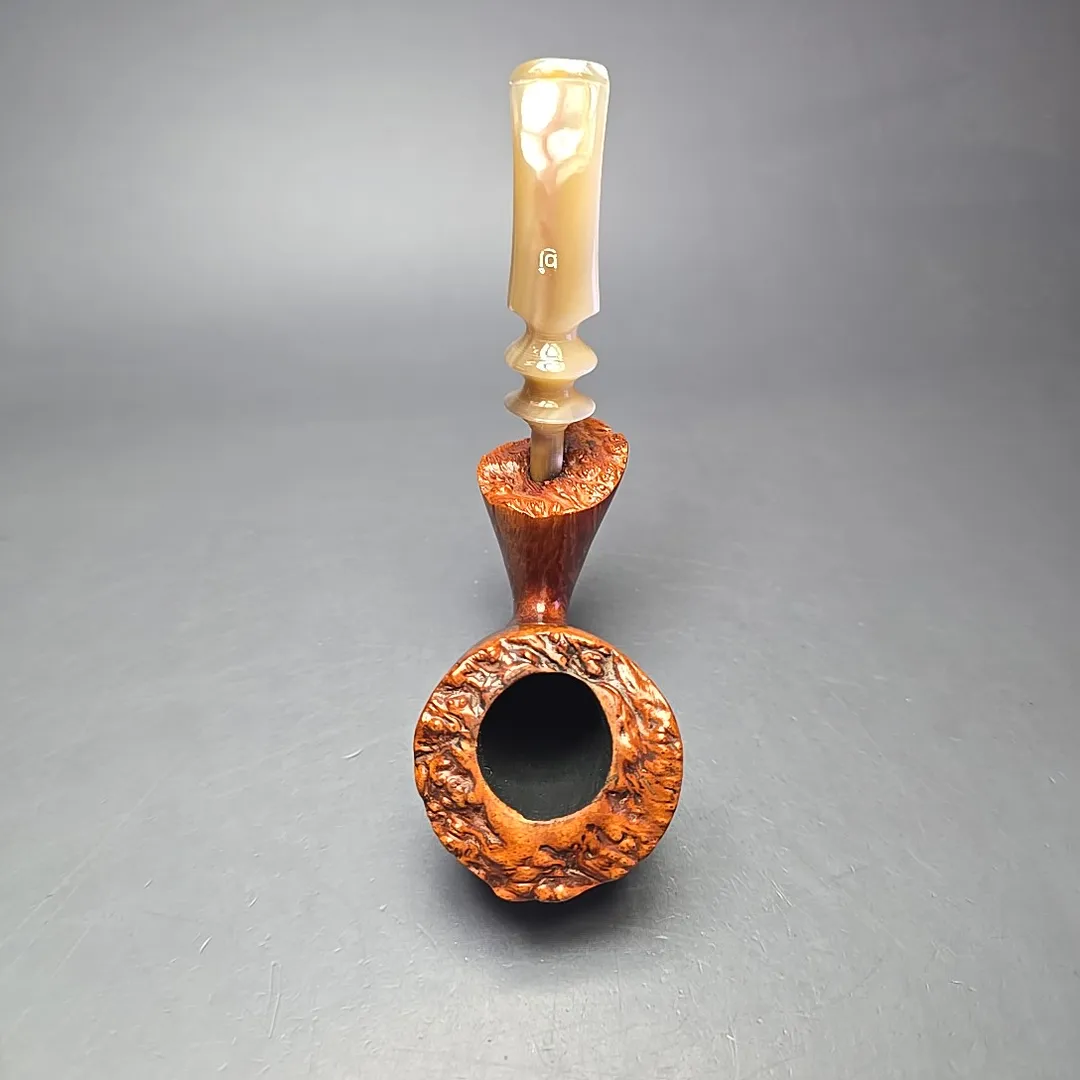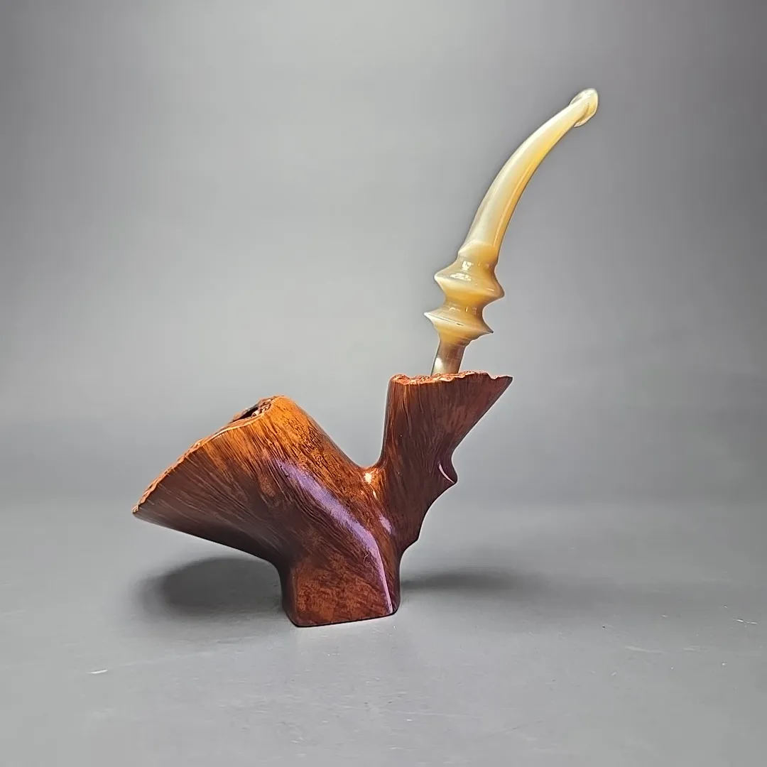 Though all freehand pipes are, by definition, unique, and though Bjarne prided himself in offering pipes that were each “as individual as your finger prints,” there were certain noticeable quirks and proclivities in Bjarne pipes. In the case of the Signature grade, Bjarne Nielsen pipes, these were often quite evident, being hallmarks of the rather idiosyncratic artisans who carved them (such as Ph. Vigen and Tonni Nielsen). In the case of the Bjarne freehands of the “Danish Fancy” variety, however, there were also common themes. One of them, which is on full display with this pipe, was that of a sitter, but with a steeply upright posture that bordered on the balletic. This one could pass for a “freehand cavalier,” for instance, with the only thing more striking than its form being the beautiful straight grain that form was rendered to fully accommodate.