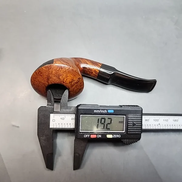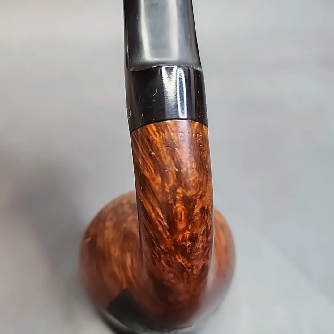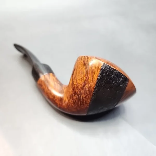 This Bjarne shows all the hallmarks of the Danish style – more specifically, the Danish approach to the classic ‘Dublin’ shape. With a bowl so wide it almost resembles a calabash, as well as a distinctly curvy figure, the Danish Dublin has come to embody a shape of its own. This Bjarne is a masterful interpretation of such a shape, complemented by stunning bird’s eye grain all over its rim and flame grain swirling around the sides of the bowl. This smooth grain is interrupted by a small patch of sandblasted briar – another common technique in Danish pipe finishes – that should make the pipe even easier to keep in one’s grip.