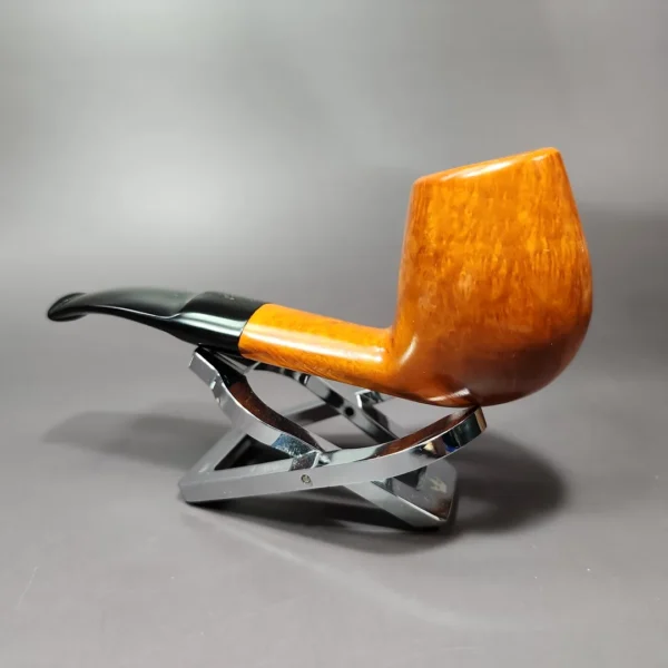 We were very lucky, recently, to get our hands on a few new old stock Bjarne pipes, of which this is one. It’s certainly a stunning work, and it’s quite clear from it just why Bjarne was such a prominent name in pipes while the make was still around. This one is also a relatively rare example of a Bjarne in a light, natural stain—a decision no doubt based on the gorgeous flame grain patterns in its briar.