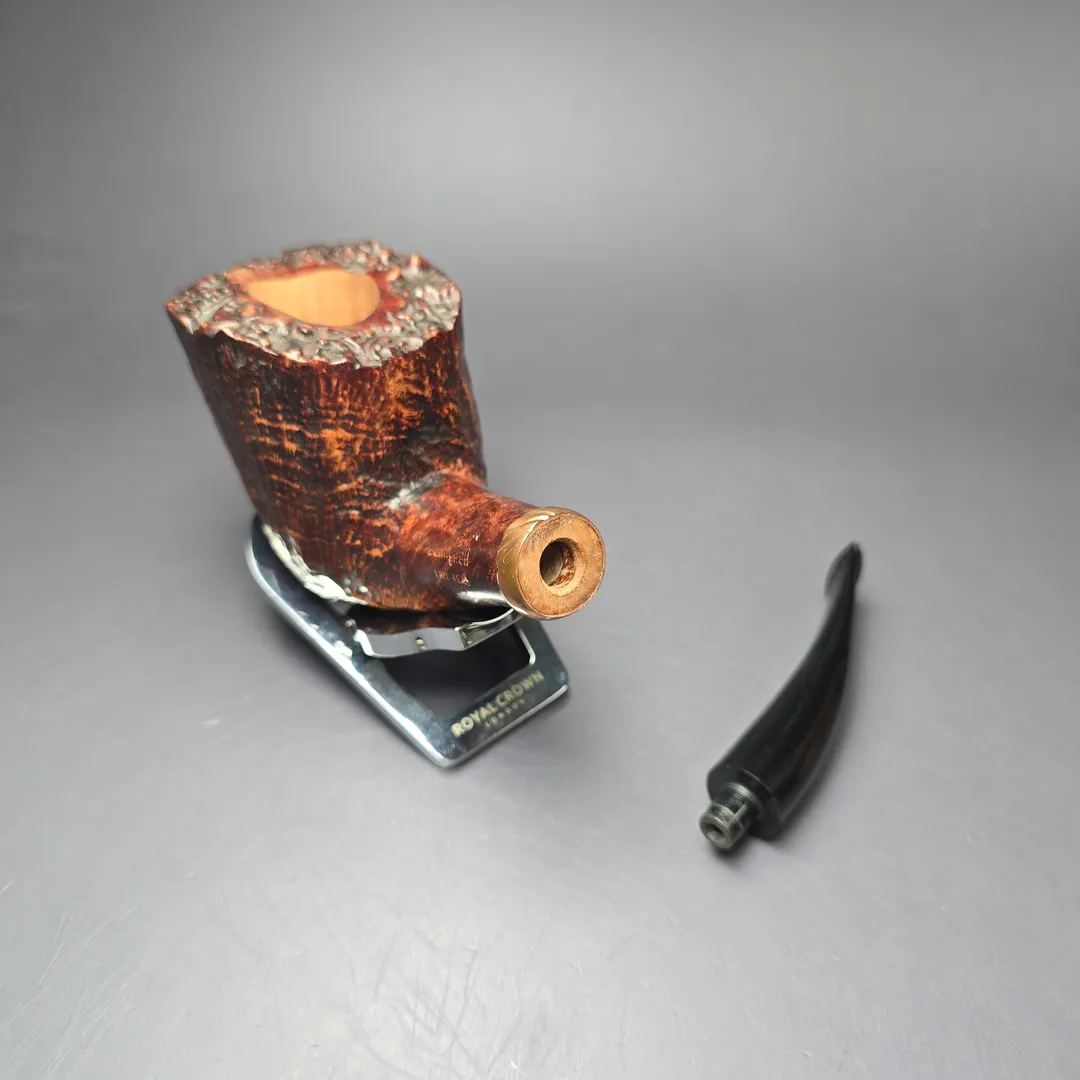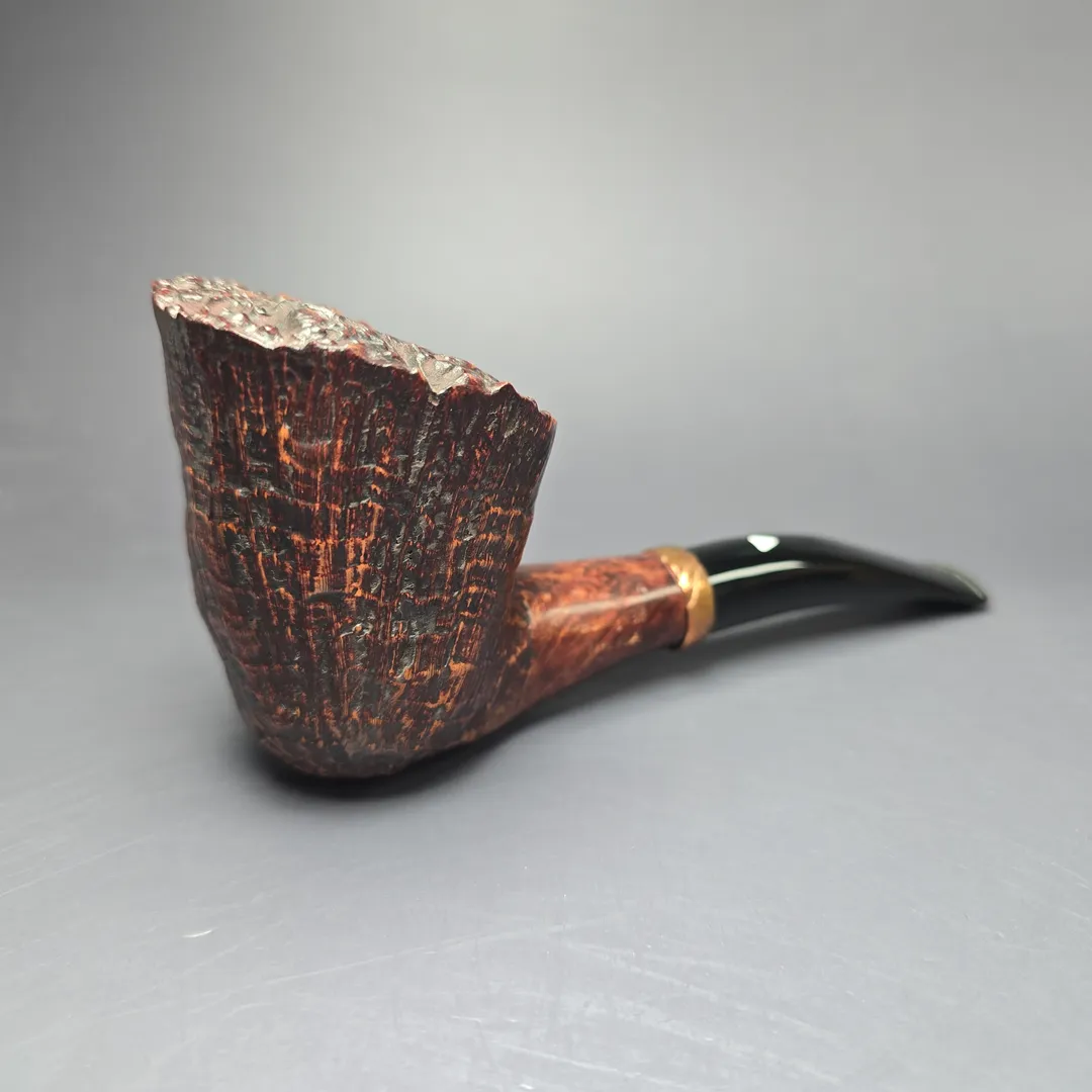Alberto Bonfiglioli’s Free Form series is where he lets his more creative side out, eschewing traditional pipe shapes for those closer to the Danish fancy “freehand” pipe, as the name suggests. This one is very much faithful to that genre, taking the form of an extra large, plateaux-topped, copper-collared freehand Dublin-hawkbill hybrid. Somewhat uncommonly for Italian pipes, this one wears a very craggy, ring grain sandblast, with ring grain brought into the kind of relief one would expect from a mid-century Fossil, or Shell Briar.