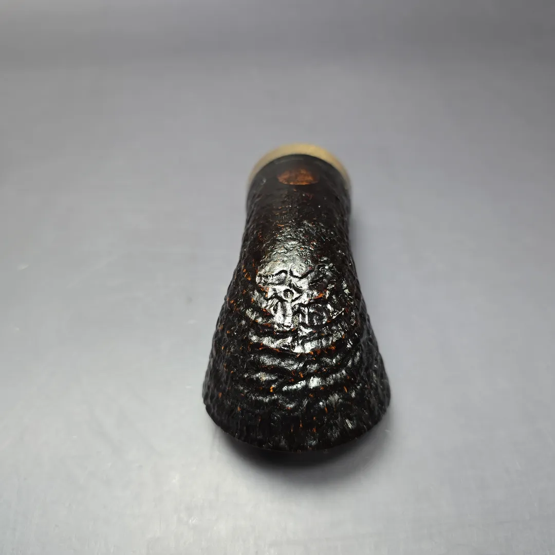 Translating to the English “nubble,” the Knubbel is one of Tobias Höse’s signature shapes. A uniquely short and stout rendition of the Rhodesian, it is right at home within Höse’s portfolio and personality. After all, Höse is someone who spends his time carefully cultivating miniature trees, so the presence of stubbier designs in his output should not be surprising. The Knubbel itself has taken off as a real fan favorite when it comes to Bonsai pipes, to the extent that Höse has even collaborated with Dirk Heinemann on a few variations the past (Heinemann, of course, has his own signature stubby, the Dora). This one is entirely Höse’s work, staying true to the classic Knubbel in form and finish. Dressed in a perfectly executed, dark, ring grain sandblast, the pipe is fitted with a hand-cut cumberland stem and accented with a ferrule cut from a curious, almost hypnotic material—stabilized platan wood.