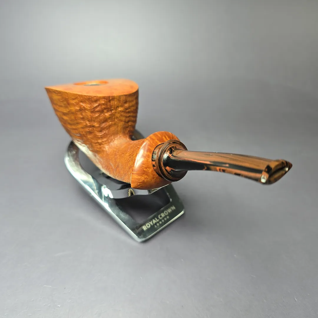 There is something distinctly Danish (or, more accurately, Scandinavian) about this Dublin from Kentucky’s Brandon Brooks. In fact, one can pinpoint a singular precedent, one that has evolved over subsequent decades into works such as this one in the contemporary: Sixten Ivarsson and, more specifically, a motif most popularly represented by his shape “20,” commissioned by Stanwell circa 1960. Most striking about the design is its maritime appearance (Ivarsson’s is occasionally referred to as a “boat” shape), with long and slightly narrowed, bow-like bowl and sharp, unbroken line running from the front of the rim to the end of the shank. Brooks’ rendition is, at the same time, very different from Ivarsson’s, or indeed from similar, contemporary approaches, such as those of Andrea Gigliucci. Adding a more lively color palette (“black and Tanshell,” one might say) Brooks’ shaping is comparatively softer, pulling closer to the more traditional proportions of the Dublin shape, while also incorporating a teardrop shank capped with a smooth briar accent.