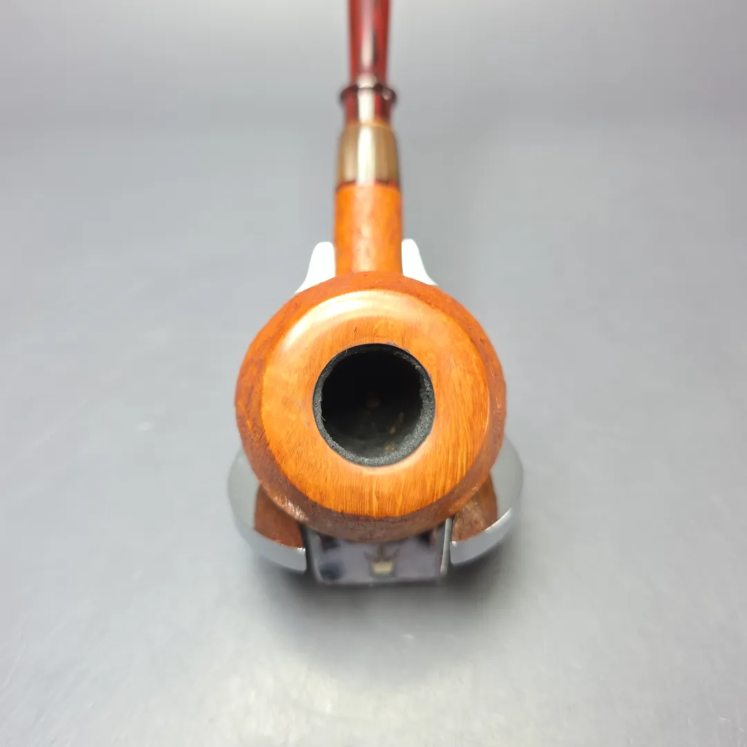 One of Michele Brentegani’s signature shapes is his Danish-inspired apple-prince hybrids, often incorporating a distinct under-travel of the shank in order to lend the bowl a fuller look and feel. This is one such example, with the bowl’s tan, partial sandblast finish complemented by an extra, unconventional dash of color (another Brentegani signature) by way of a cumberland accent and mouthpiece.