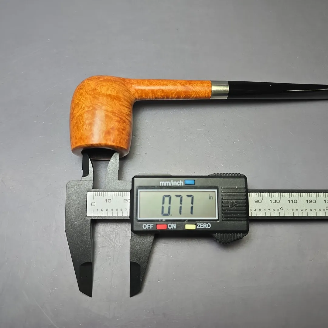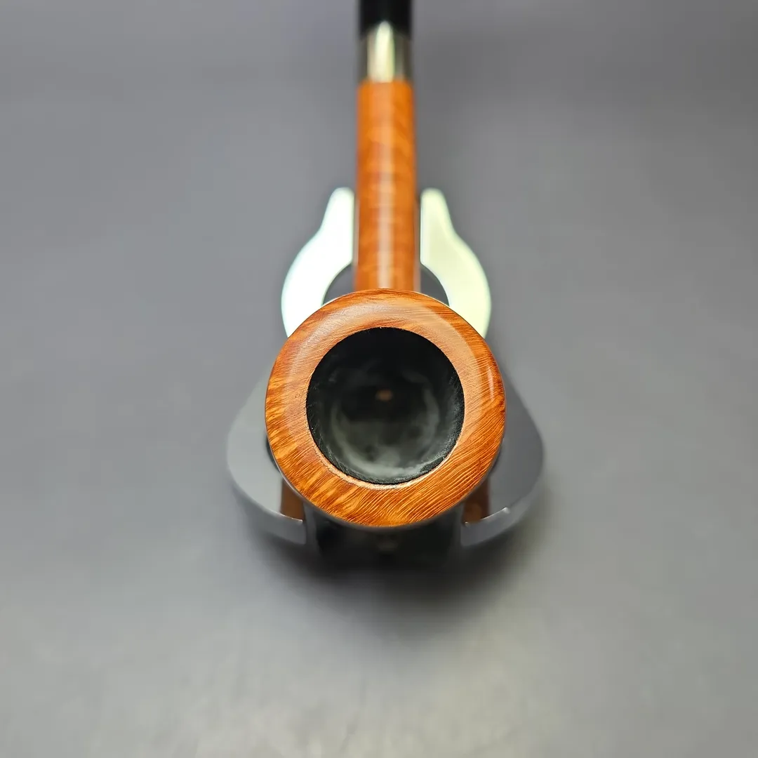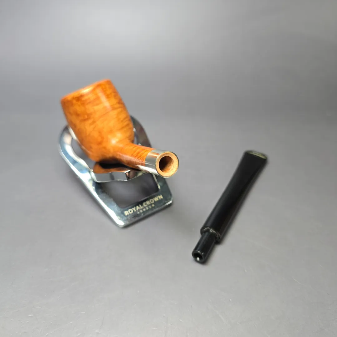 This pipe is completely unsmoked, with an original bowl coating. Some light scratching on the inside lip of the rim and a small scratch on the side of the bowl, though both are superficial. The pipe comes with its original sleeve.