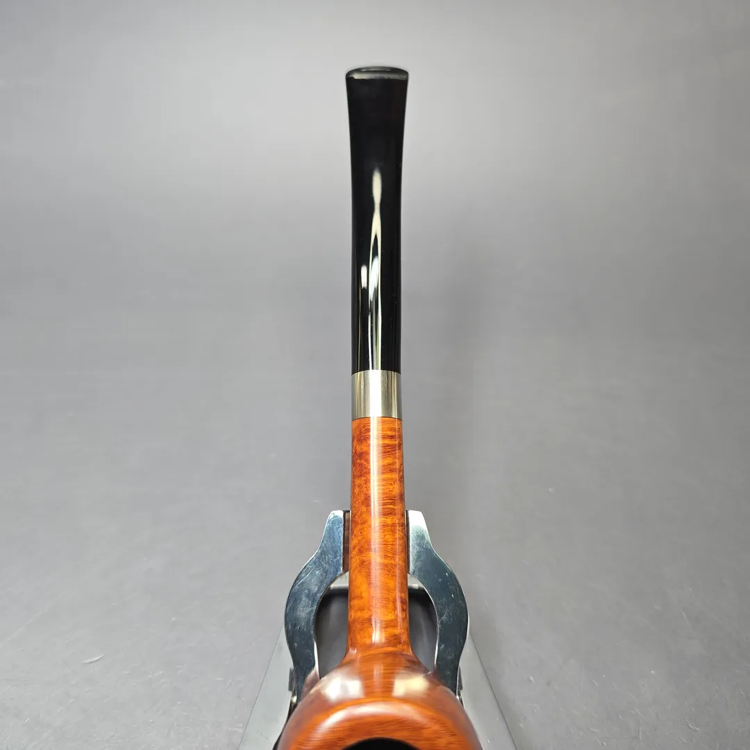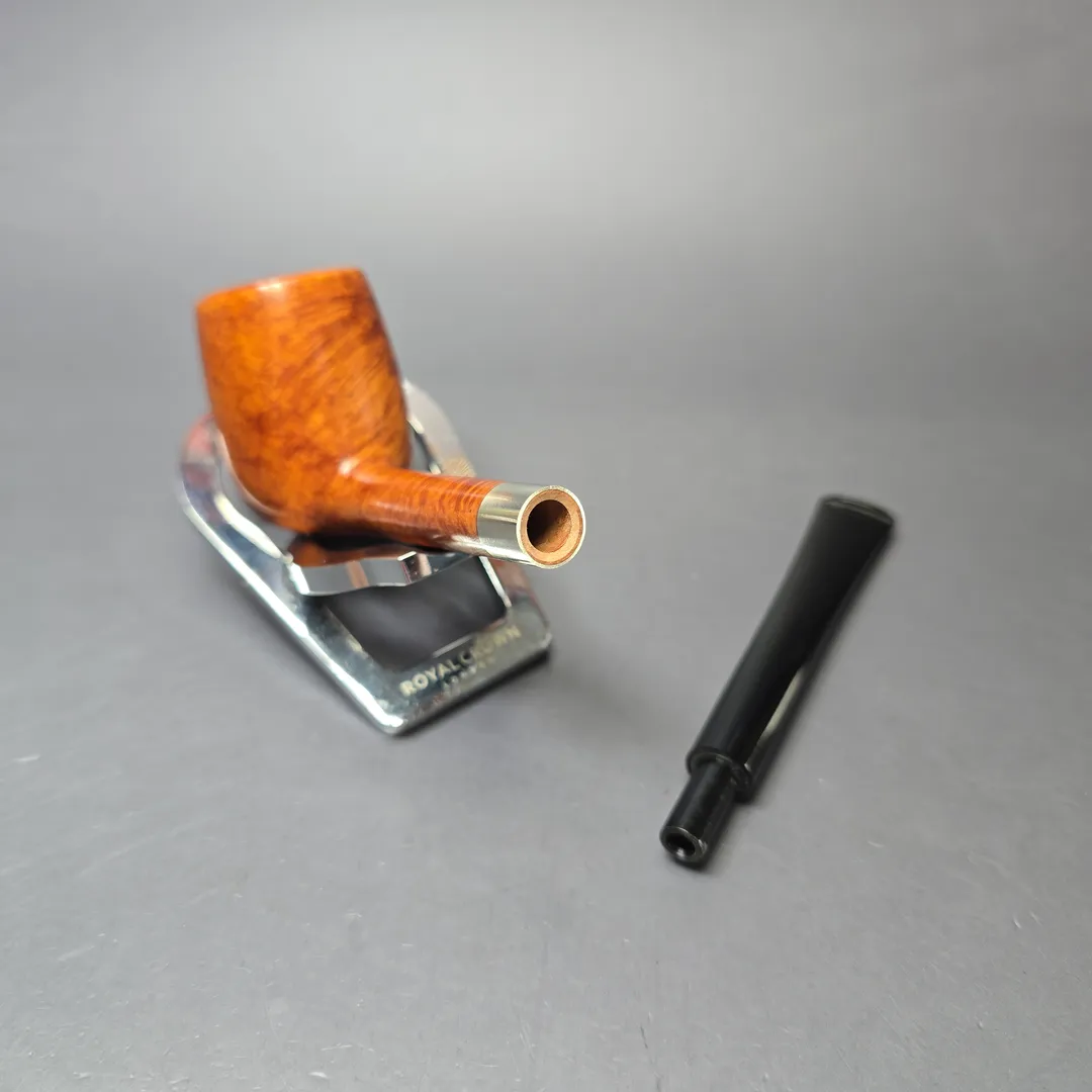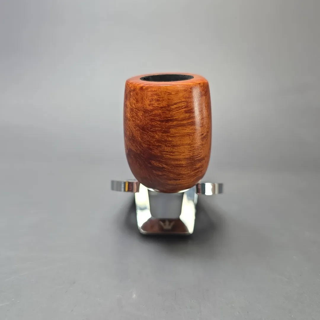 While Bruno Nuttens today is known for the wide variety of designs in his portfolio, his tremendous rise in prominence began with his “Bing” billiards. These pipes take their name from Bing Crosby, an actor and crooner from the 20th century well-known for his love of pipes—especially the ones we now commonly know as the “Bing.” Crosby was photographed many a time with a long, pencil-shanked billiard clenched between his teeth which he appears to have acquired from Herbert Merchant’s Merchant Service. Decades later, artisans like Nuttens would rediscover this distinct genre of pipes and put their own spin on the design. Nuttens himself sources the bowls for his Bings from the warehouses of France’s pipe making powerhouses in Saint-Claude, where they have had many years to season. He then finishes the bowls, cuts stems for them, and furnishes them with tasteful metal accents—in this case, copper, to complement a warm brown sandblast finish. The result is something classy, lightweight, and ample in chamber—perfect for puffing out on the town or home in the lounge. This natural blonde, bird’s-eye-decked Bing received the second-highest grade awarded to Nuttens’ Bing pipes, the B3.