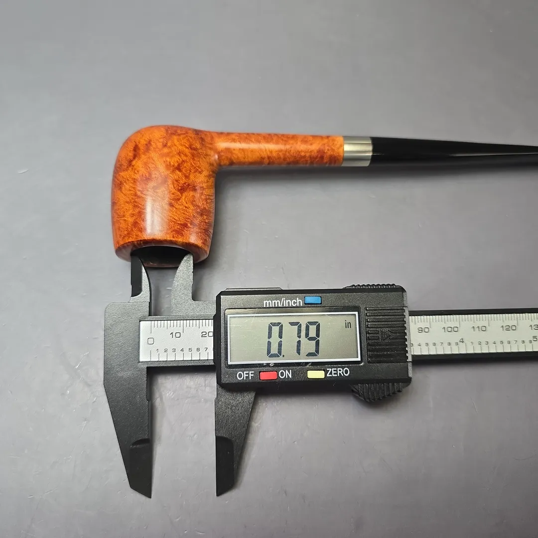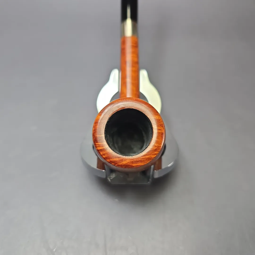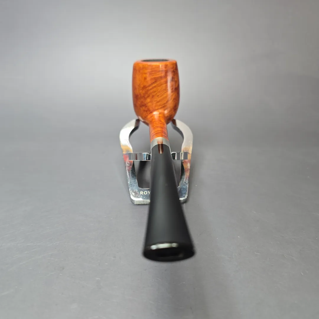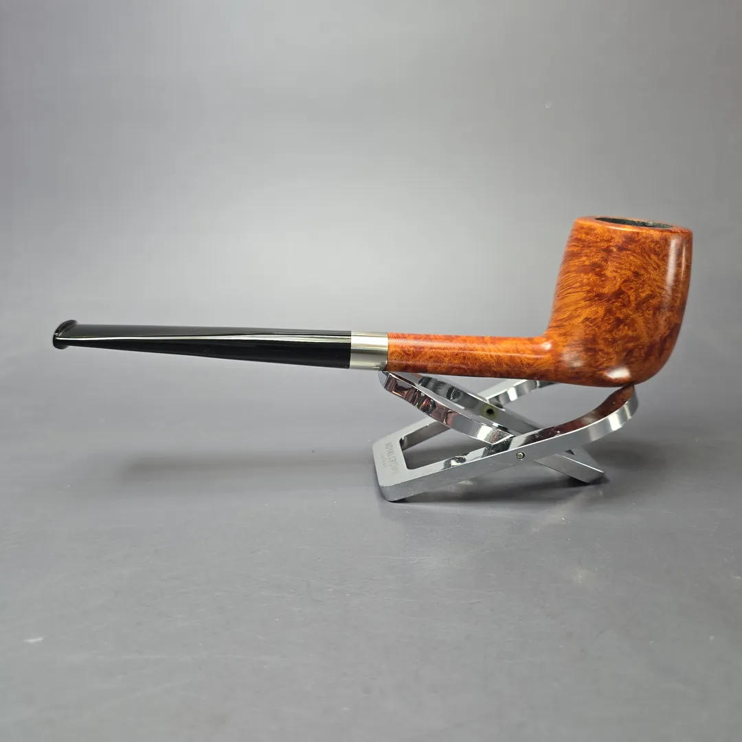 While Bruno Nuttens today is known for the wide variety of designs in his portfolio, his tremendous rise in prominence began with his “Bing” billiards. These pipes take their name from Bing Crosby, an actor and crooner from the 20th century well-known for his love of pipes—especially the ones we now commonly know as the “Bing.” Crosby was photographed many a time with a long, pencil-shanked billiard clenched between his teeth which he appears to have acquired from Herbert Merchant’s Merchant Service. Decades later, artisans like Nuttens would rediscover this distinct genre of pipes and put their own spin on the design. Nuttens himself sources the bowls for his Bings from the warehouses of France’s pipe making powerhouses in Saint-Claude, where they have had many years to season. He then finishes the bowls, cuts stems for them, and furnishes them with tasteful metal accents—in this case, copper, to complement a warm brown sandblast finish. The result is something classy, lightweight, and ample in chamber—perfect for puffing out on the town or home in the lounge. This natural blonde, bird’s-eye-decked Bing received the second-highest grade awarded to Nuttens’ Bing pipes, the B3.