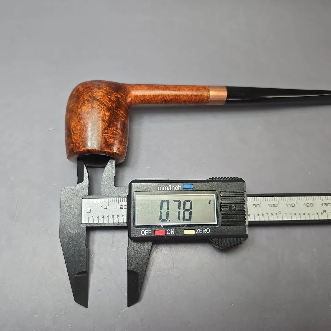 While Bruno Nuttens today is known for the wide variety of designs in his portfolio, his tremendous rise in prominence began with his “Bing” billiards. These pipes take their name from Bing Crosby, an actor and crooner from the 20th century well-known for his love of pipes—especially the ones we now commonly know as the “Bing.” Crosby was photographed many a time with a long, pencil-shanked billiard clenched between his teeth which he appears to have acquired from Herbert Merchant’s Merchant Service. Decades later, artisans like Nuttens would rediscover this distinct genre of pipes and put their own spin on the design. Nuttens himself sources the bowls for his Bings from the warehouses of France’s pipe making powerhouses in Saint-Claude, where they have had many years to season. He then finishes the bowls, cuts stems for them, and furnishes them with tasteful metal accents—in this case, copper, to complement a warm brown sandblast finish. The result is something classy, lightweight, and ample in chamber—perfect for puffing out on the town or home in the lounge. This golden-brown, bird’s-eye-decked Bing received the second-highest grade awarded to Nuttens’ Bing pipes, the B3.