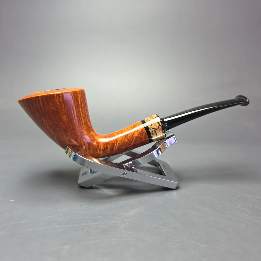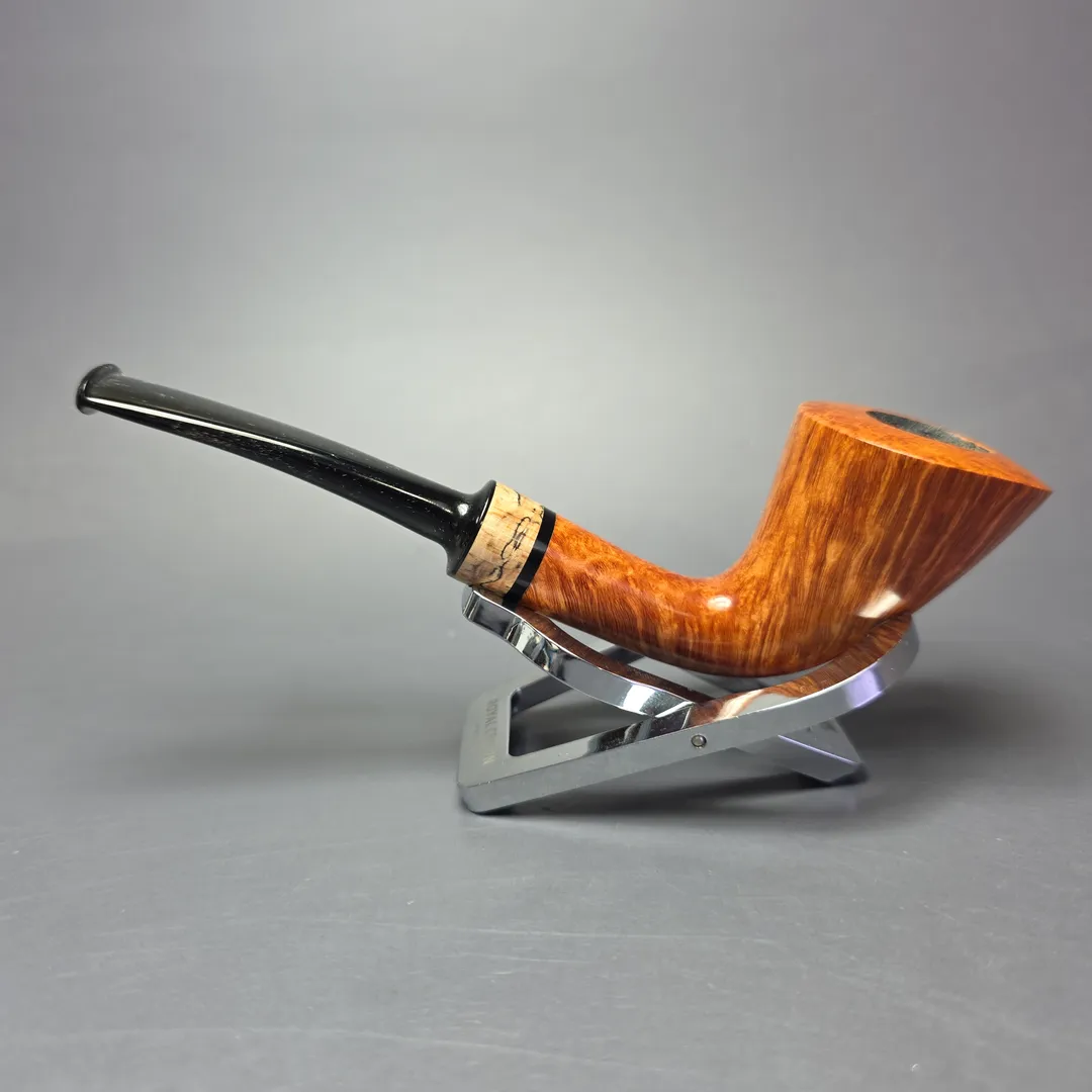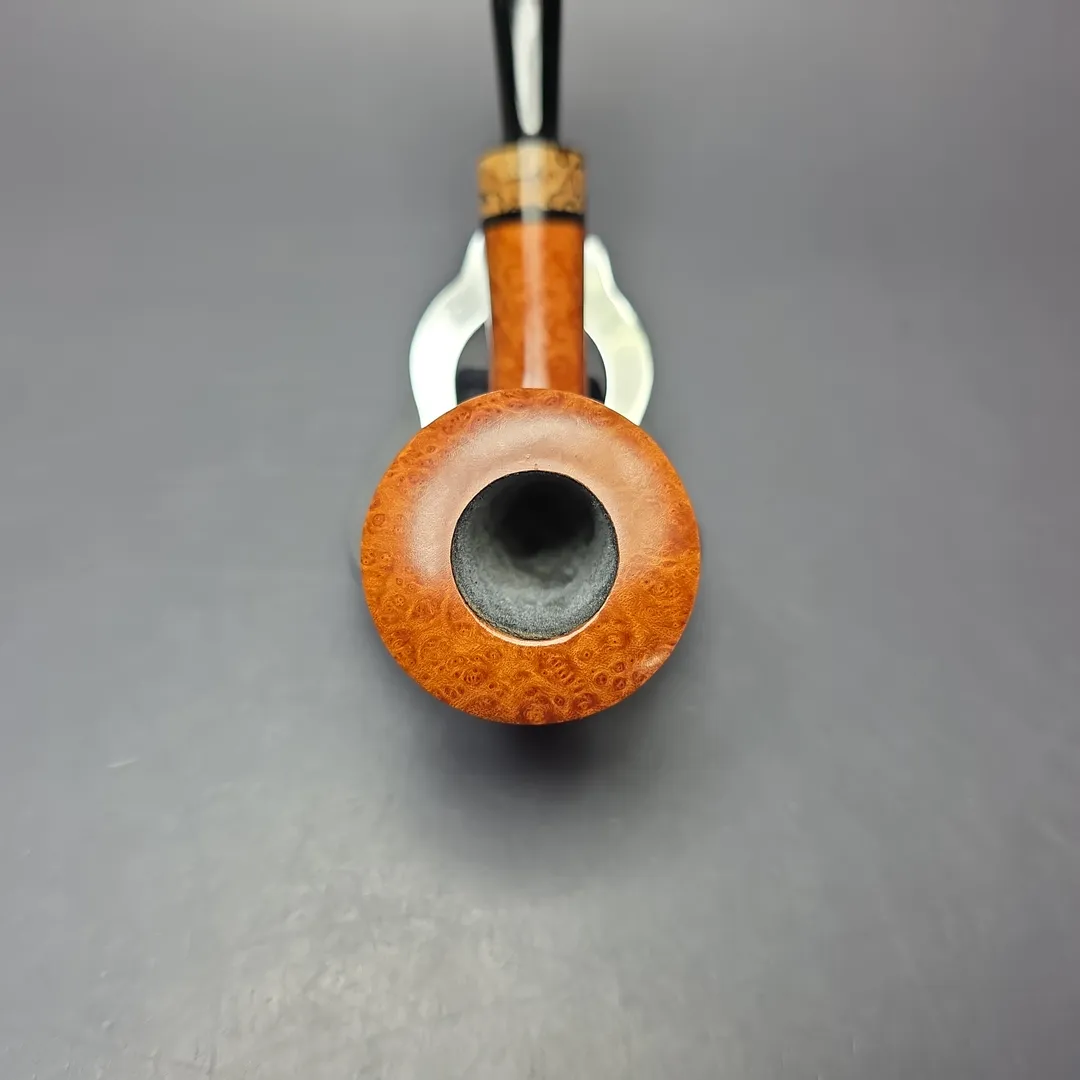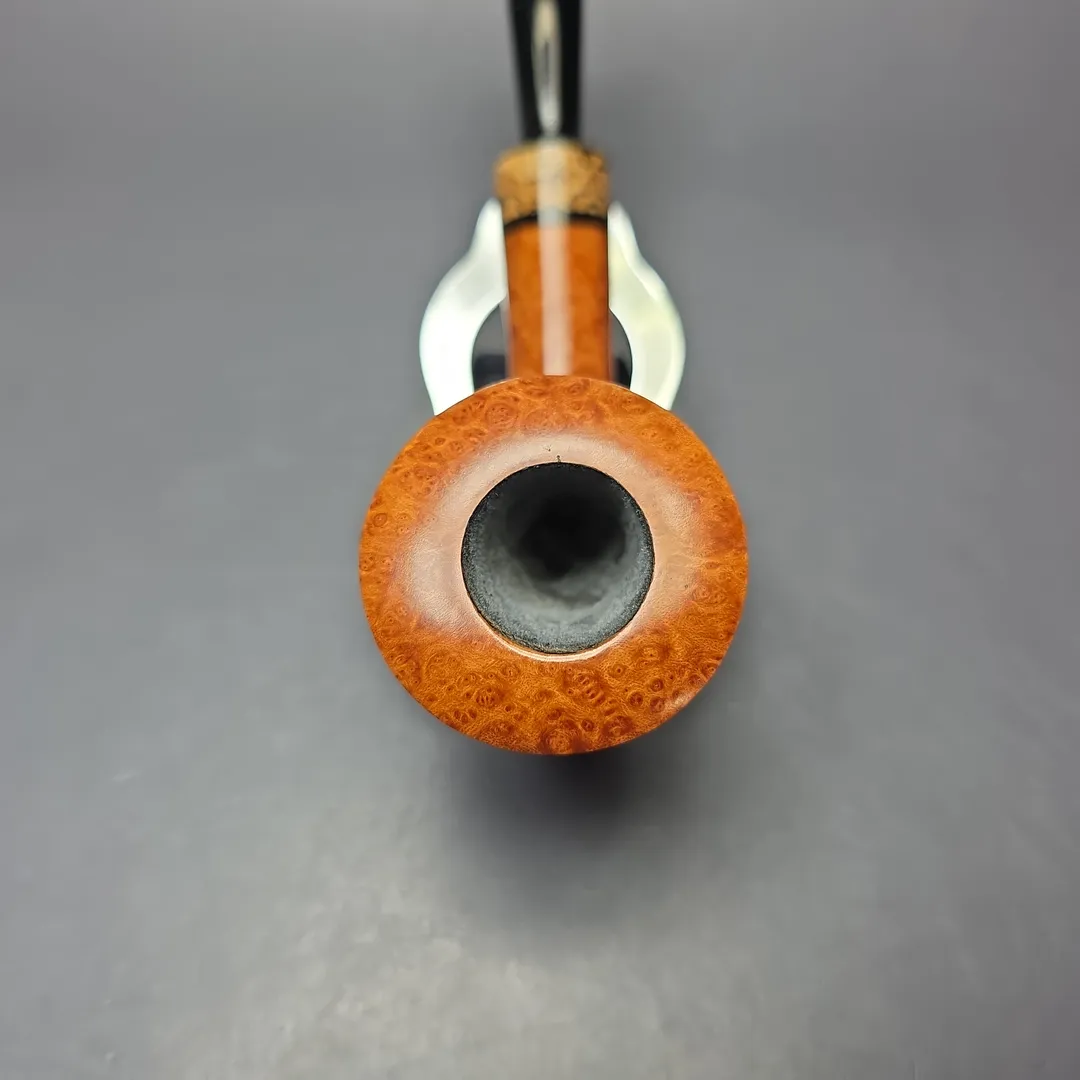 Having studied with masters from both France and Denmark, it is only natural that Bruno Nuttens’s work would feature both distinctly French and distinctly Danish designs and influences. Perhaps most interesting, however, is that Nuttens’s pipes frequently blend elements from both traditions. In this latest batch, for example, we’ve seen a traditional bent billiard with an extra dash of Gert Holbek to it, as well as one of Nuttens’s signature “Twiggy” Dublins. And we’ve also had two pipes like this one, one being an “A” grade, and the other an “AA” grade (this being the “A” grade). The design is another signature Dublin rendition in Nuttens’s portfolio, and one that recalls, in equal parts, the Dublins of Nuttens’s former teachers Pierre Morel Jr and Tom Eltang. With its wide, trumpeting bowl and lightweight stature, there’s plenty of the functionalist approach of Eltang et al. to its construction, though in dress it’s far closer to the fineries and finishing found on the pipes of Morel Jr. Interestingly, the finery itself on this pipe comes in the form of a spalted beechwood accent that, true to his locally-sourced, hands-on approach, was harvested by Nuttens from a forest close to his home.