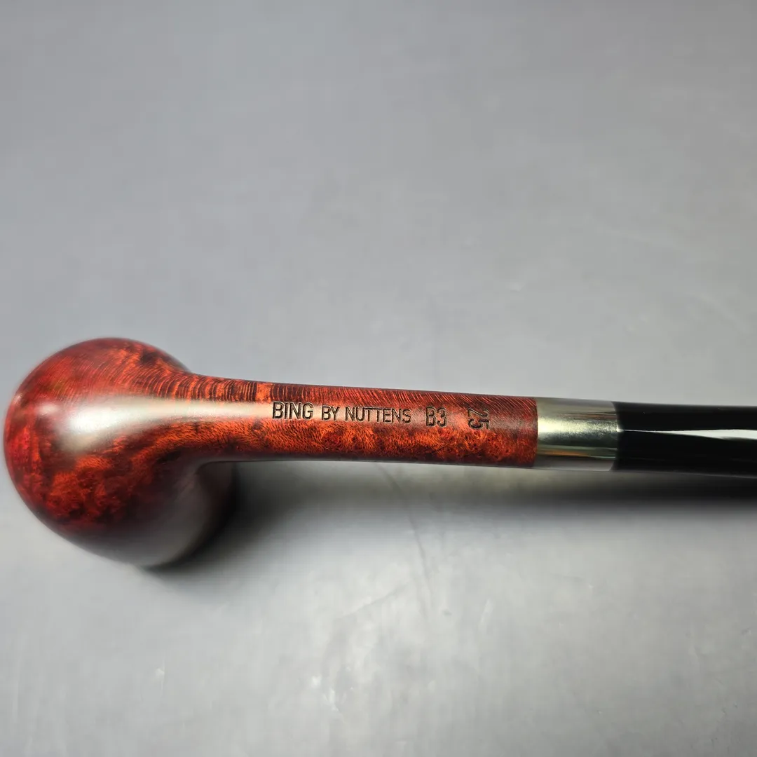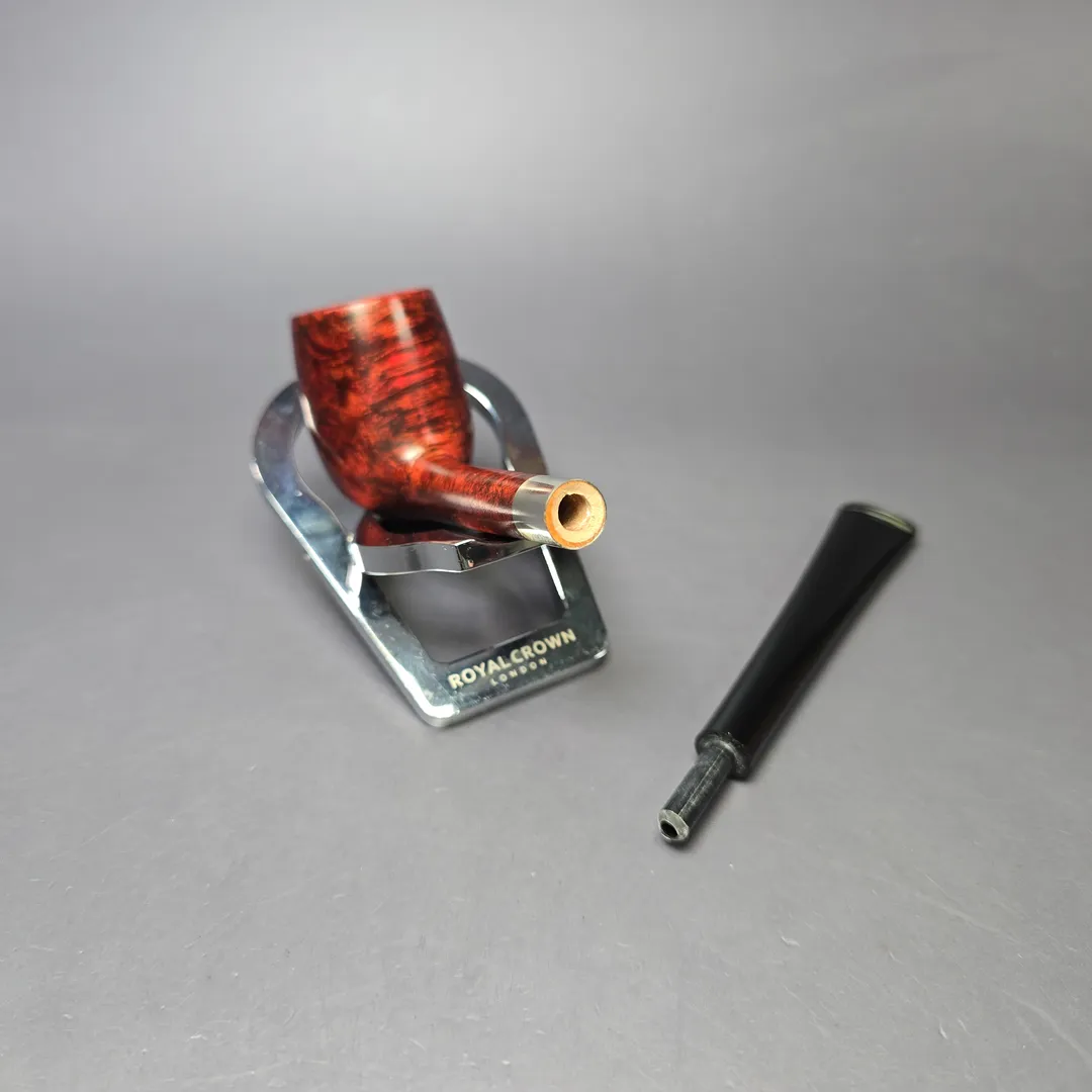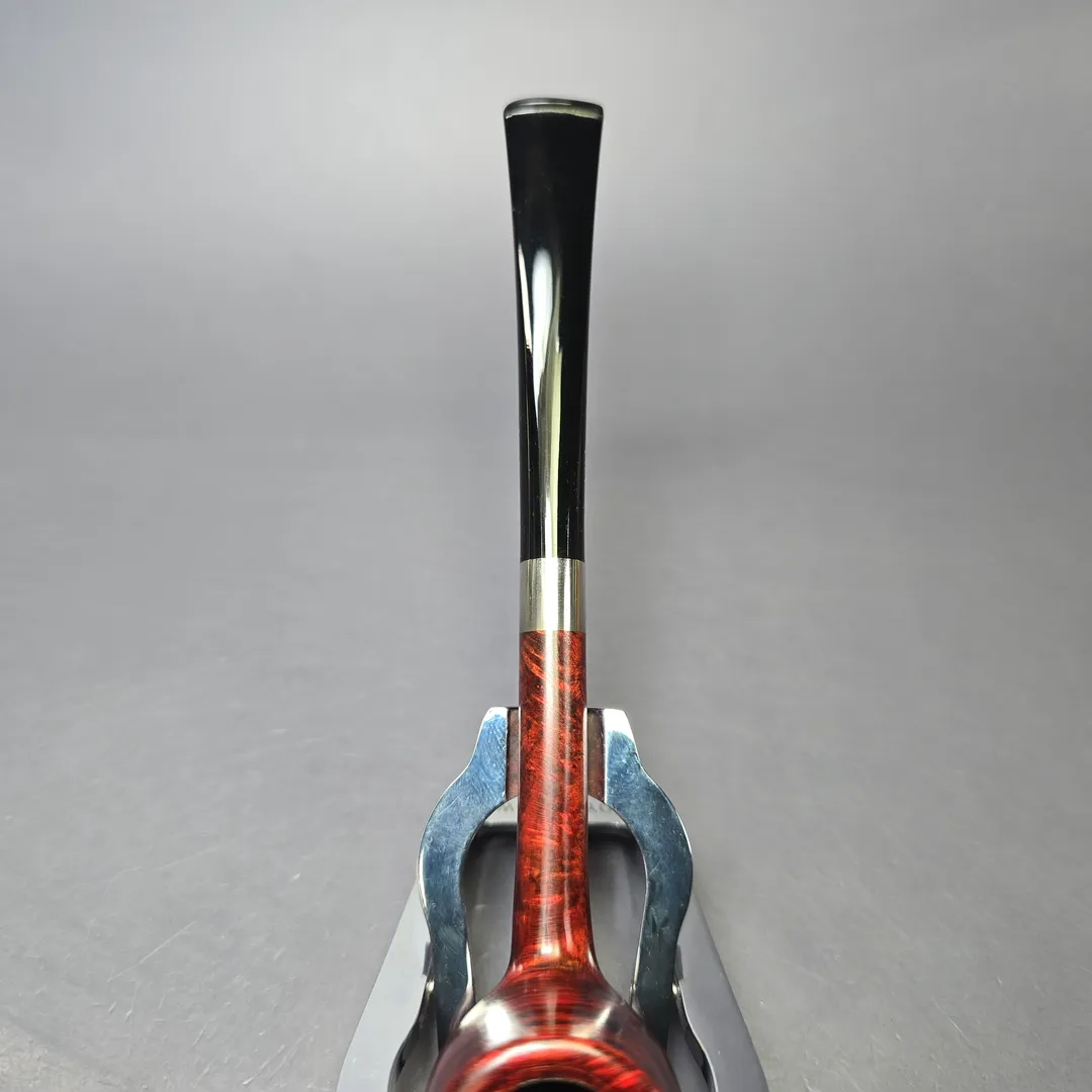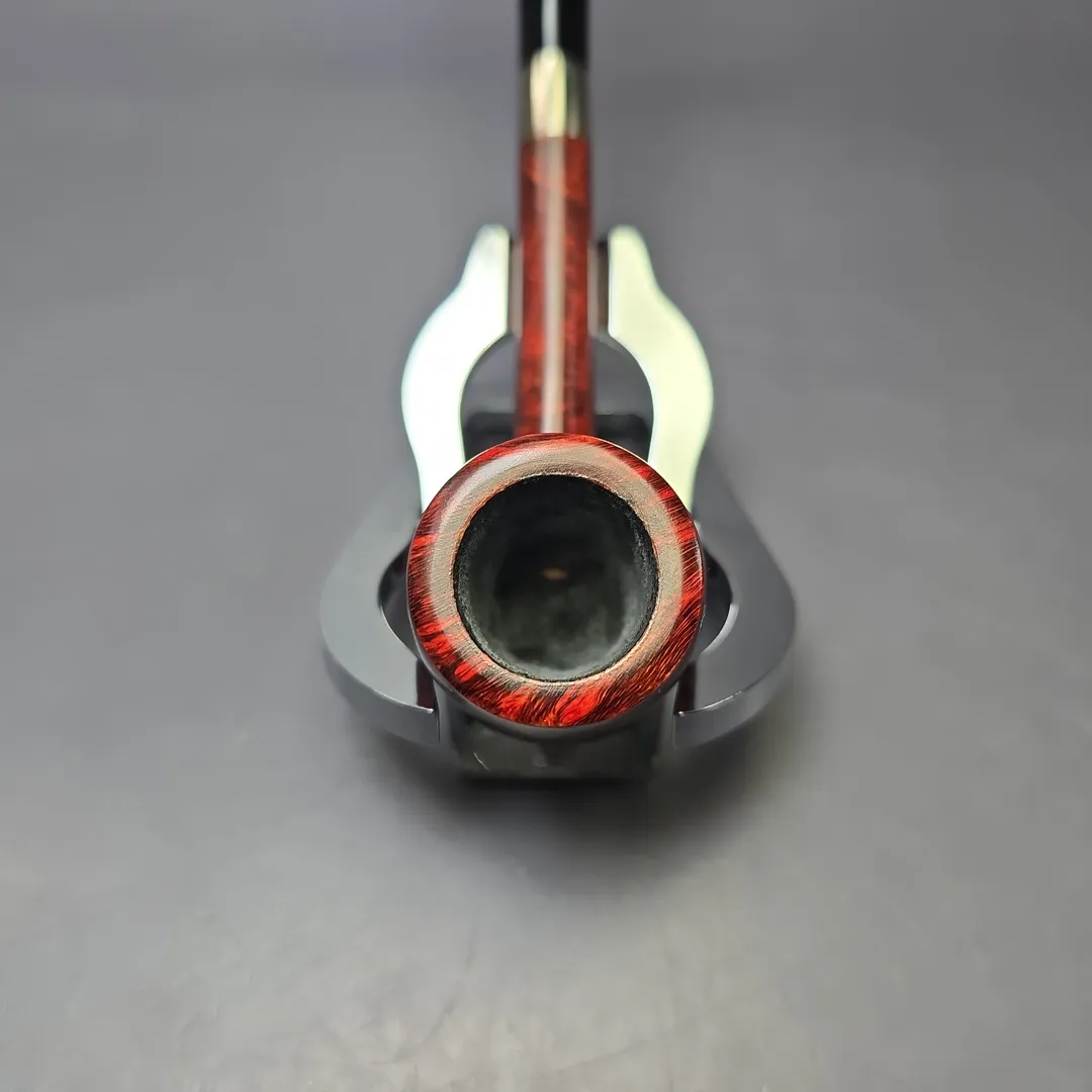 After the immense success of his Bing Crosby inspired billiards, Bruno Nuttens decided to create a series of pipes of the same basic shape, but with slightly scaled down proportions. These would become Nuttens’ “Mini Bing” pipes. The Mini Bing, as seen here, is even more svelte and lightweight than its bigger brother, while still maintaining ample chamber capacity for a good bowl, especially when out on the town. Nuttens’s grading system for his Bing and Heritage pipes goes, in ascending order of quality, from 1-4, with this ruby-red Mini Bing attaining an impressive grade 3.