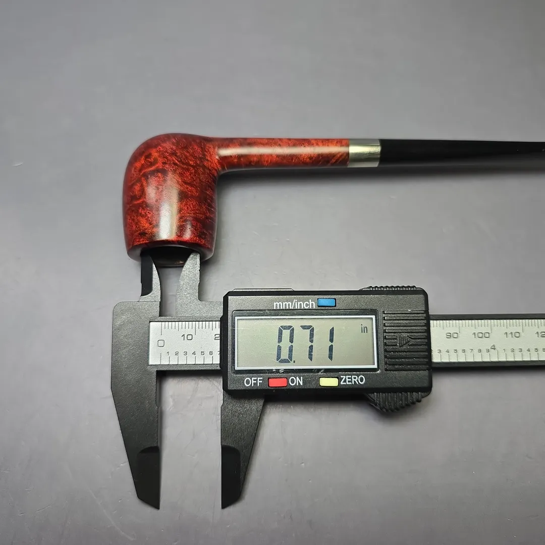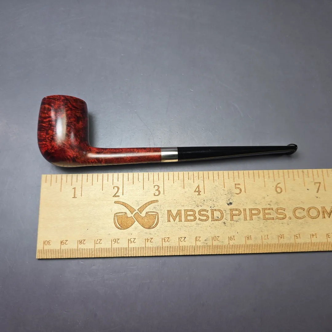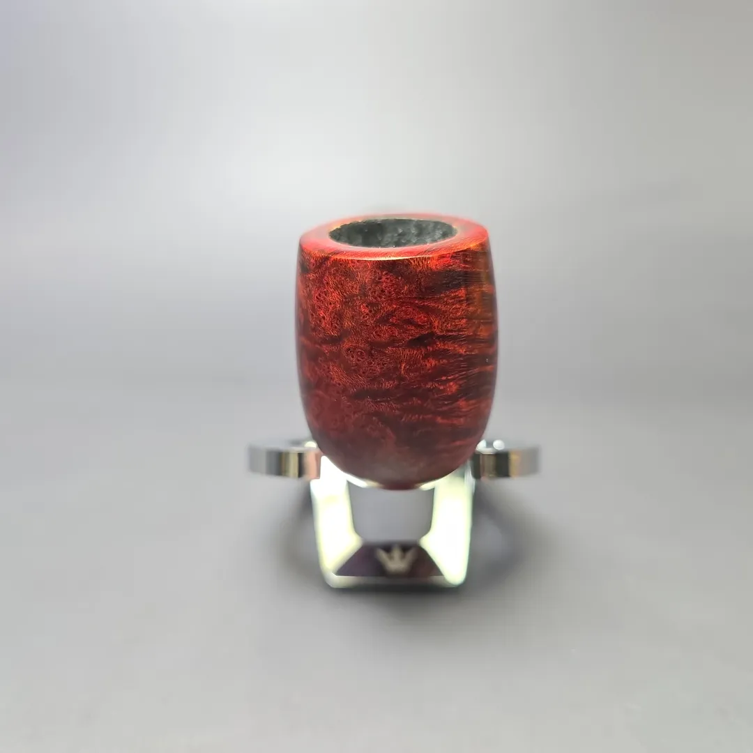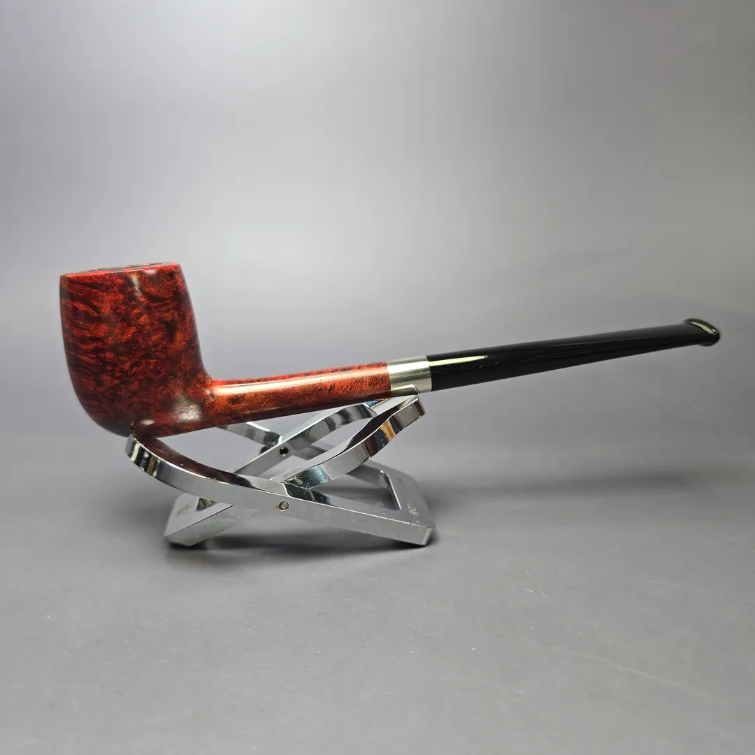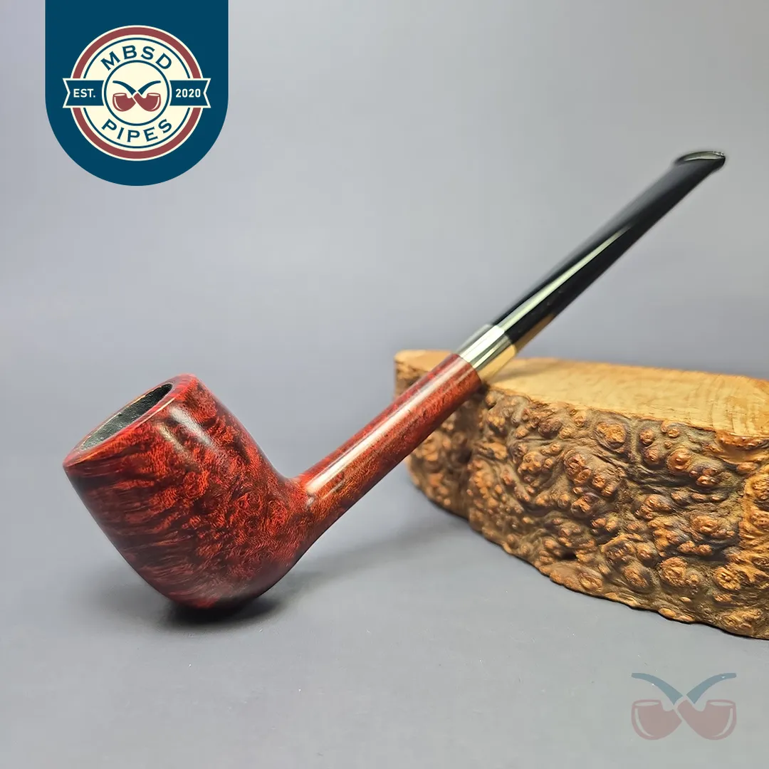 After the immense success of his Bing Crosby inspired billiards, Bruno Nuttens decided to create a series of pipes of the same basic shape, but with slightly scaled down proportions. These would become Nuttens’ “Mini Bing” pipes. The Mini Bing, as seen here, is even more svelte and lightweight than its bigger brother, while still maintaining ample chamber capacity for a good bowl, especially when out on the town. Nuttens’s grading system for his Bing and Heritage pipes goes, in ascending order of quality, from 1-4, with this ruby-red Mini Bing attaining an impressive grade 3.