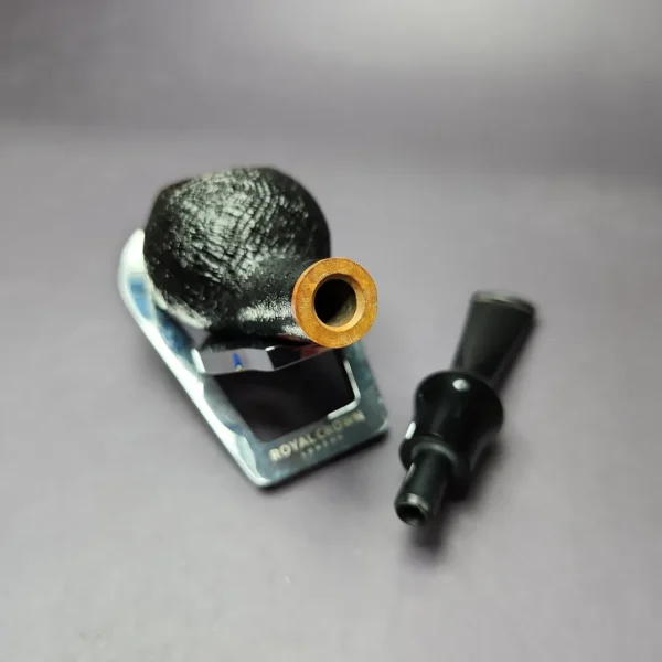 Buckeye pipes are made in the workshop of Premal Chheda. Chheda is a long-established master in the American artisan scene, but his impact extends far beyond Chheda pipes. This is because he’s also one of America’s most prolific teachers in high-grade, artisan pipe making, having mentored figures such as Micah “Yeti” Cryder, Bill Shalosky, and Jesse Jones. Buckeye pipes are one of the many fruits of Chheda’s endeavors as a teacher. They are made by his students and offered both as an affordable example of high quality, handmade pipes, and as a means of supporting the artisans who make them. This one is a classic, American-style squat tomato, with a crisp black sandblast and flared acrylic stem.