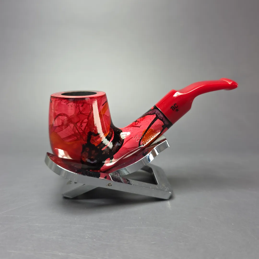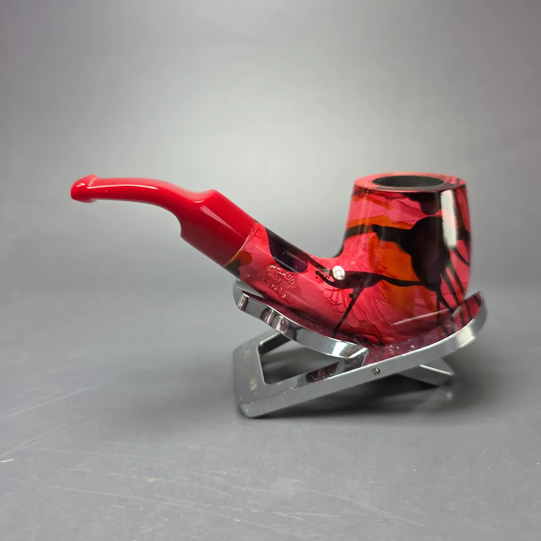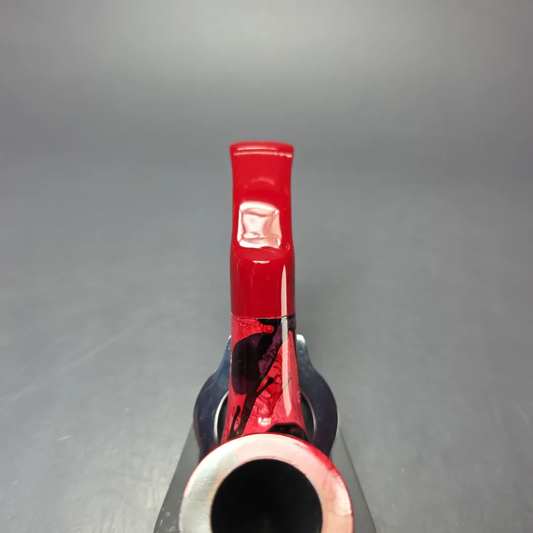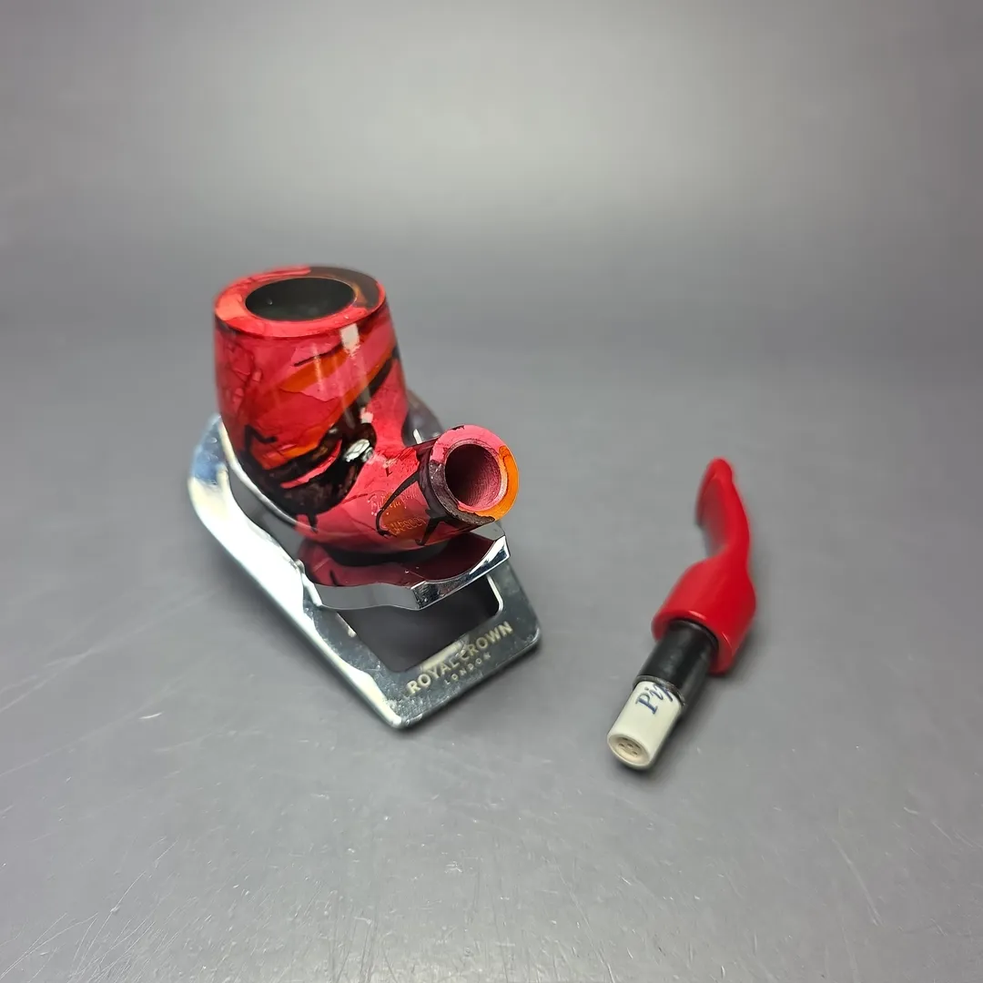 Like the Danish pipe makers, the French also had a genre of so-called “Fancy” pipes, though the term meant something quite different for either. In Denmark, “Fancy” originally meant “modern,” but in the sense of unorthodox, freehand forms; in France, the “Fancy,” or “Fancy Bruyere,” also referred to novel designs, but the focus was on finishes. Fancy bruyeres wore unusually colorful, painted finishes, ones that were often very striking, and even psychedelic at times. This nosewarmer-length Butz-Choquin is an example of such, with a rather avant-garde aesthetic that I would imagine was achieved through immersion printing (at least, in part). These days, the Fancy Bruyere is more of a “retro” thing, with pipes like this one being increasingly difficult to locate.