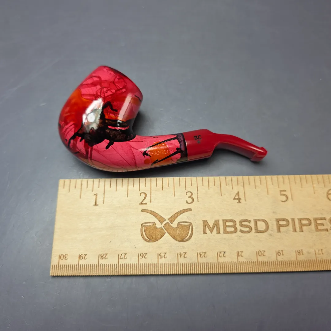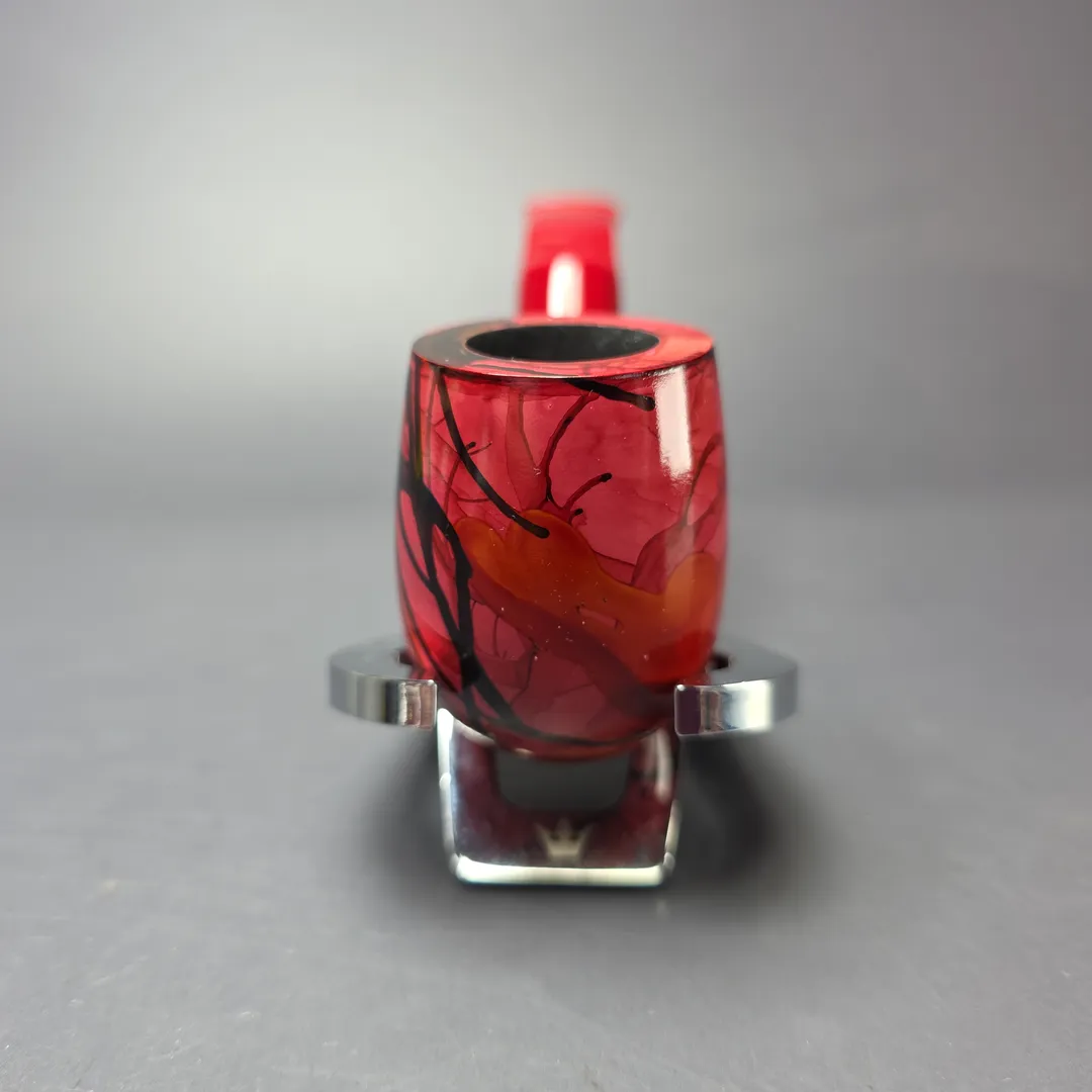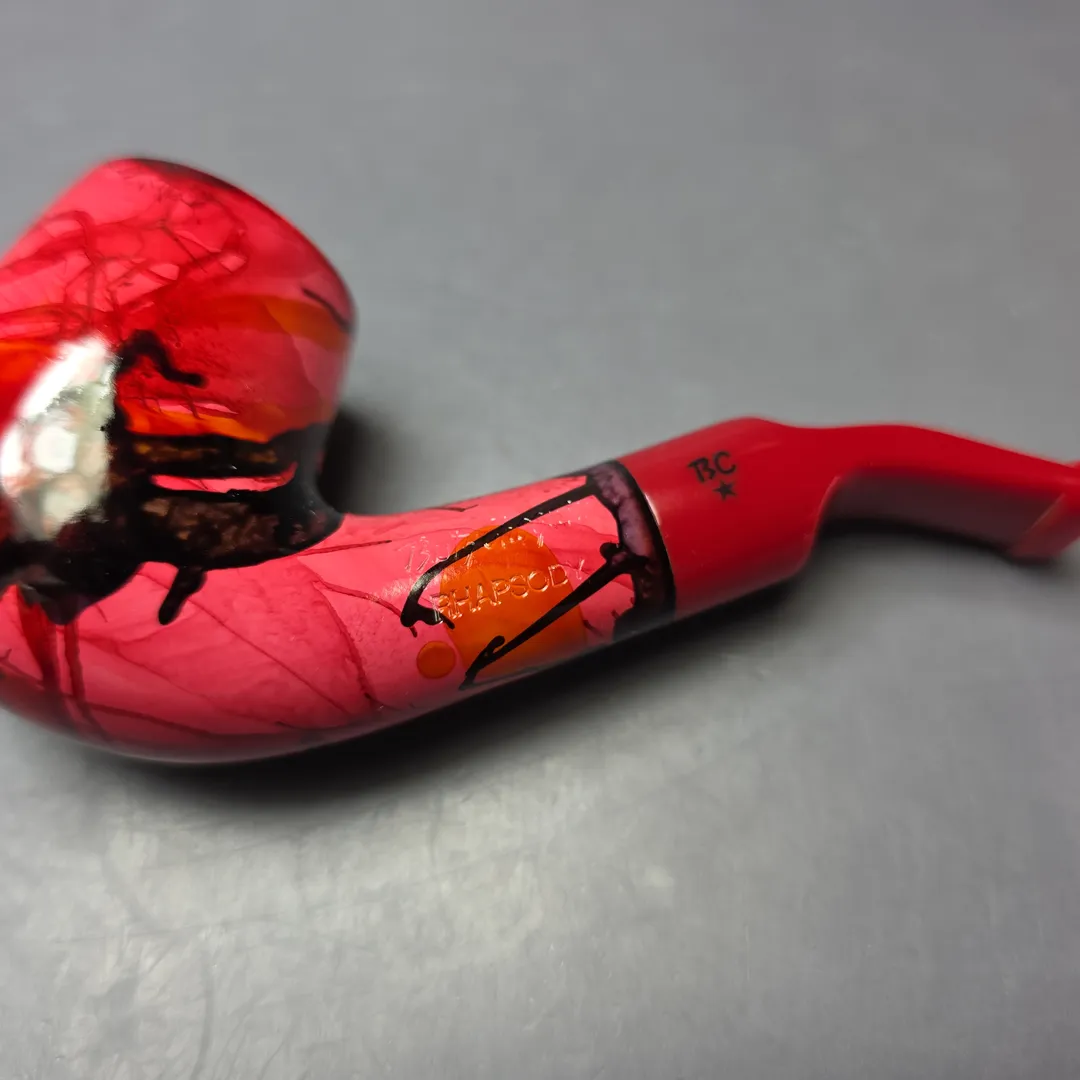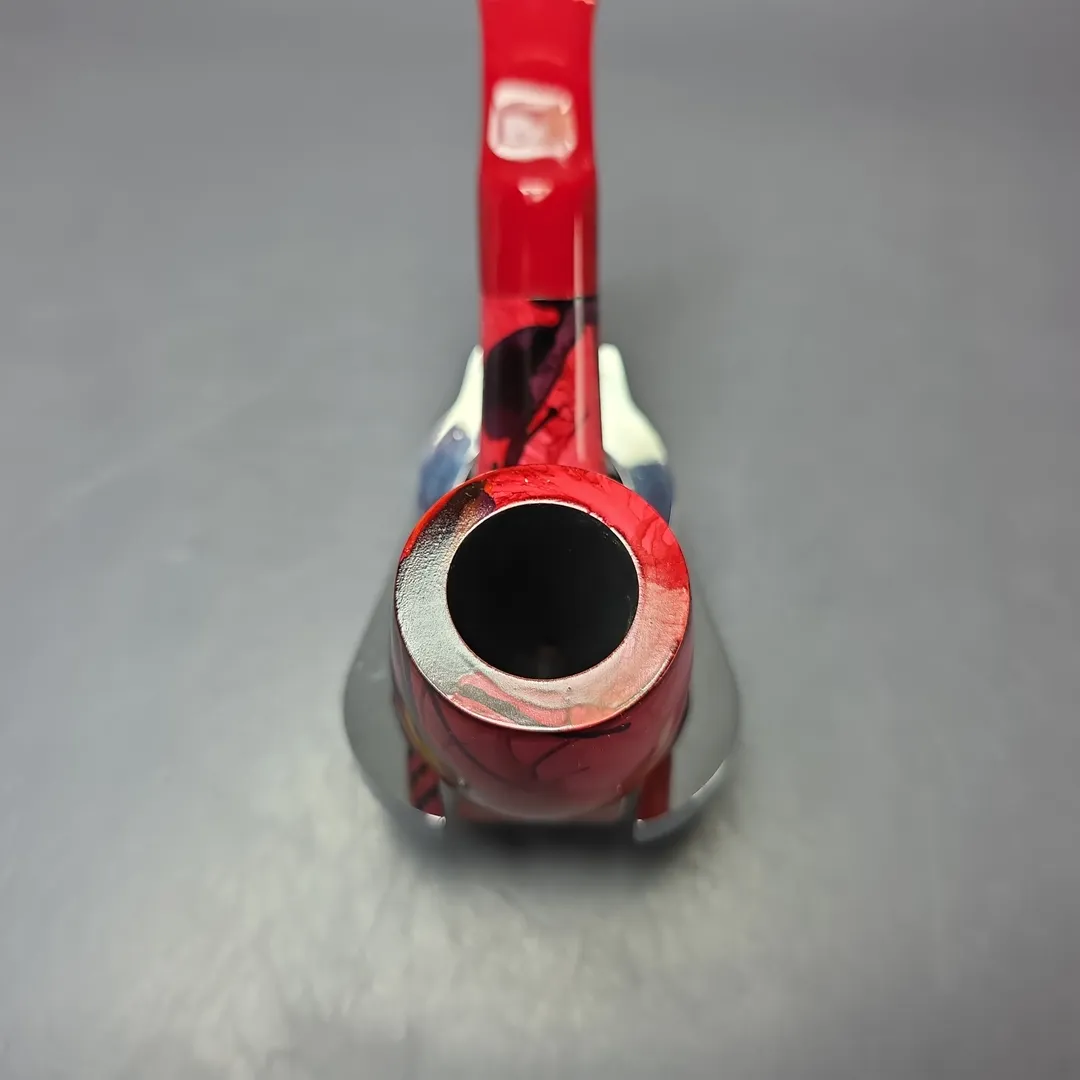 Like the Danish pipe makers, the French also had a genre of so-called “Fancy” pipes, though the term meant something quite different for either. In Denmark, “Fancy” originally meant “modern,” but in the sense of unorthodox, freehand forms; in France, the “Fancy,” or “Fancy Bruyere,” also referred to novel designs, but the focus was on finishes. Fancy bruyeres wore unusually colorful, painted finishes, ones that were often very striking, and even psychedelic at times. This nosewarmer-length Butz-Choquin is an example of such, with a rather avant-garde aesthetic that I would imagine was achieved through immersion printing (at least, in part). These days, the Fancy Bruyere is more of a “retro” thing, with pipes like this one being increasingly difficult to locate.