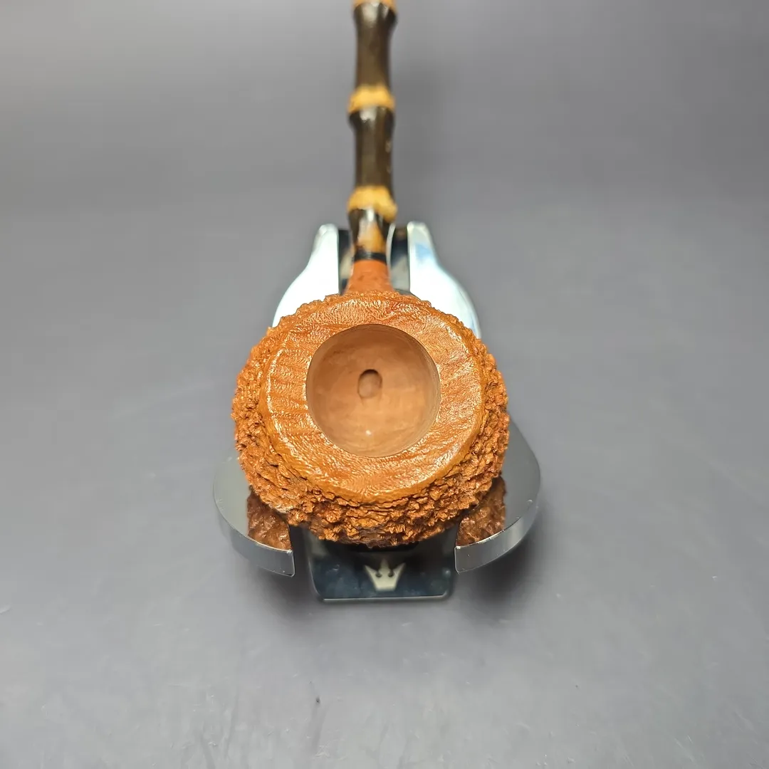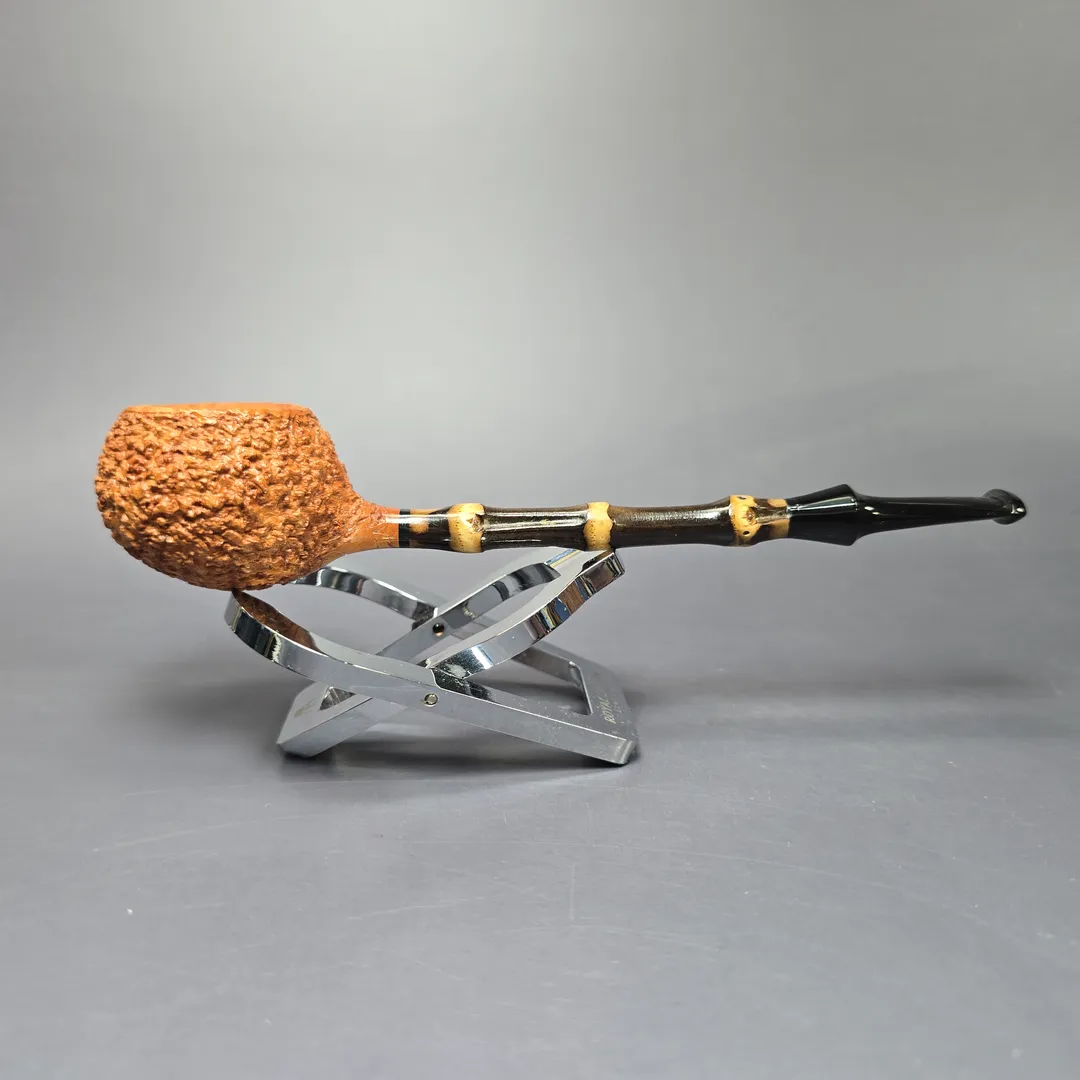 While difficult to work with, bamboo has many advantages when it comes to pipe making, not least in its capacity to afford exceedingly lightweight designs. This bamboo prince from C-Pipe is a good example of that affordance in action. Despite being well over 6 inches in length, the pipe is a genuine featherweight, at less than an ounce in weight. In a very interesting move away from convention, the design also incorporates a tactile, Italian-style partial rustication round its bowl, making for a pipe that is equal parts distinctive and ergonomic.