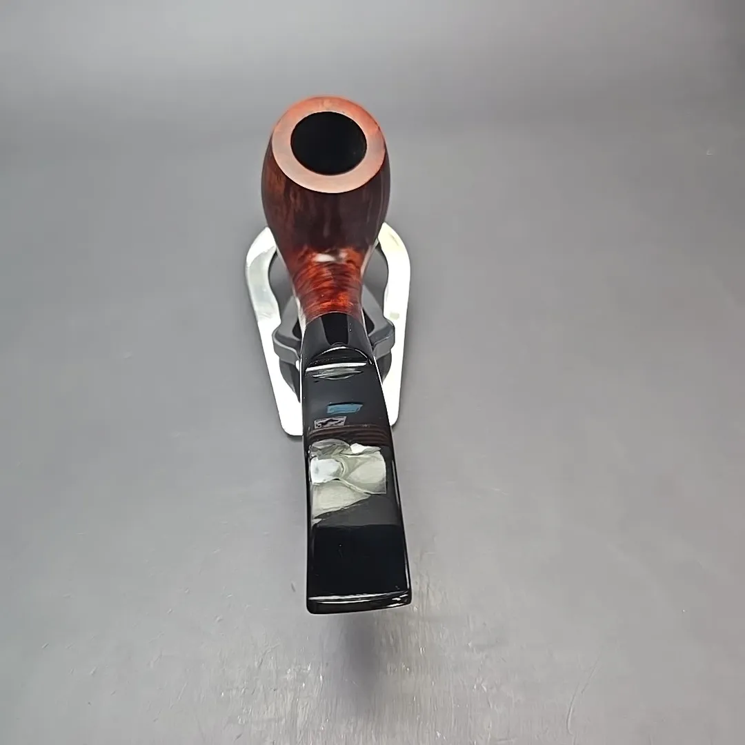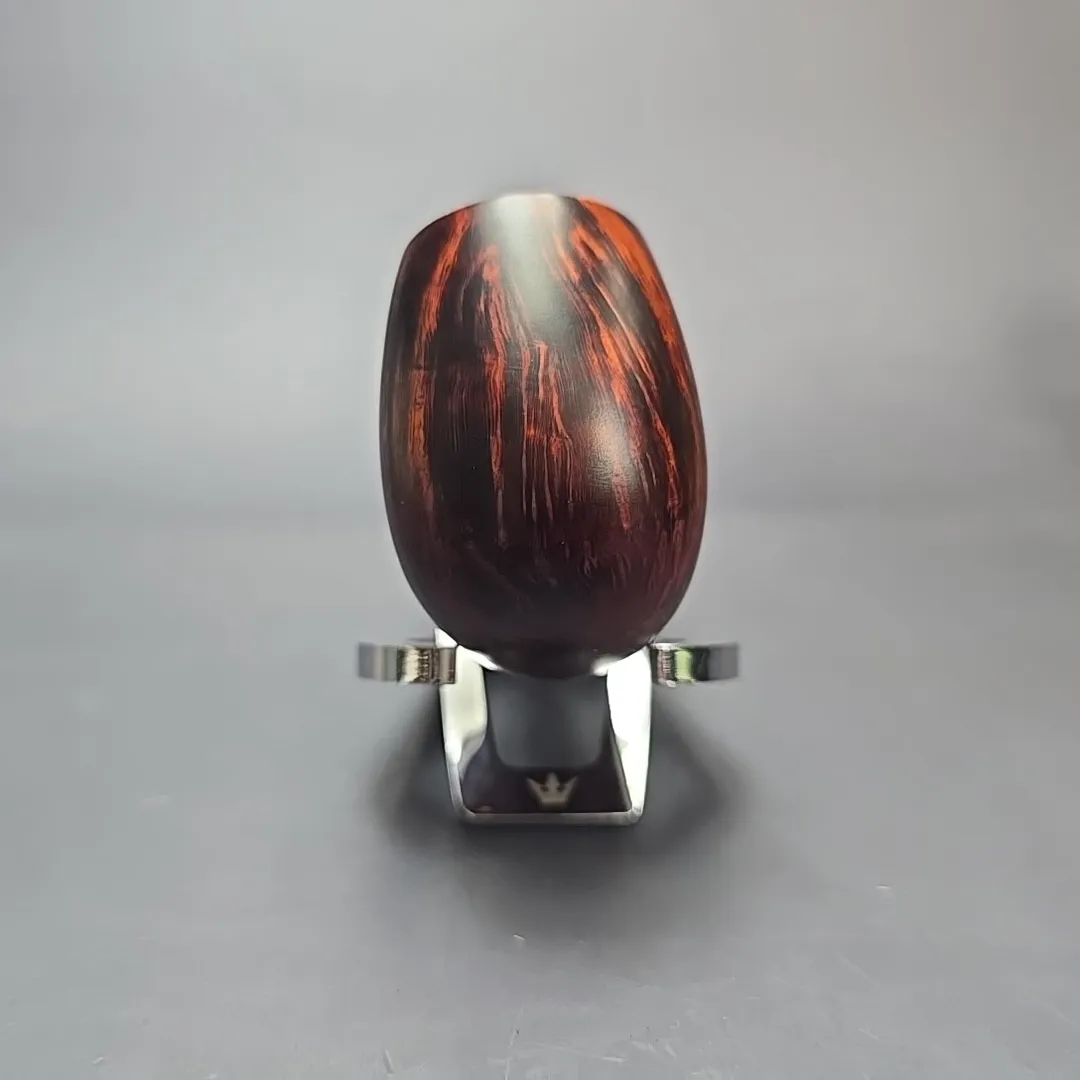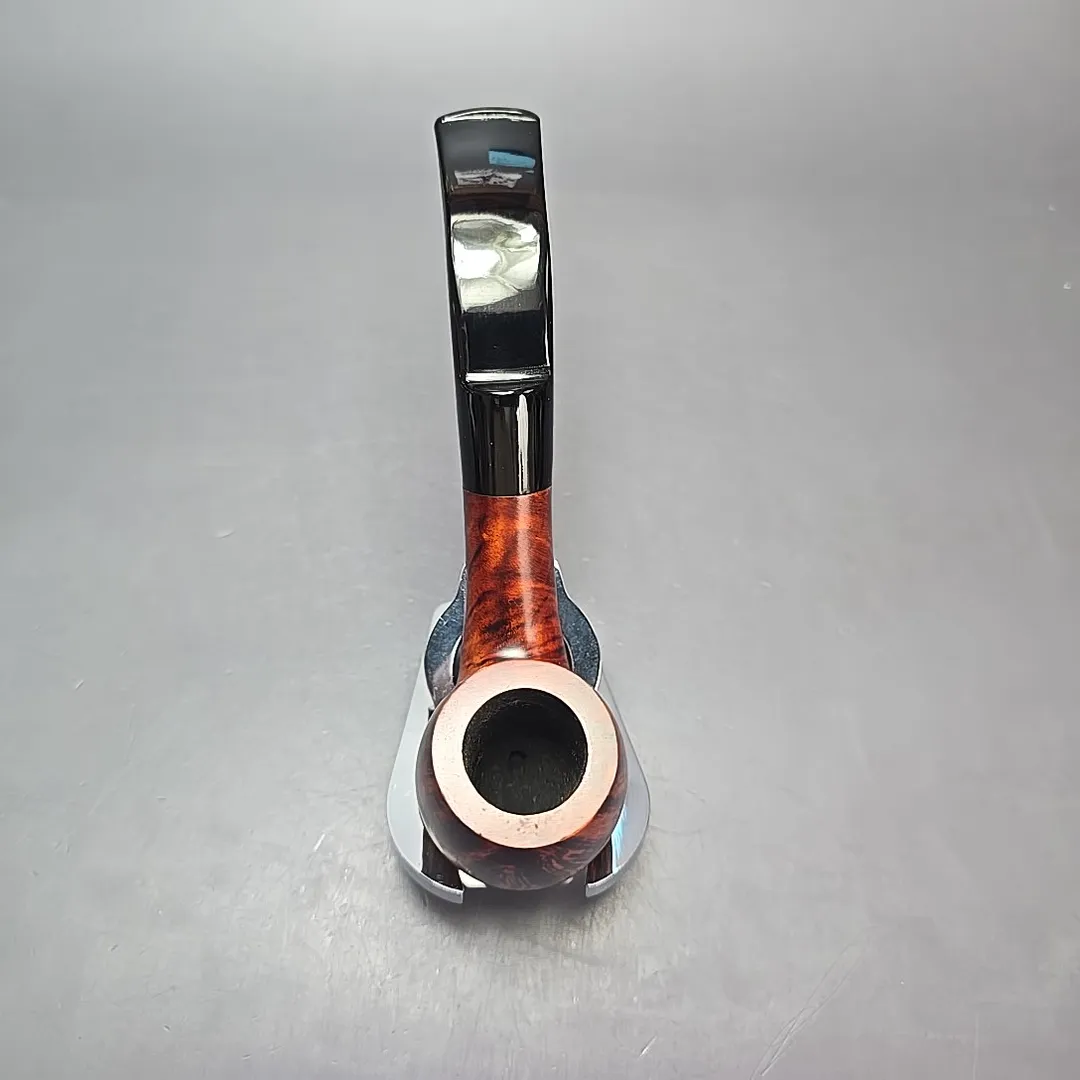 The “107” was one of the larger bent billiards offered by Mastro de Paja’s Calibano make, with proportions nearing that of, say, a group 5 Dunhill of a similar shape. This one is dressed in Calibano’s fiery “C3” finish, which looks to have worked especially nicely with the natural flame grain patterns of its stummel.